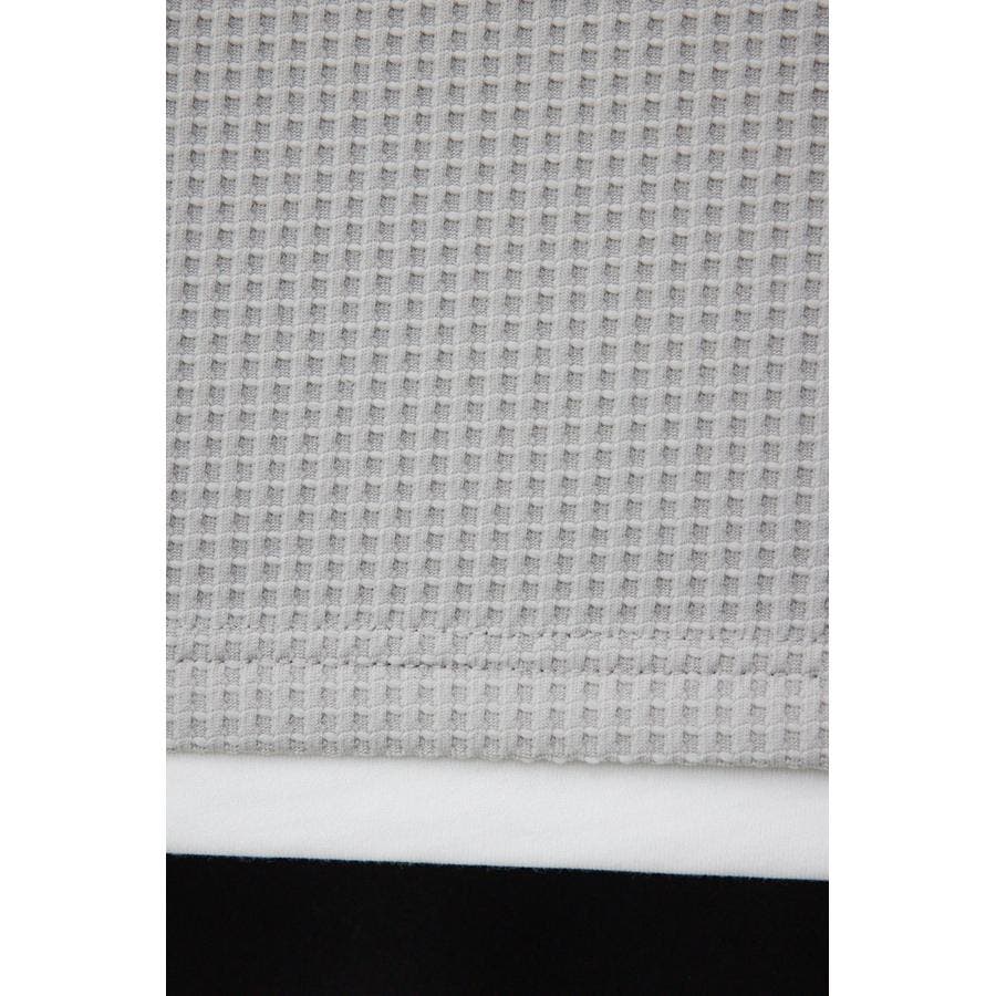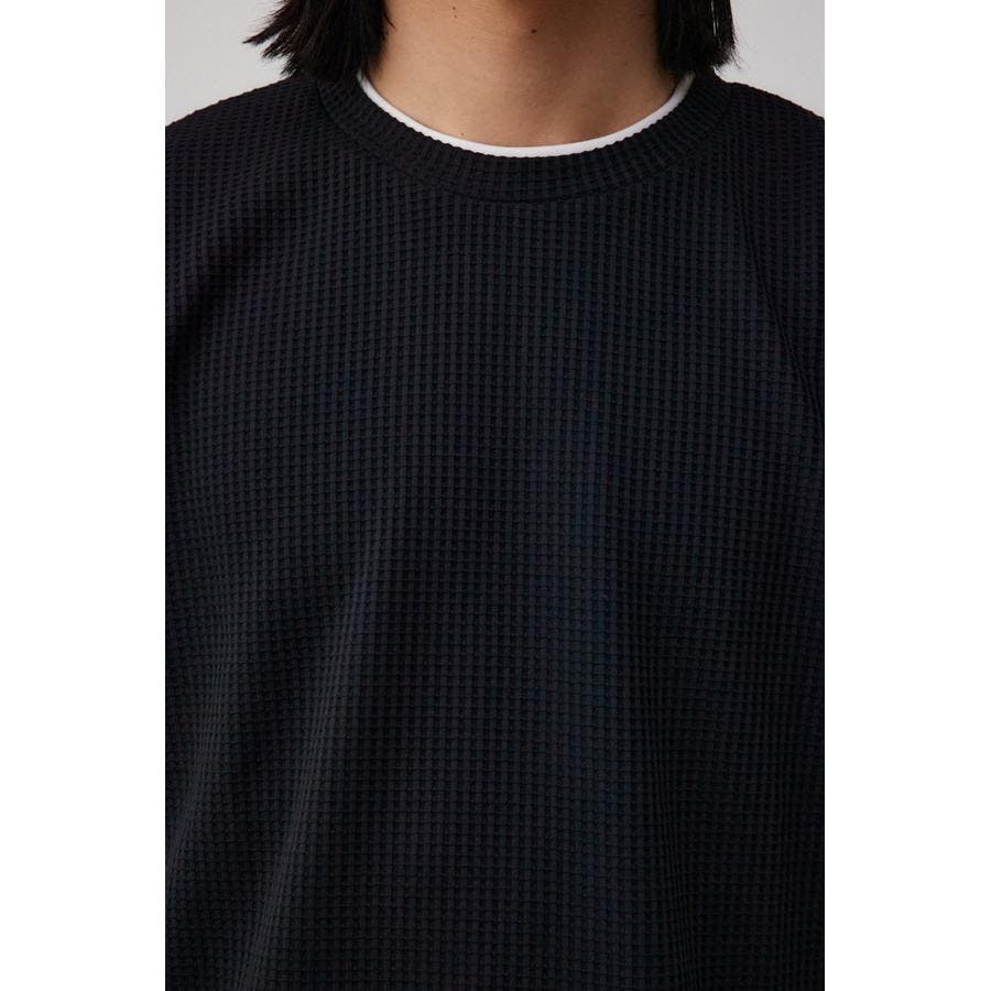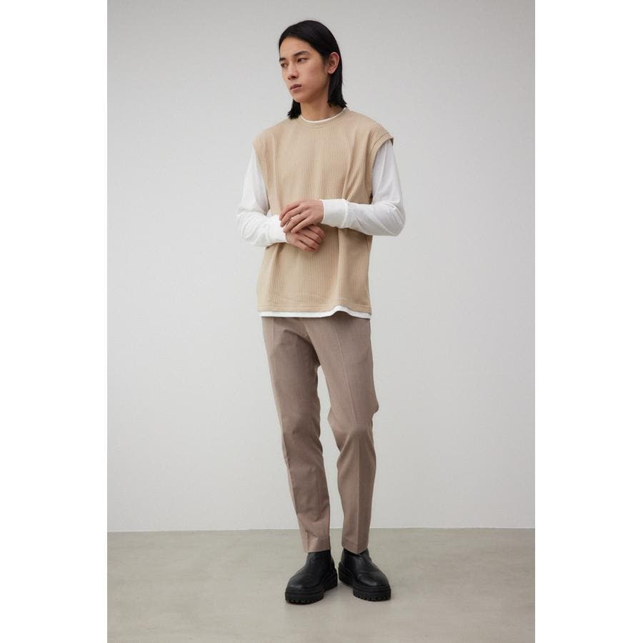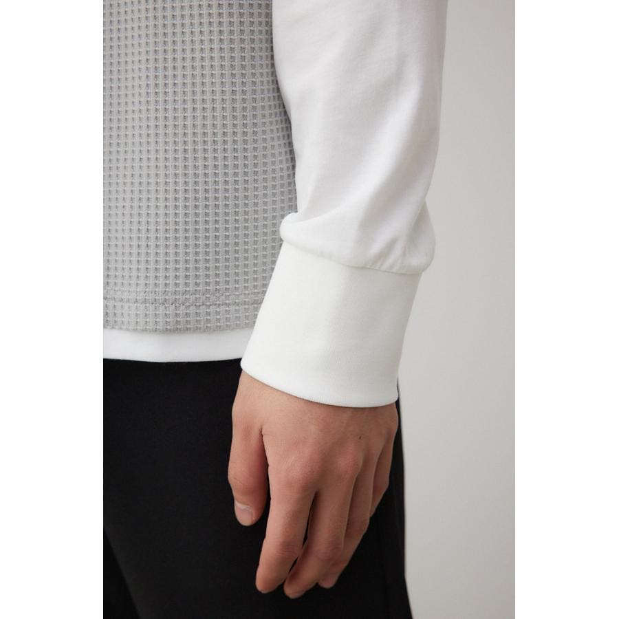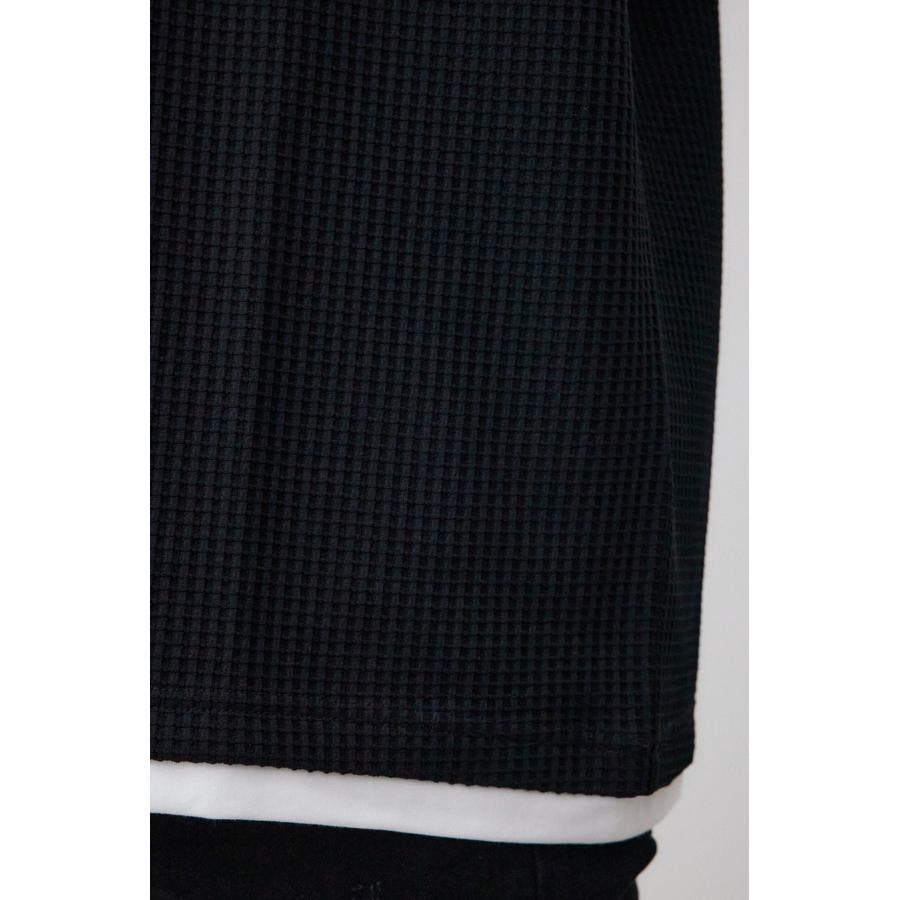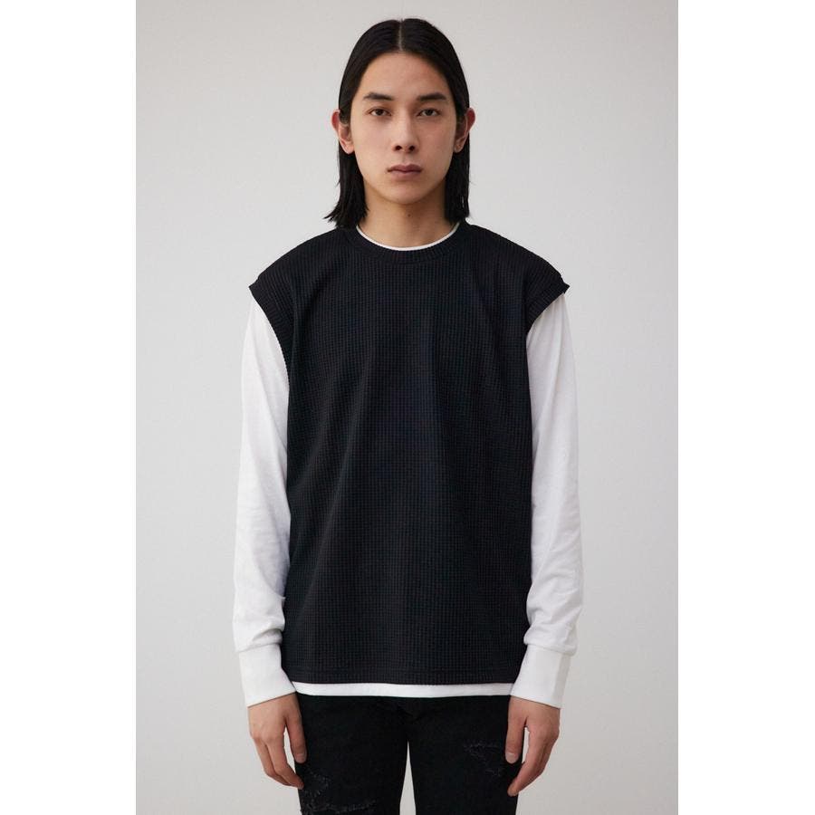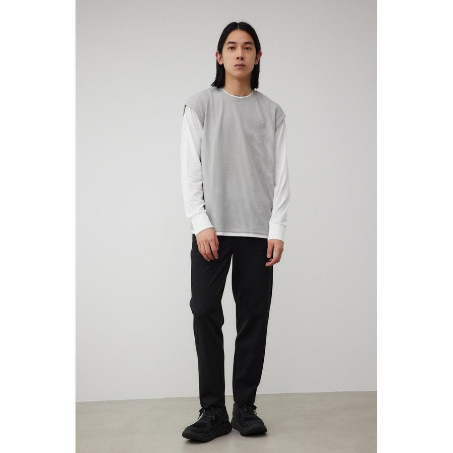 ・身頃のベストがワッフル生地で表面変化を楽しむことができ、袖から出るロンTがこなれ感を演出。