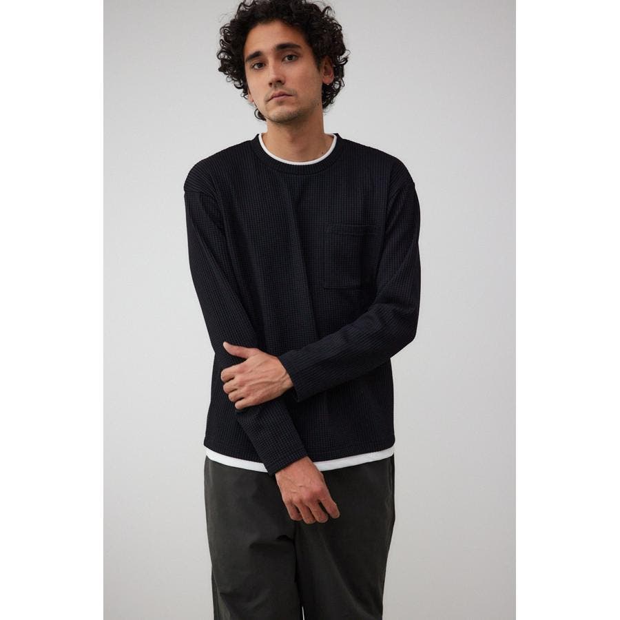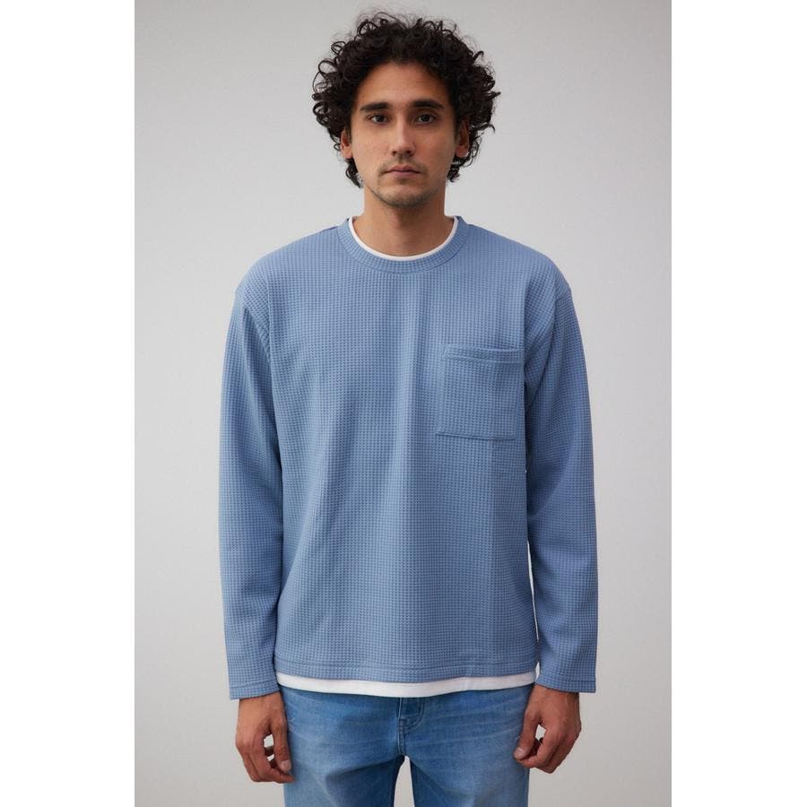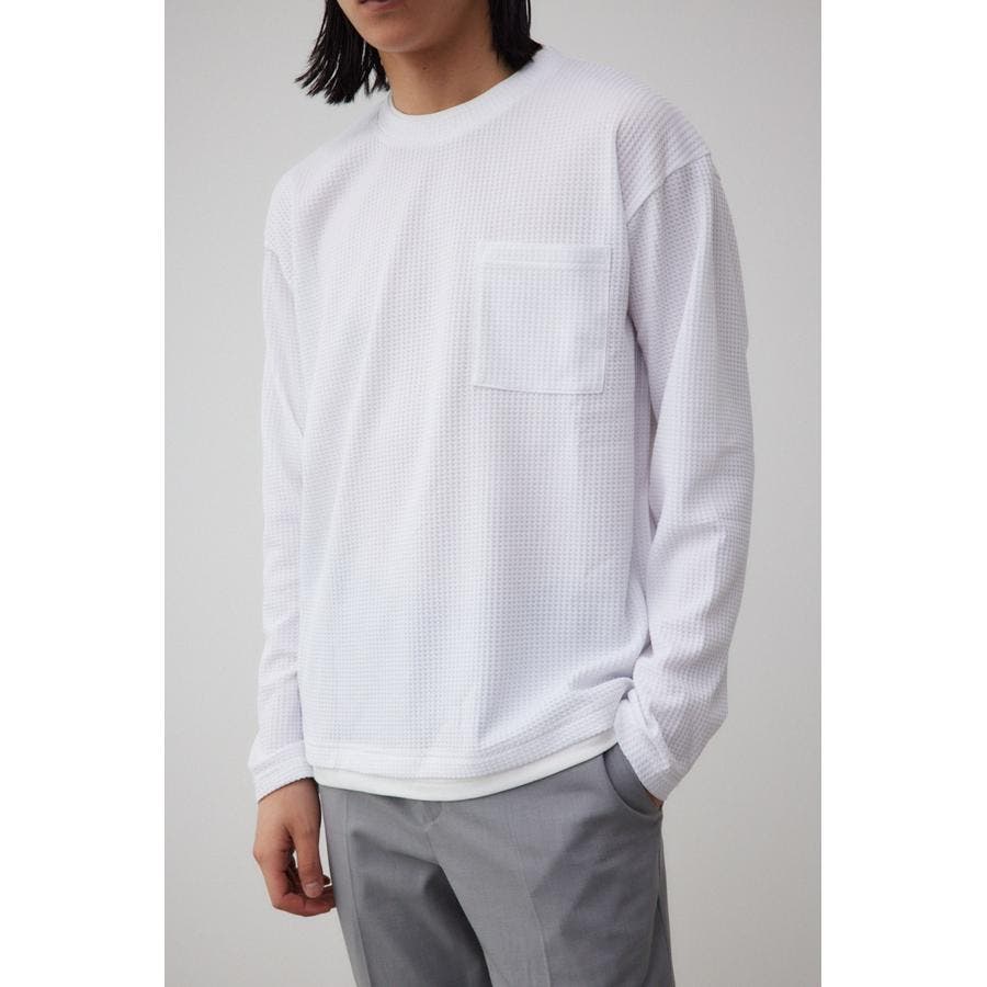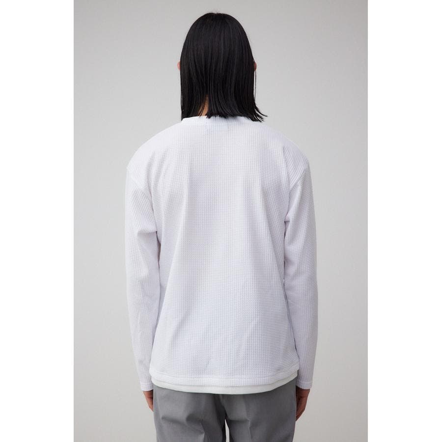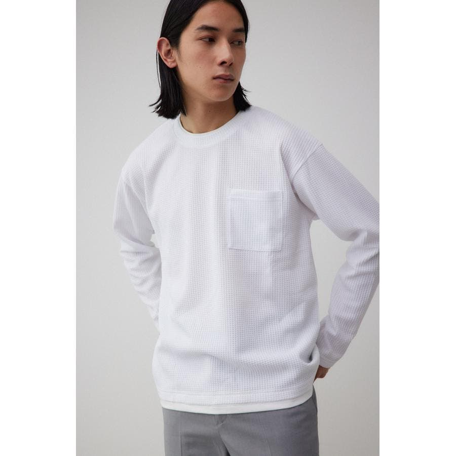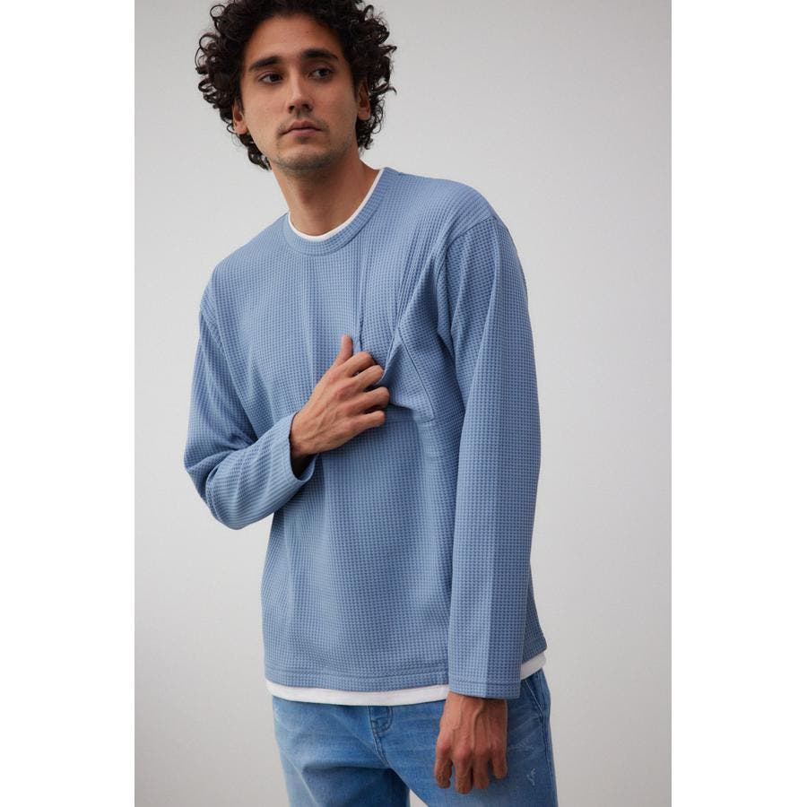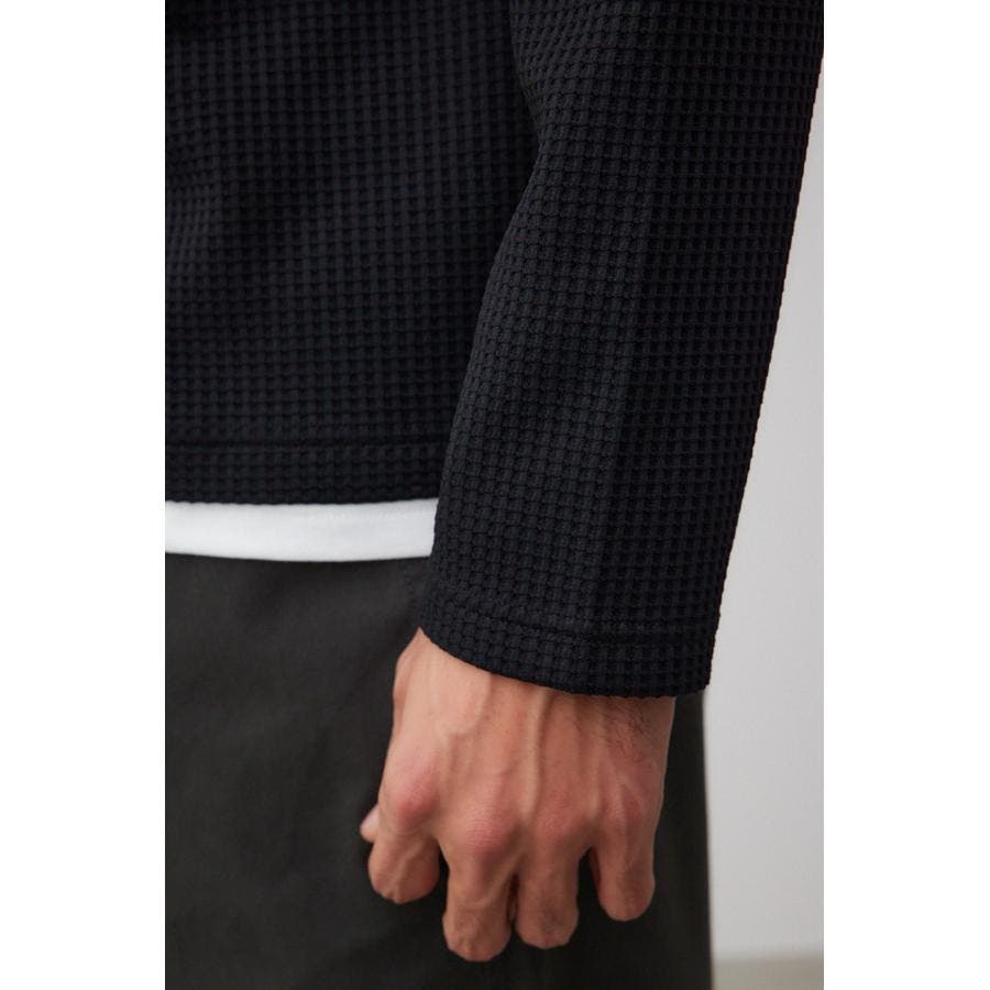 ・身頃がワッフル生地で表面変化を楽しむことができ、襟や裾から出るロンTがこなれ感を演出。