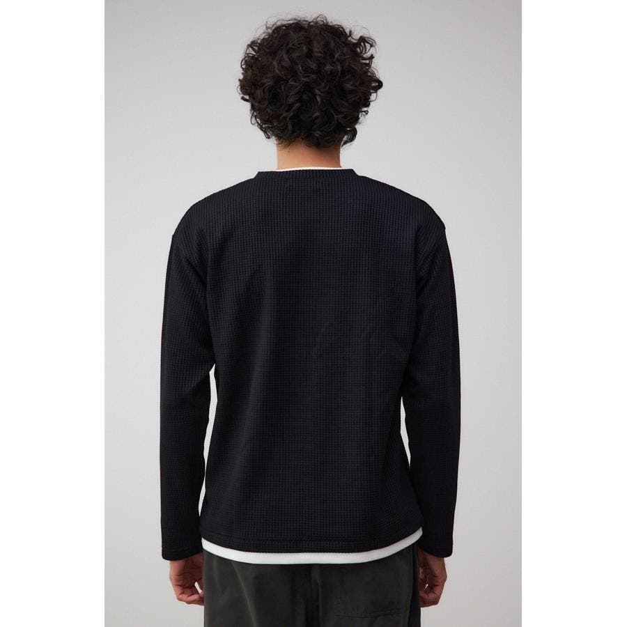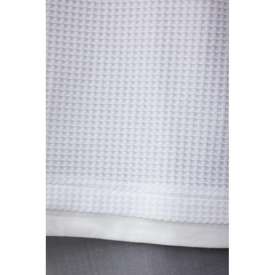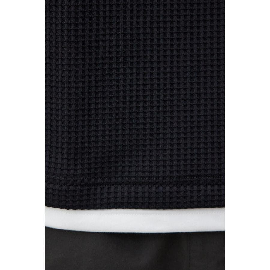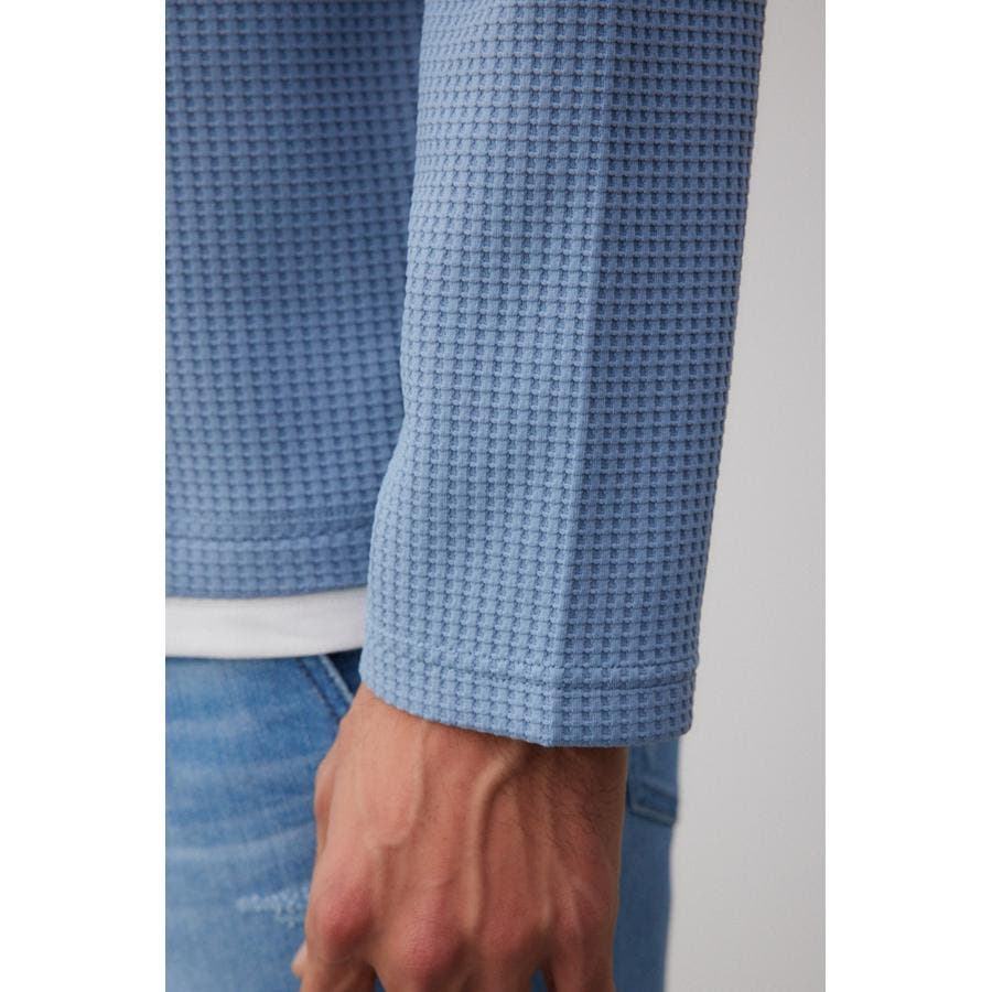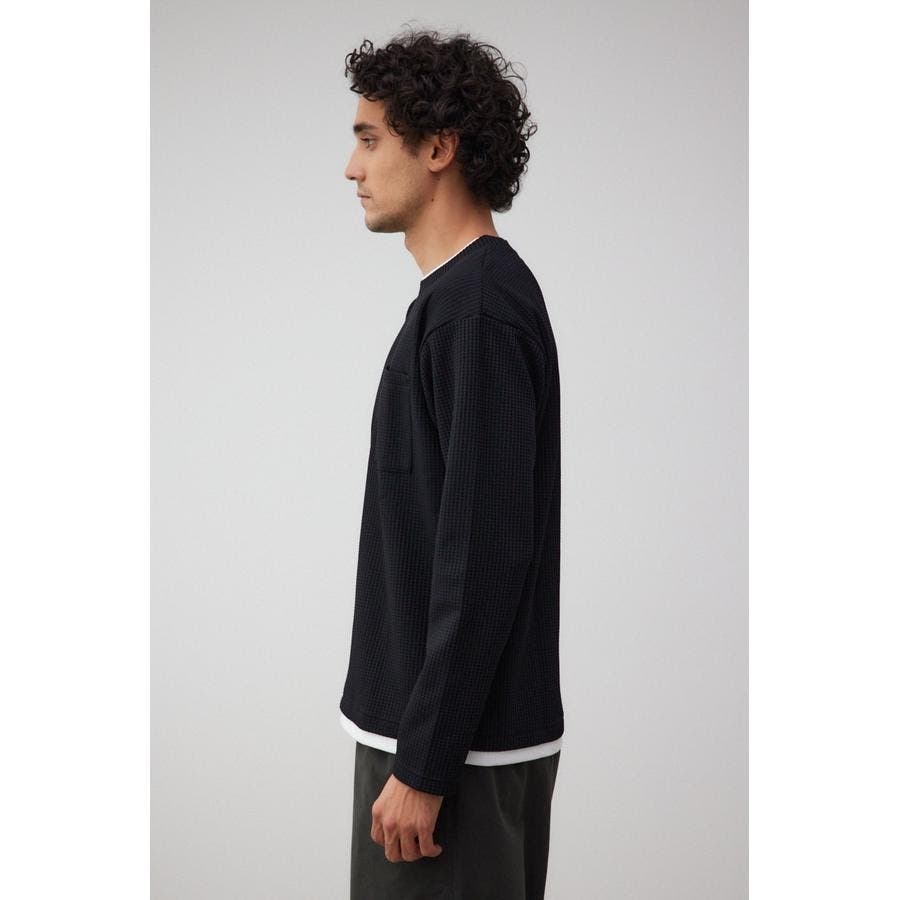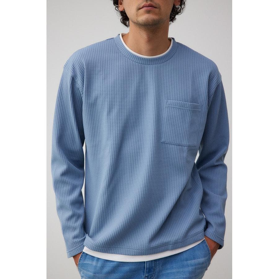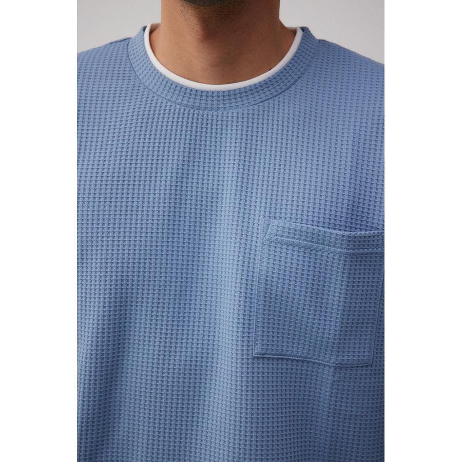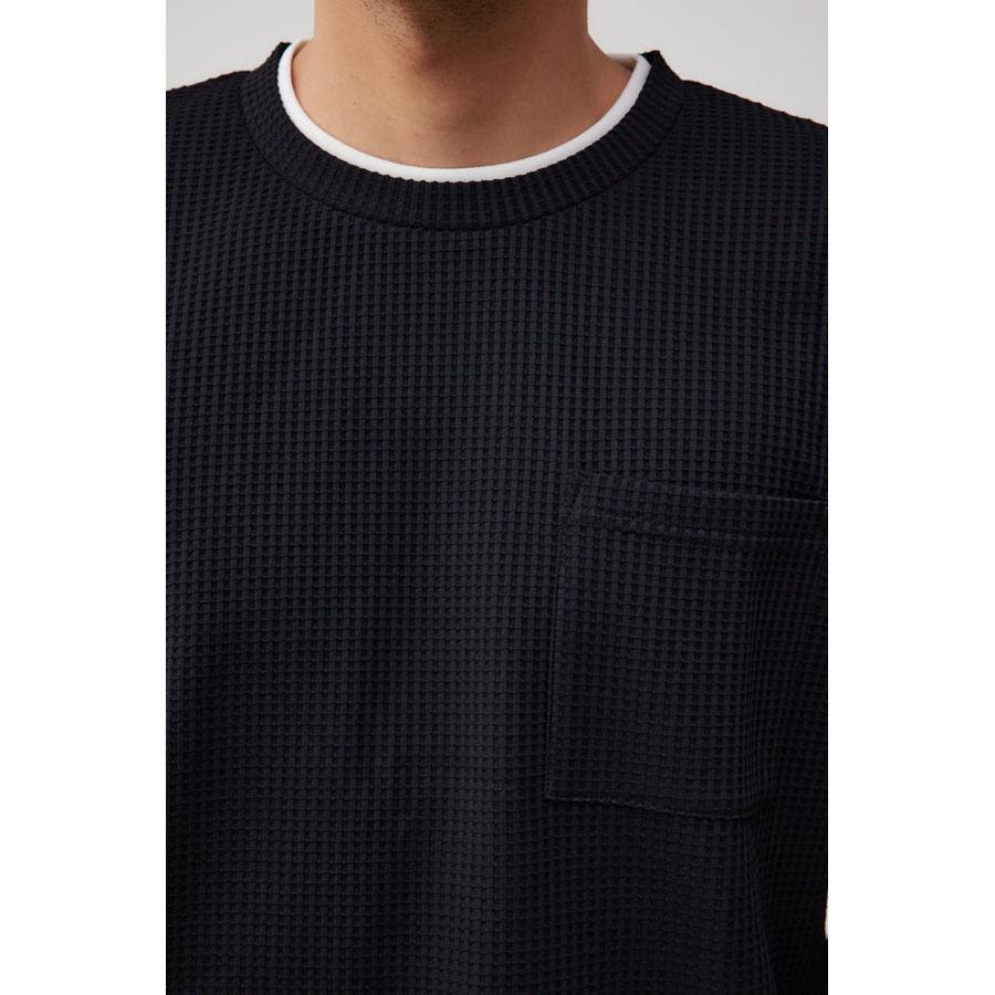 ・身頃がワッフル生地で表面変化を楽しむことができ、襟や裾から出るロンTがこなれ感を演出。