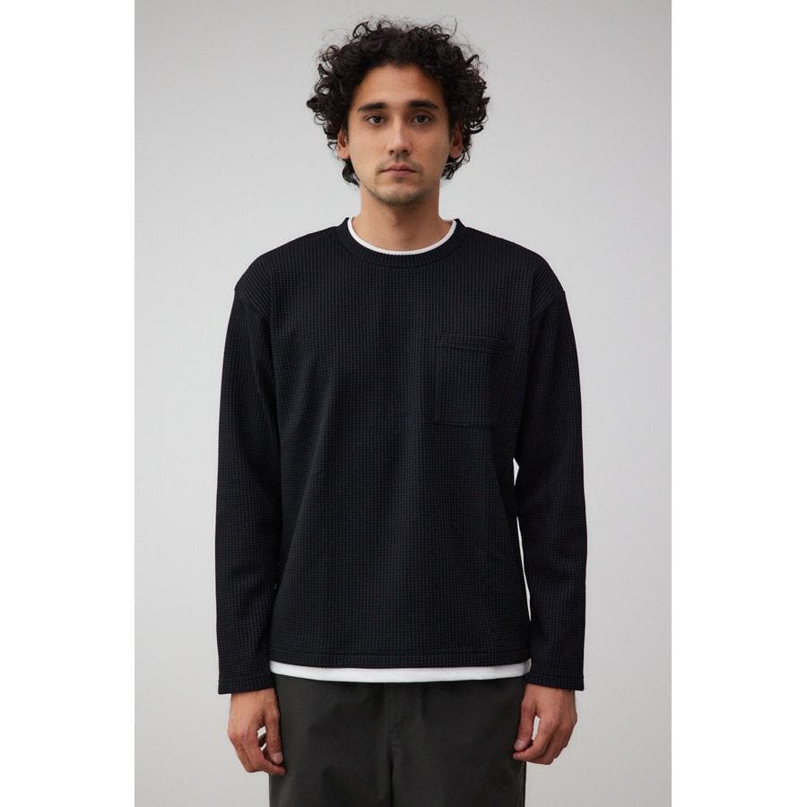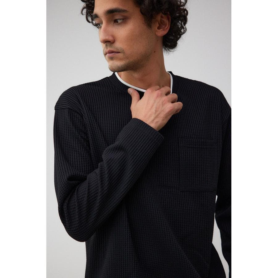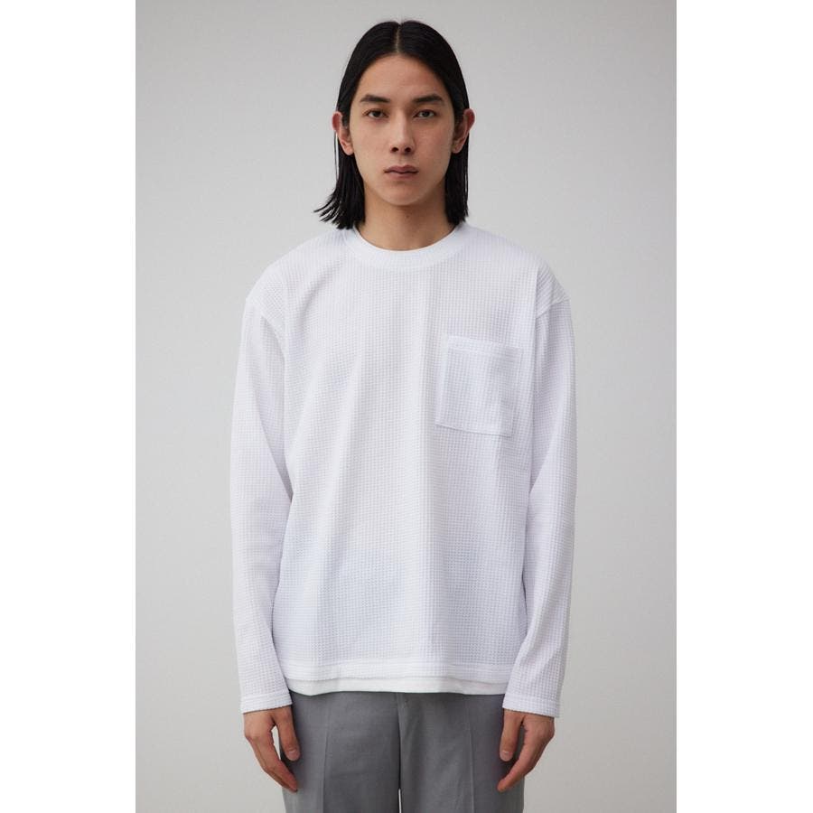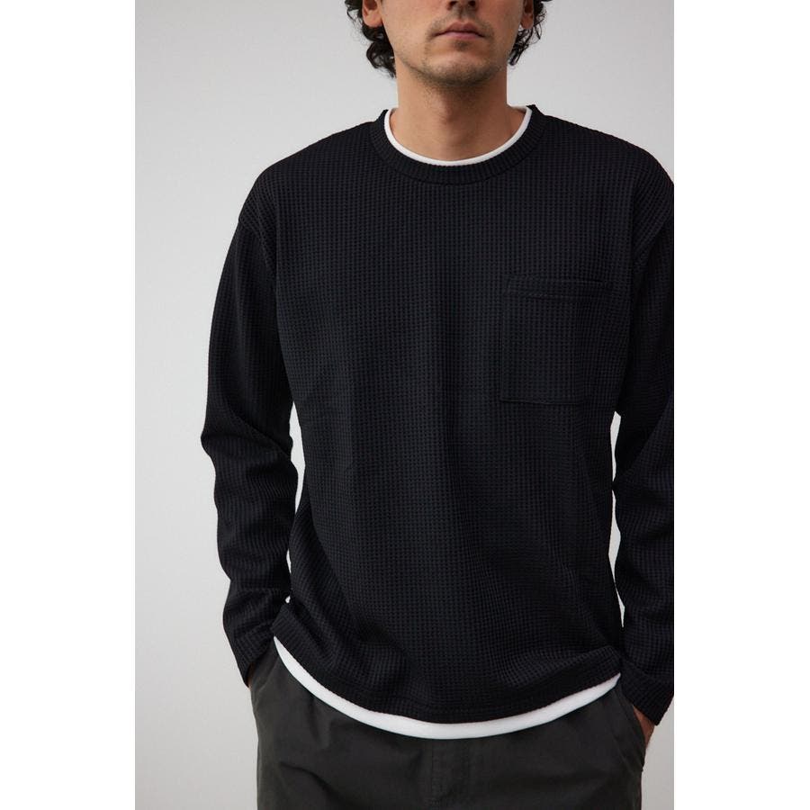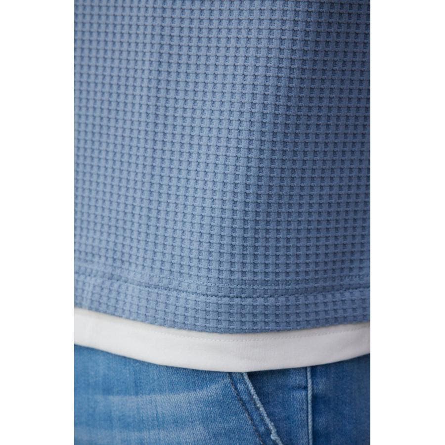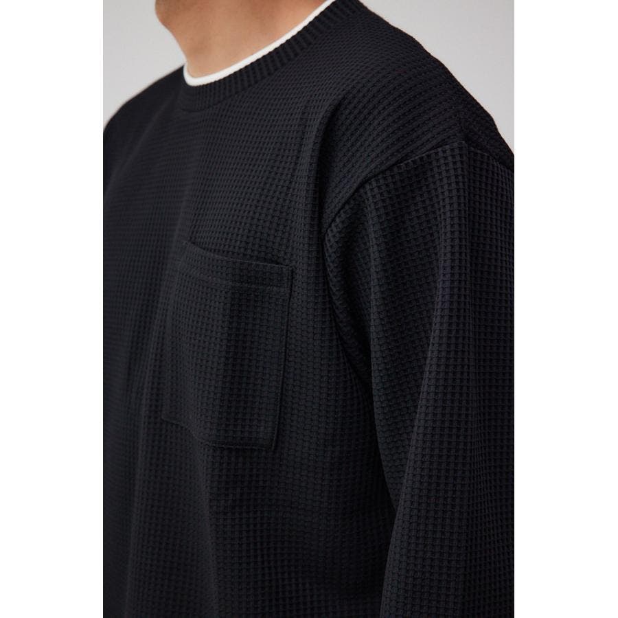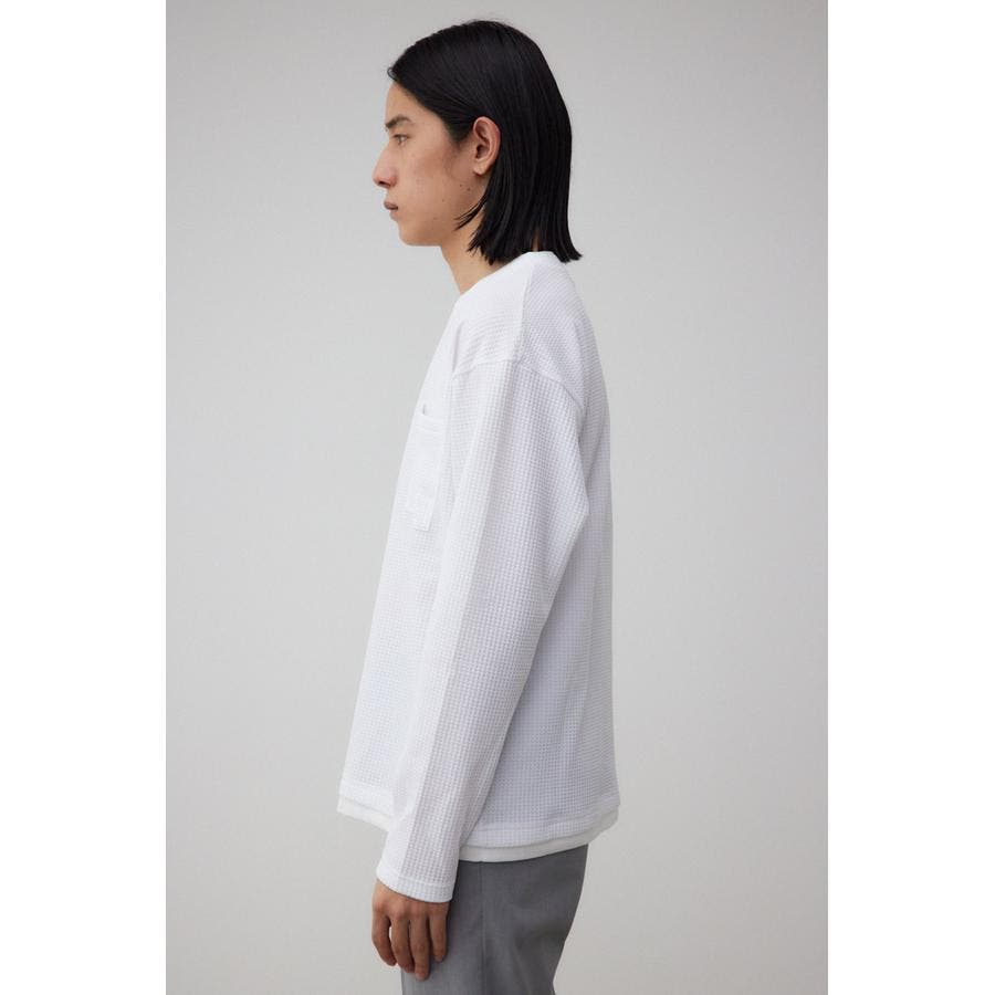 ・身頃がワッフル生地で表面変化を楽しむことができ、襟や裾から出るロンTがこなれ感を演出。