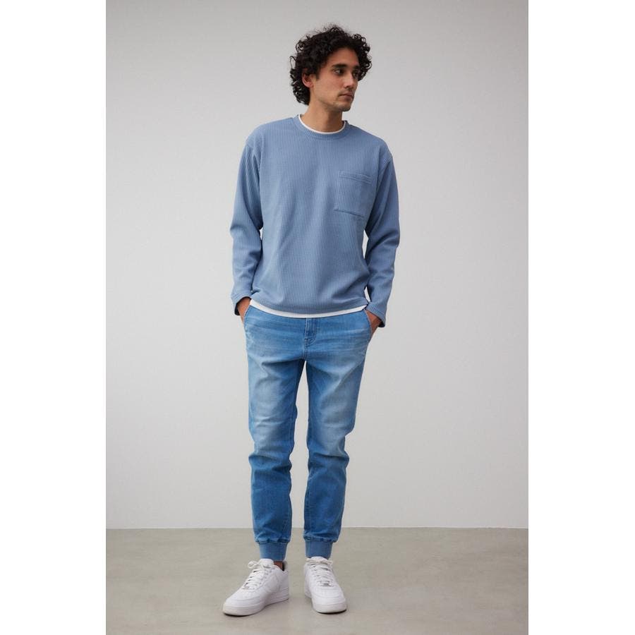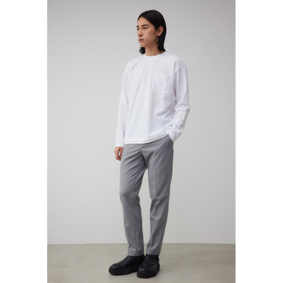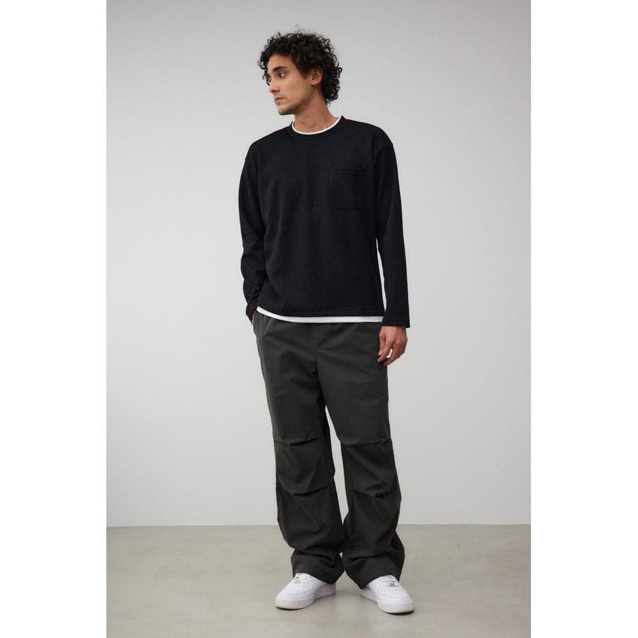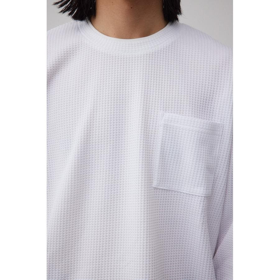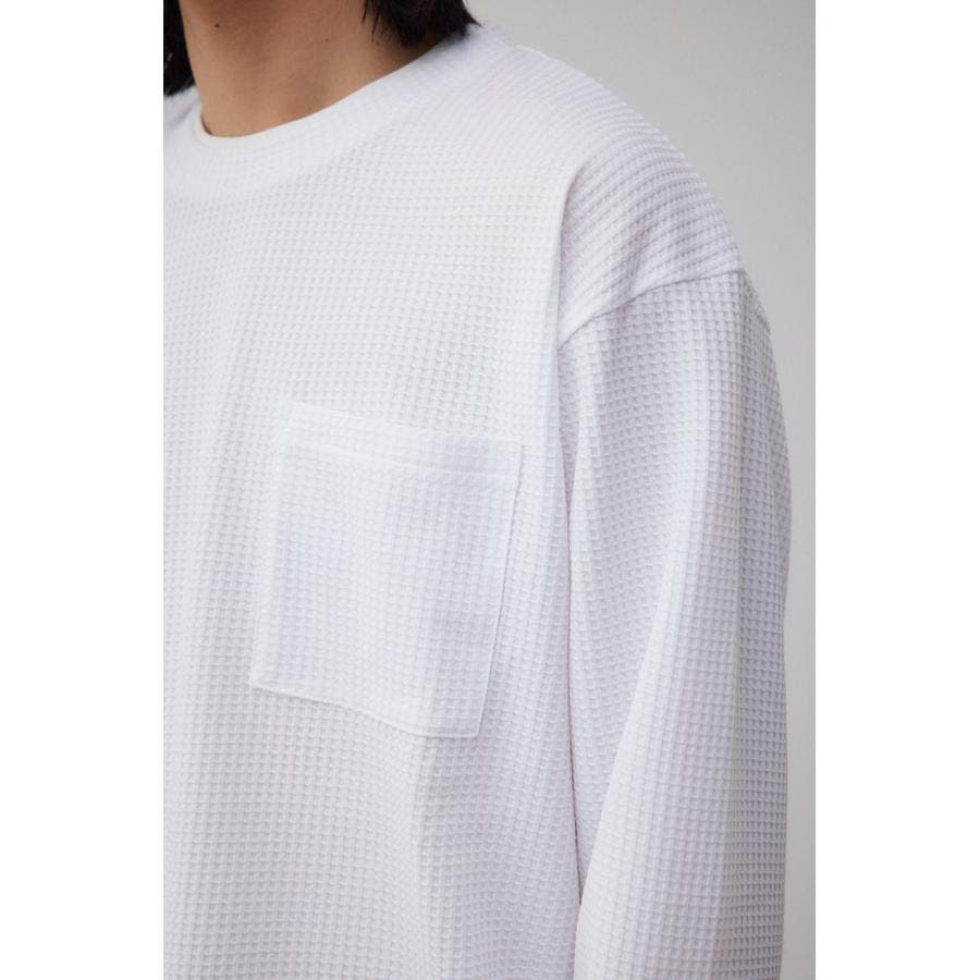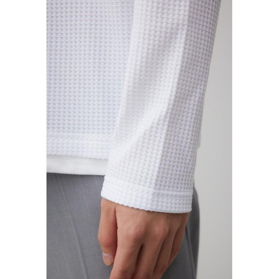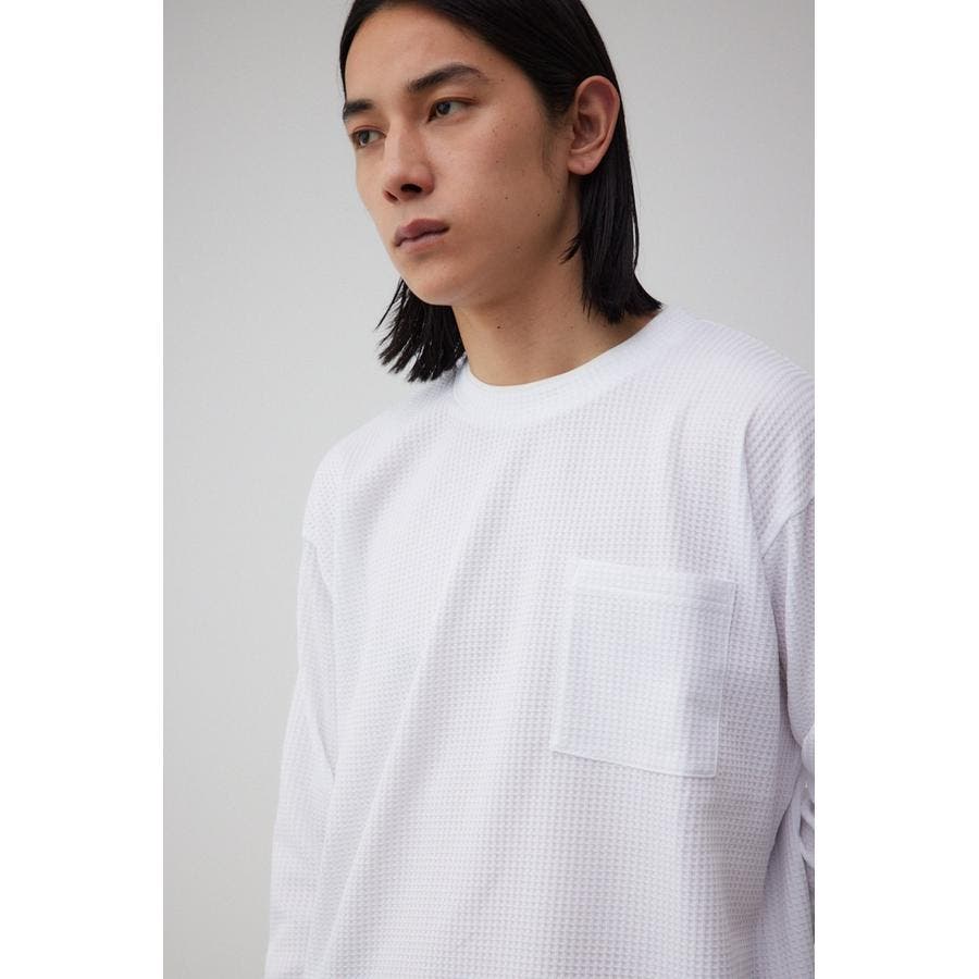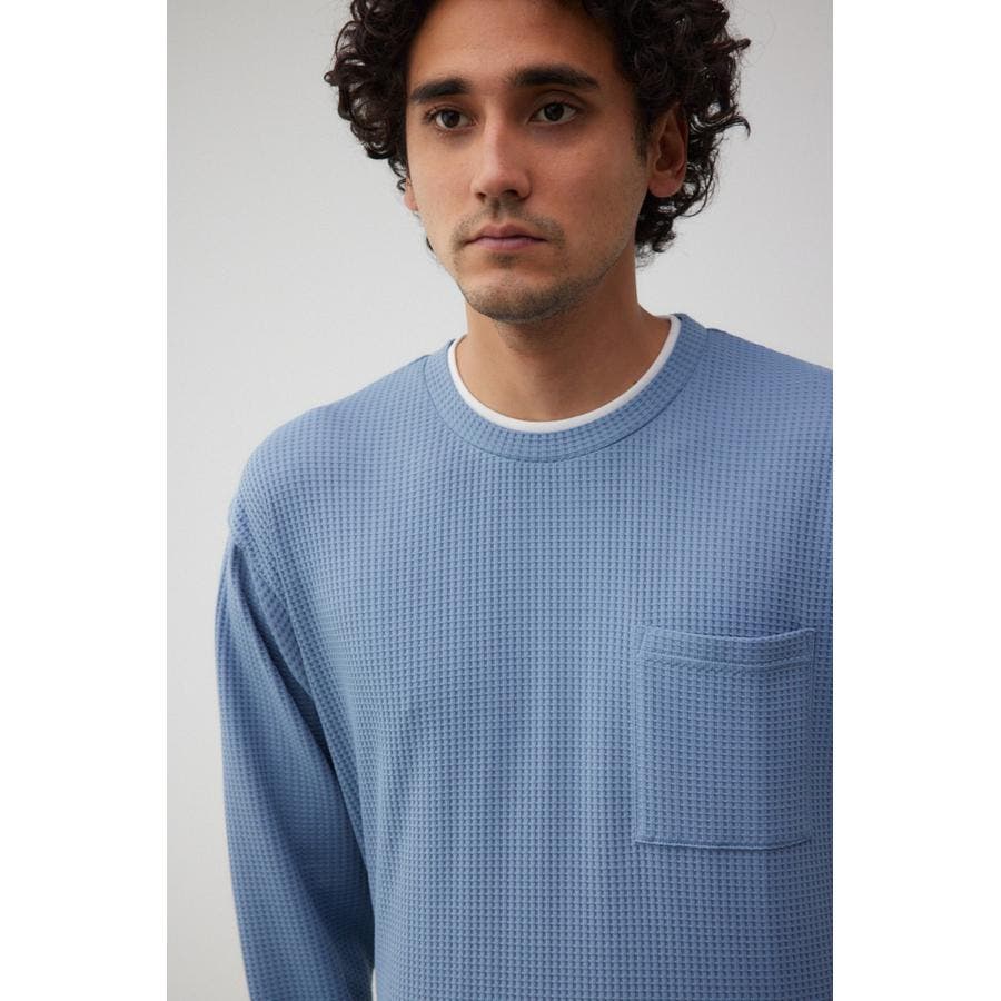 ・身頃がワッフル生地で表面変化を楽しむことができ、襟や裾から出るロンTがこなれ感を演出。