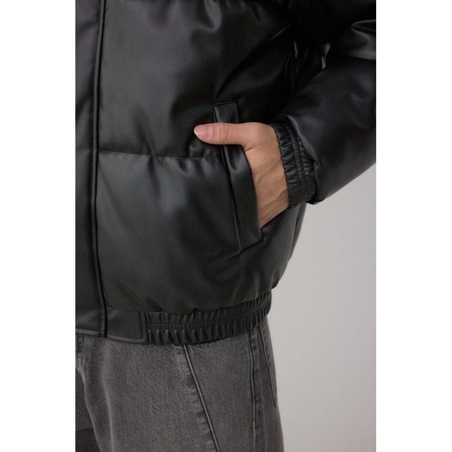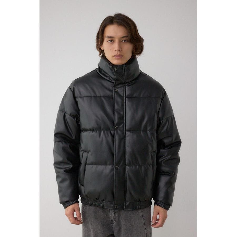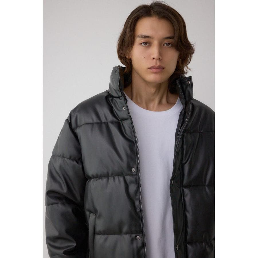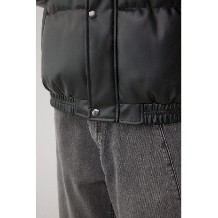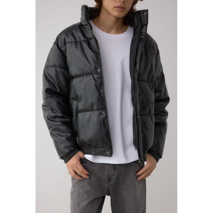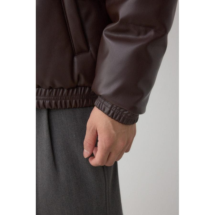 シンプルなスタンドカラーに、ありそうでないPUレザー素材を使用した中綿ブルゾン。