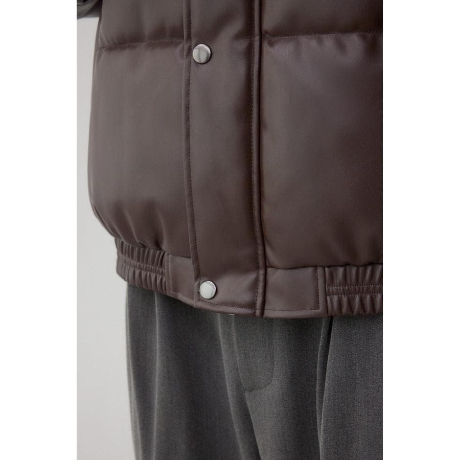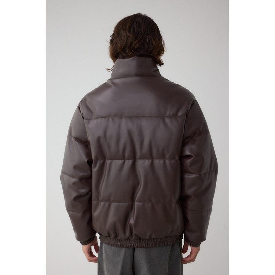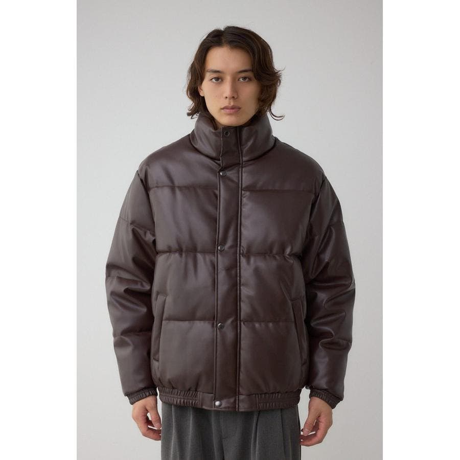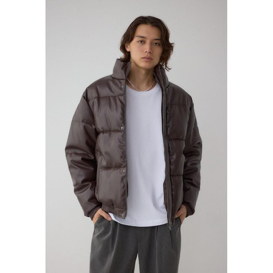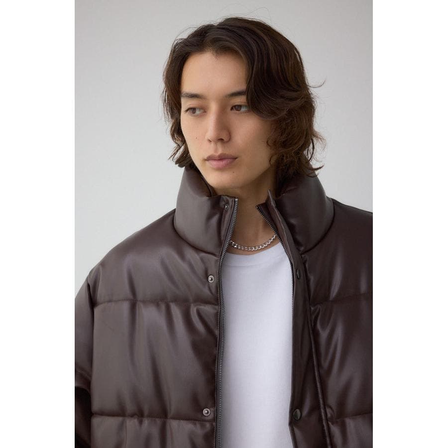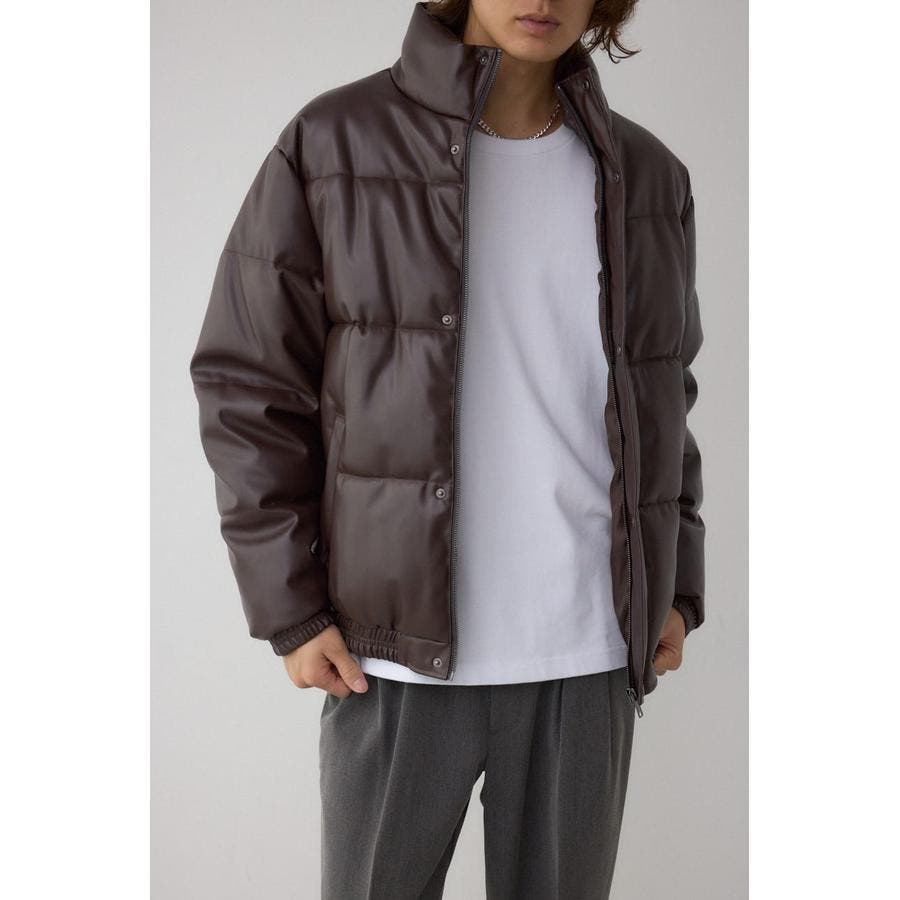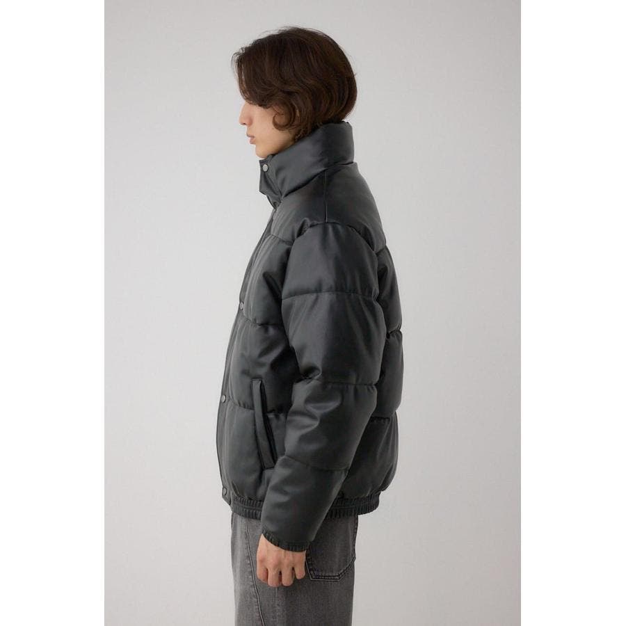 シンプルなスタンドカラーに、ありそうでないPUレザー素材を使用した中綿ブルゾン。