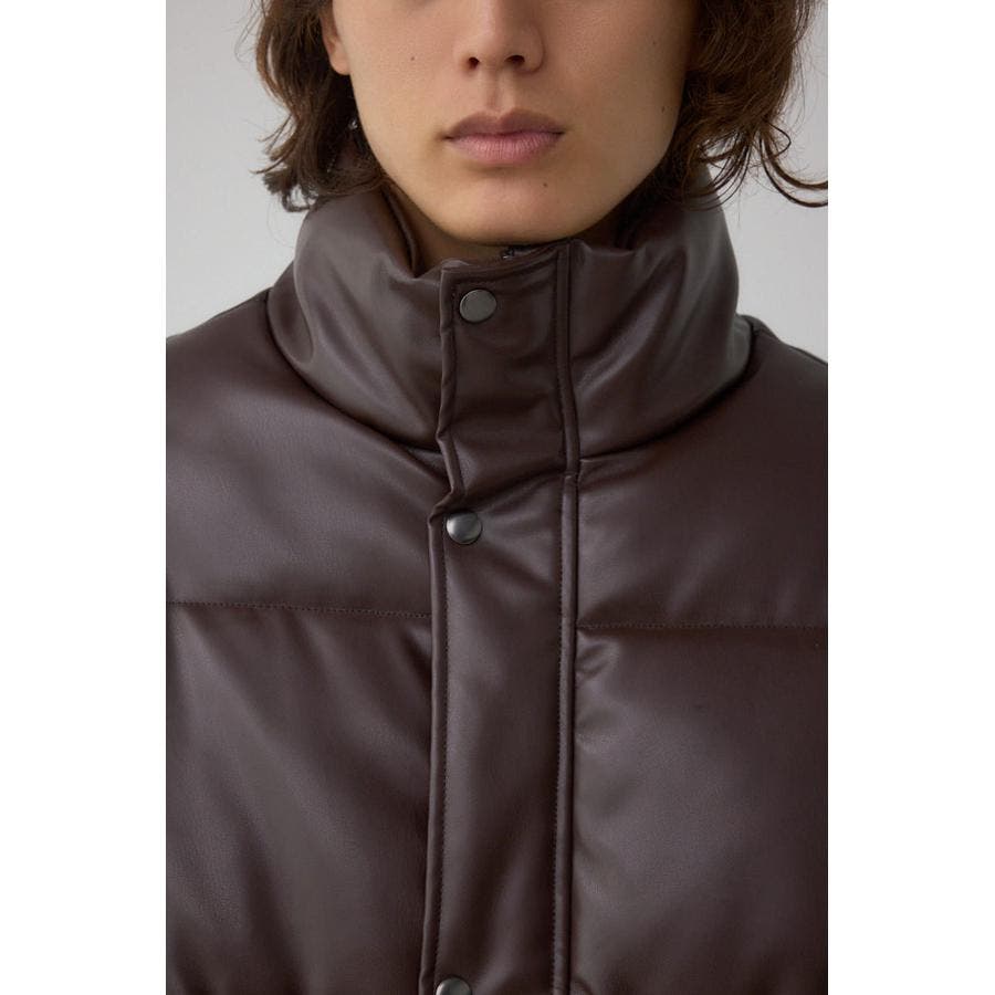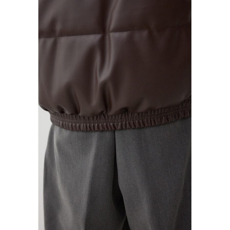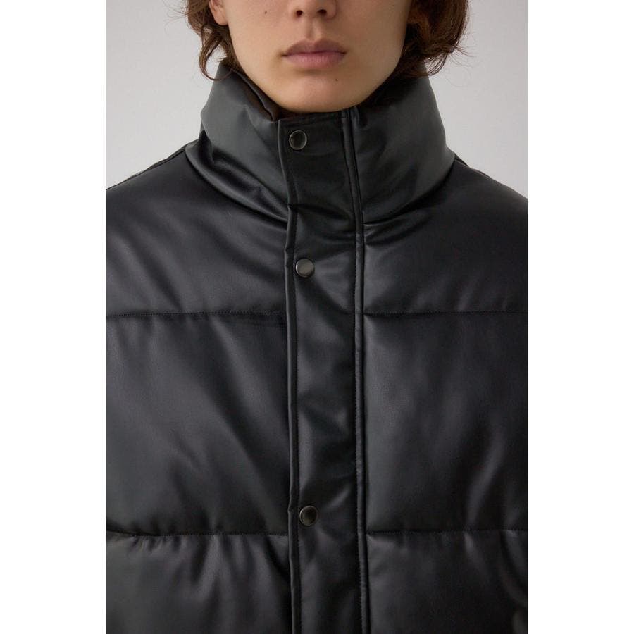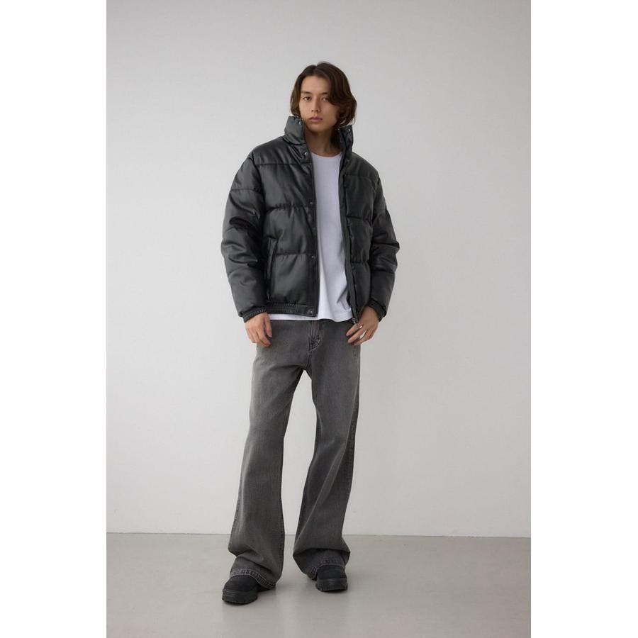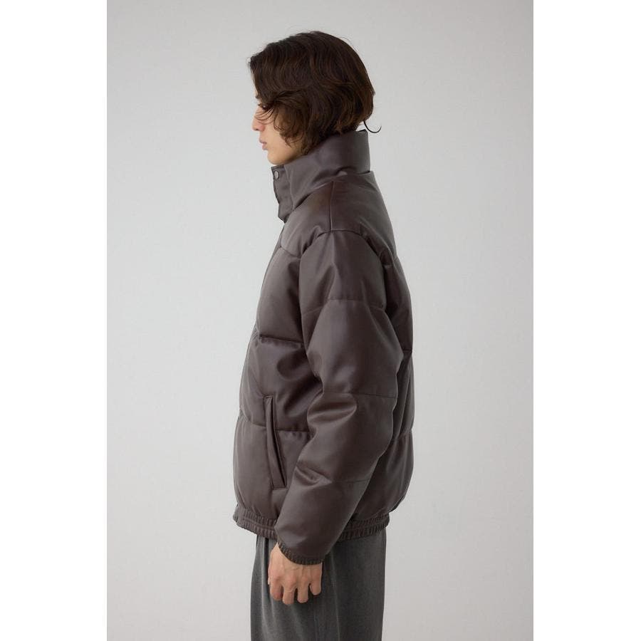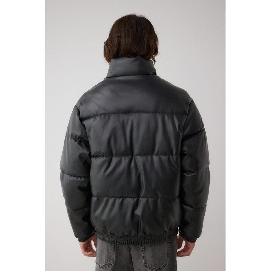 シンプルなスタンドカラーに、ありそうでないPUレザー素材を使用した中綿ブルゾン。
