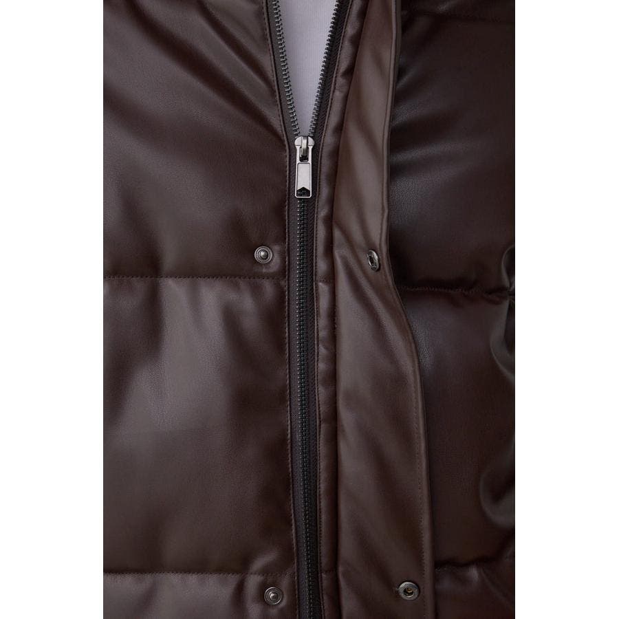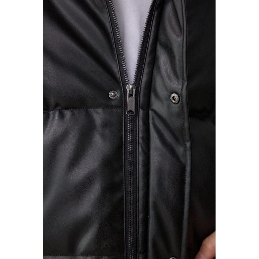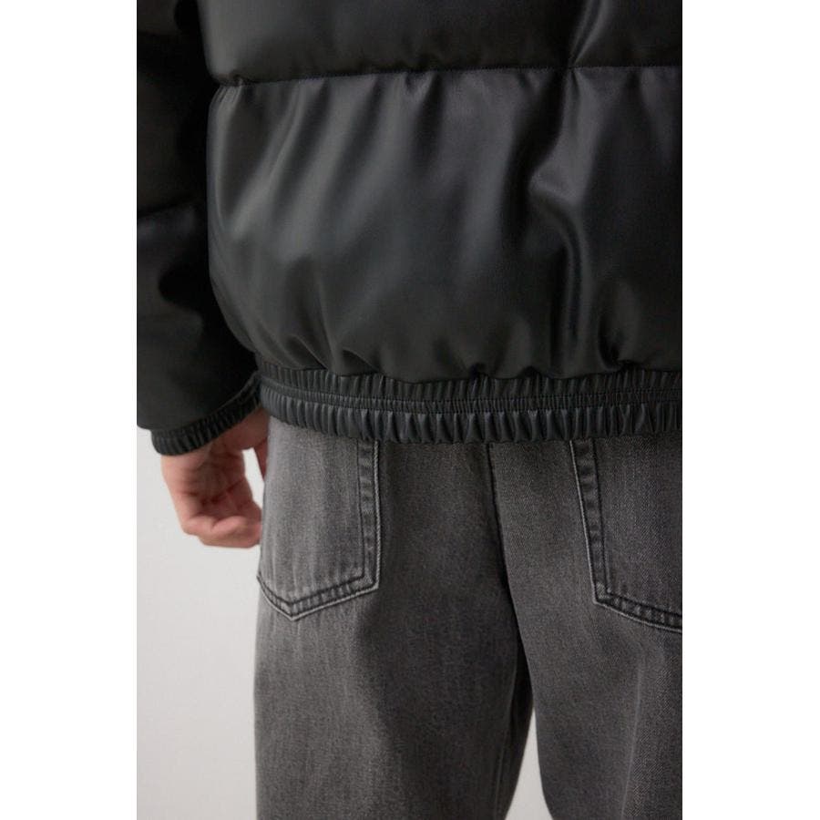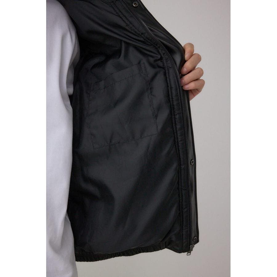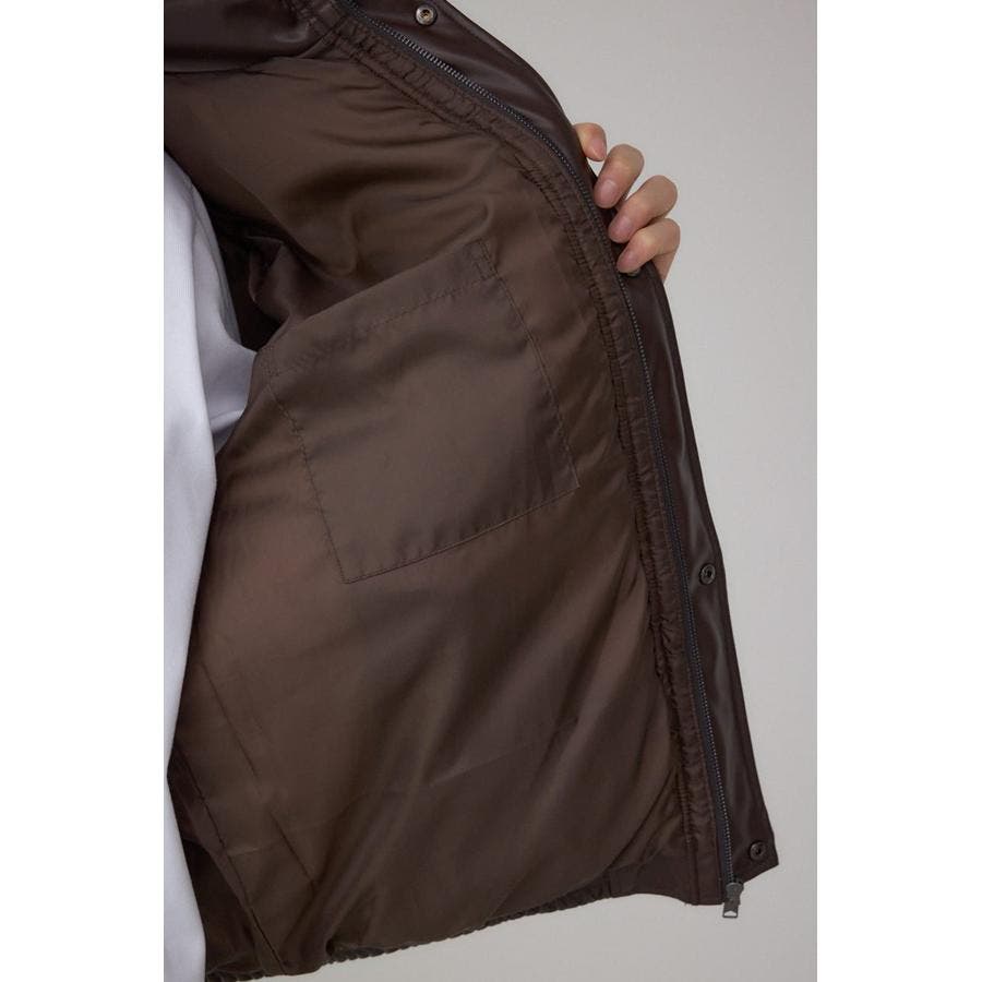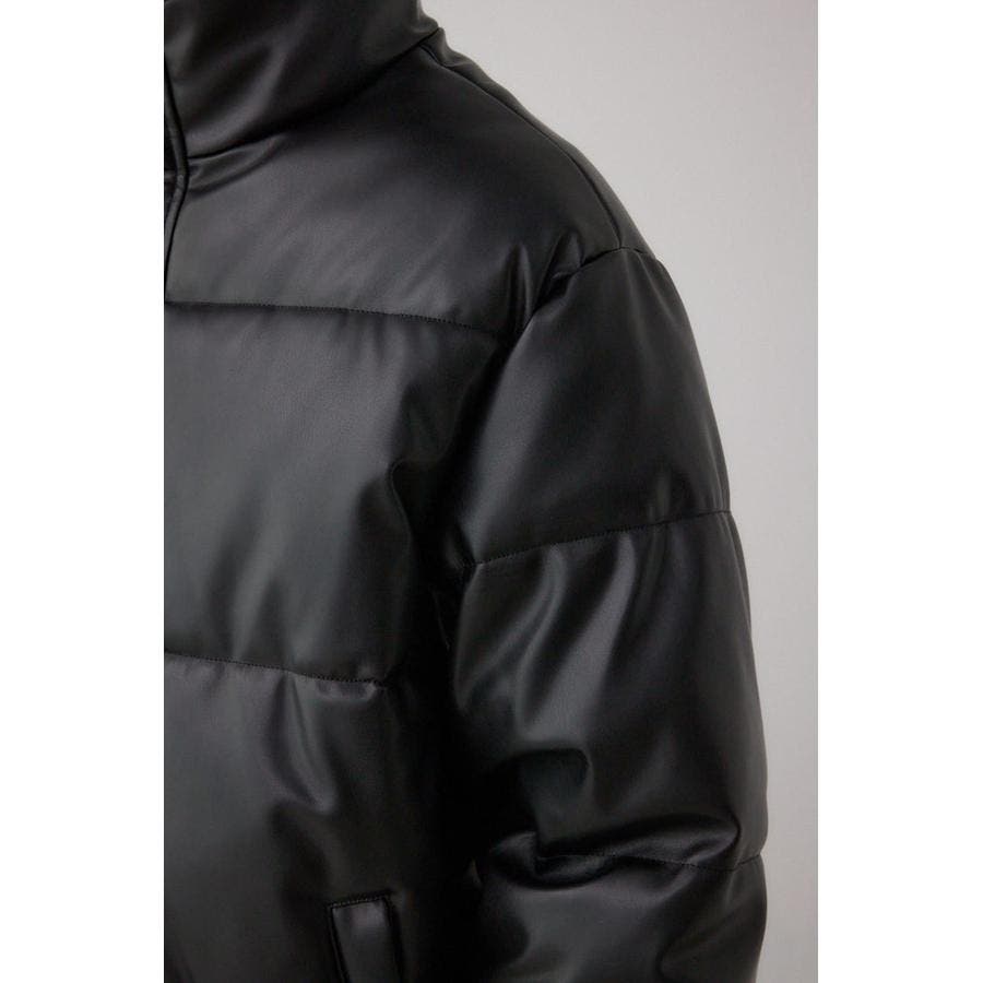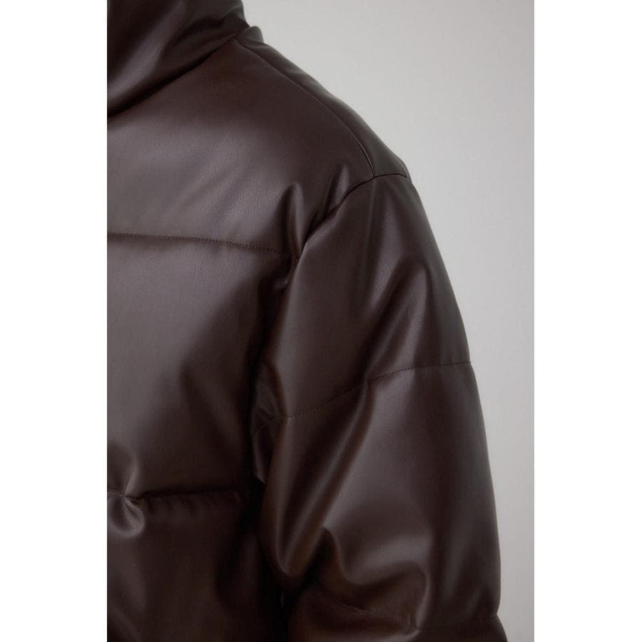 シンプルなスタンドカラーに、ありそうでないPUレザー素材を使用した中綿ブルゾン。
