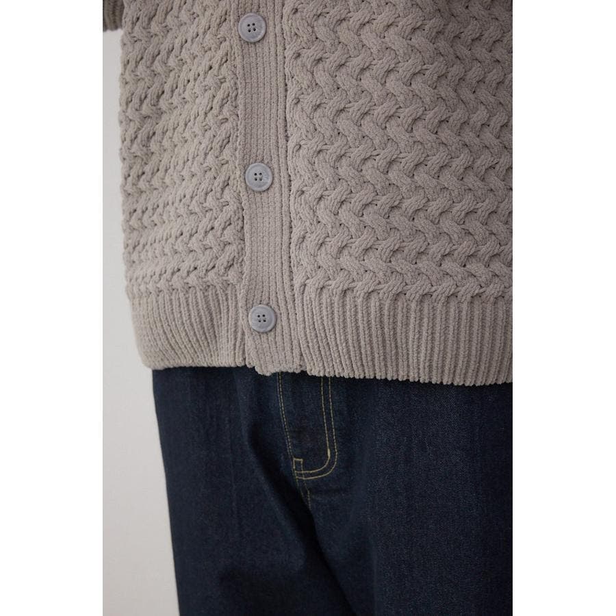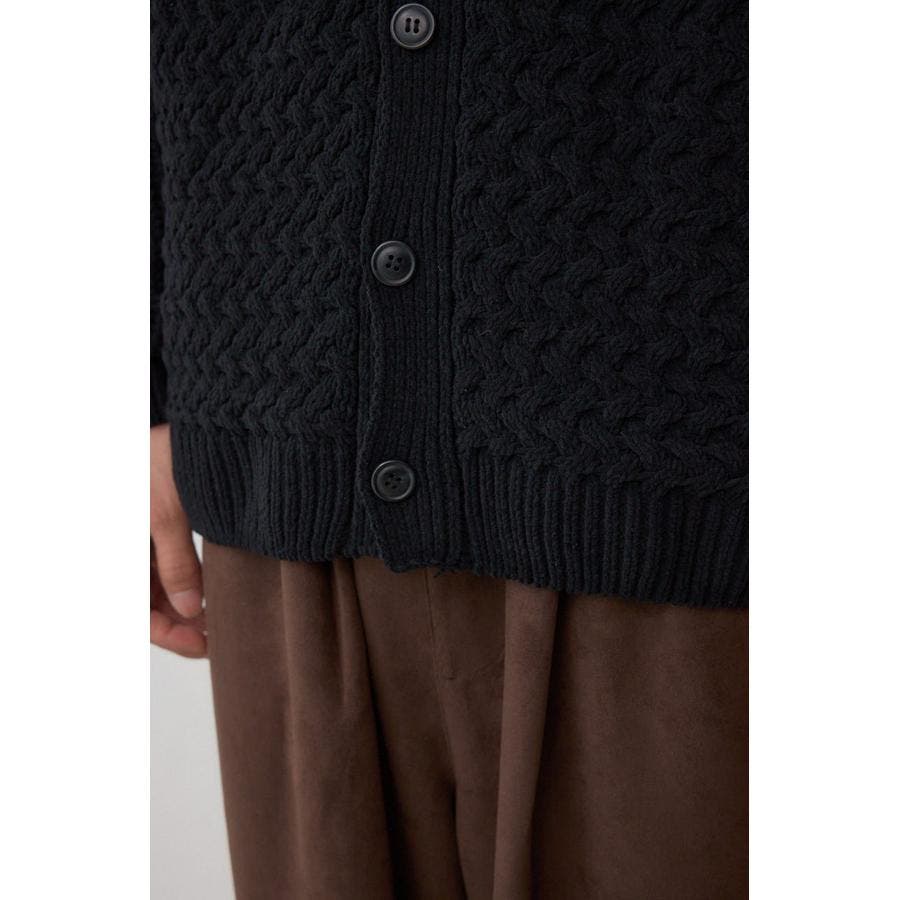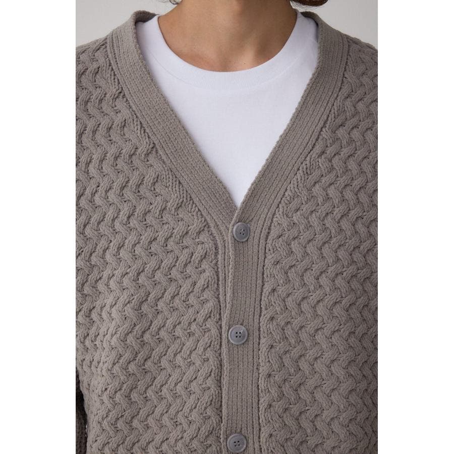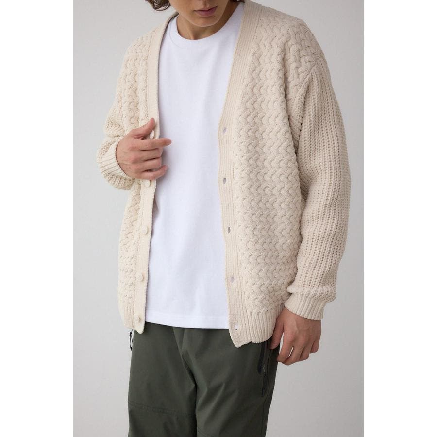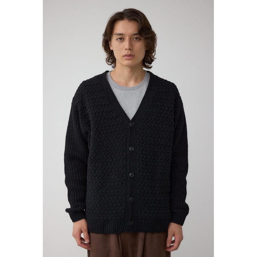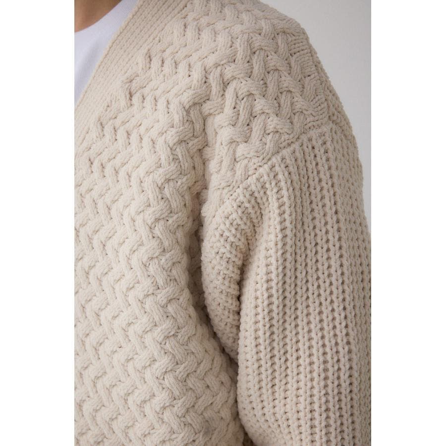バスケット編みの立体感とマットなモール糸が融合したメンズカーディガン。
