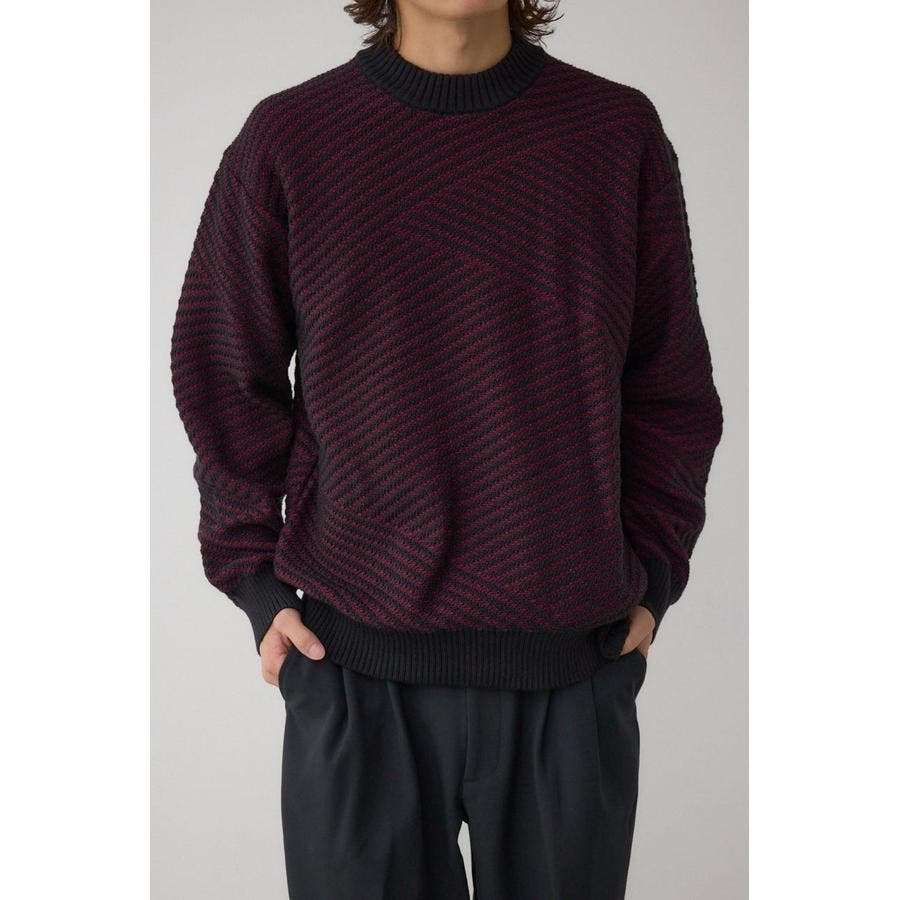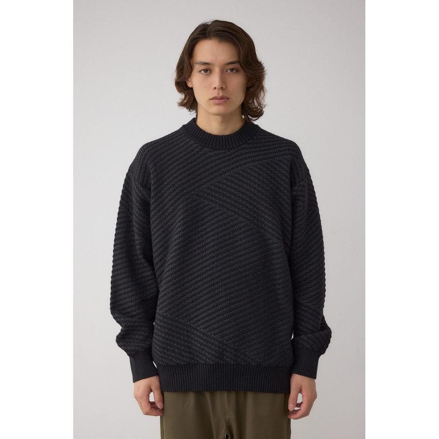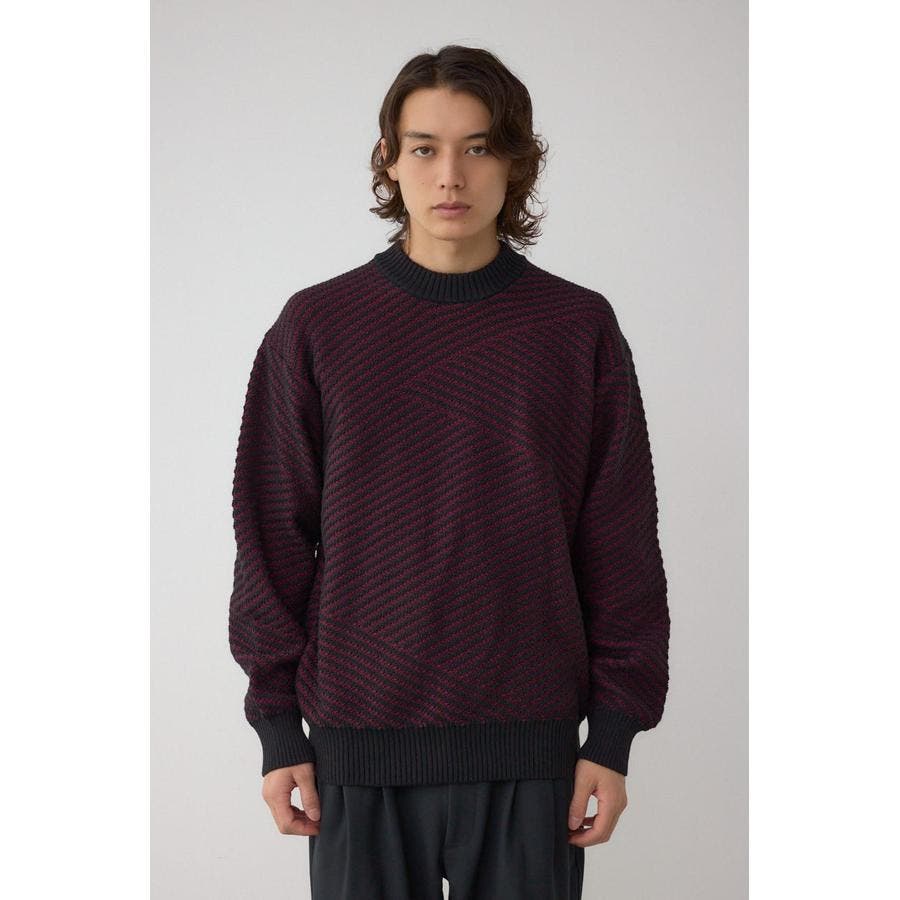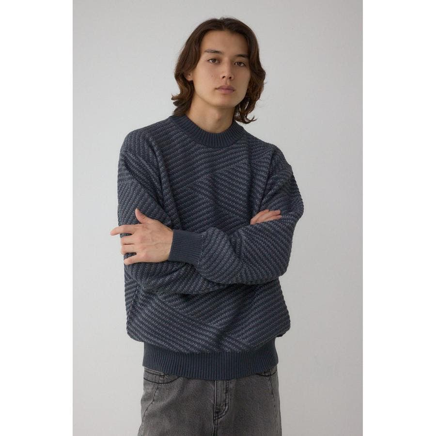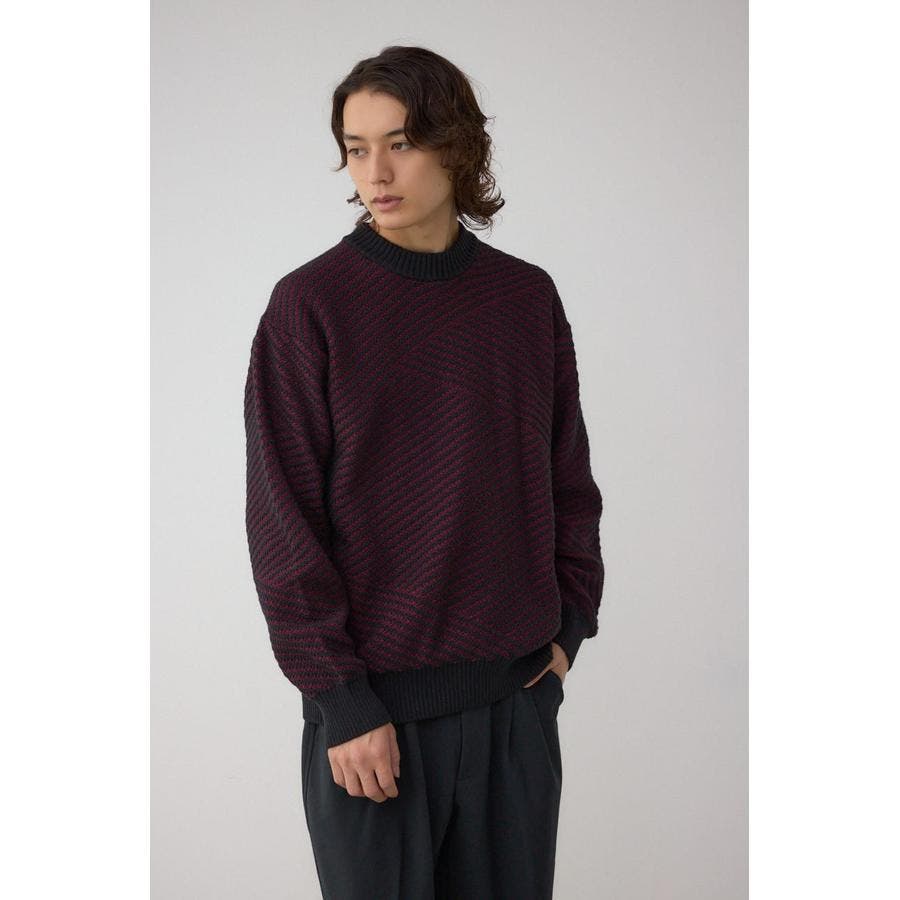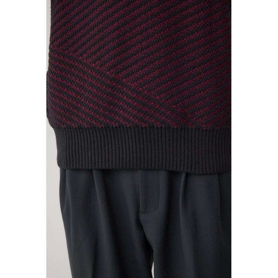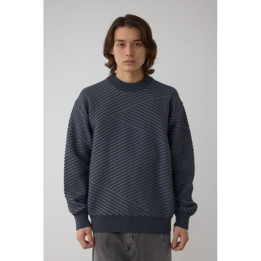 幾何学的な切り替えとジグトーンのダブルジャガードで立体感と存在感を出したニットトップスです。