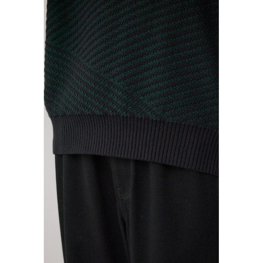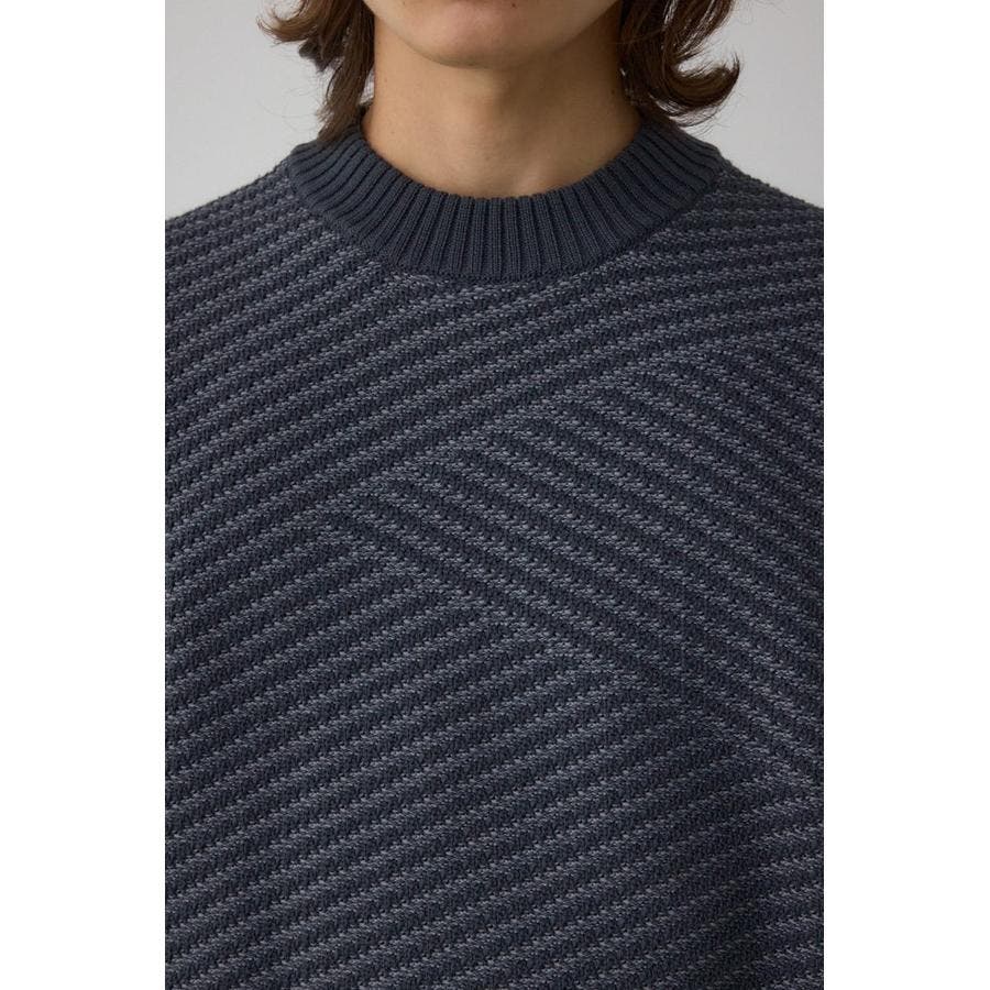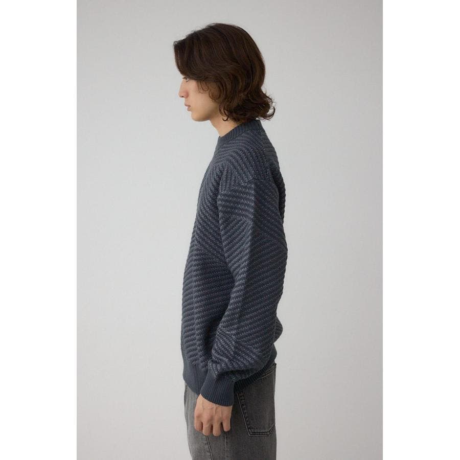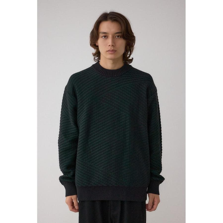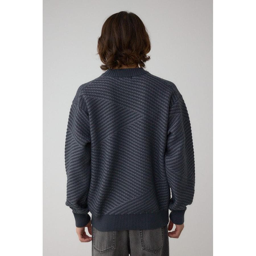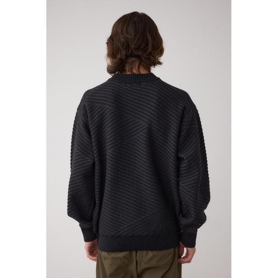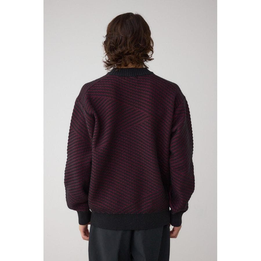 幾何学的な切り替えとジグトーンのダブルジャガードで立体感と存在感を出したニットトップスです。