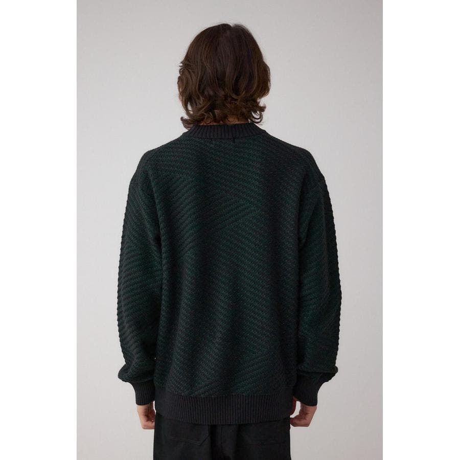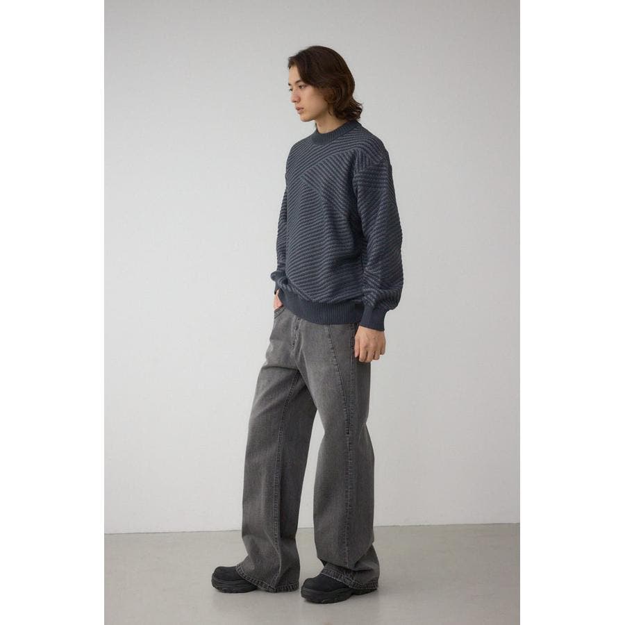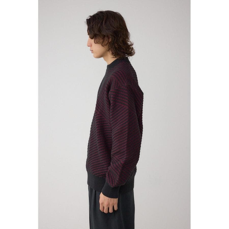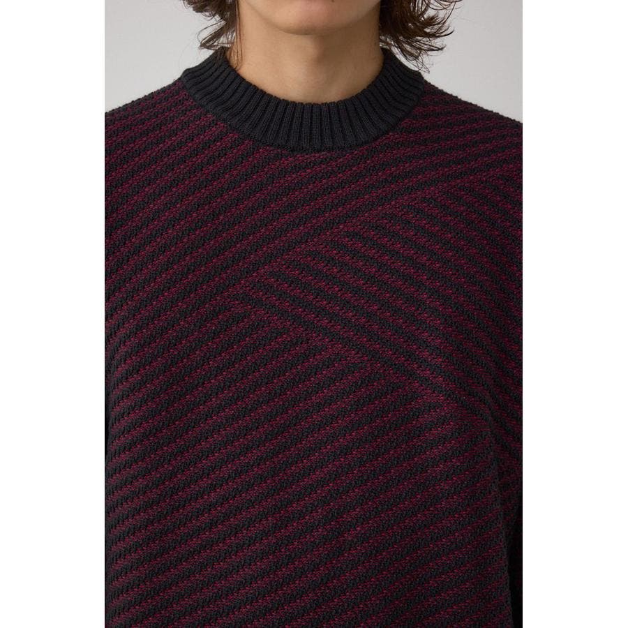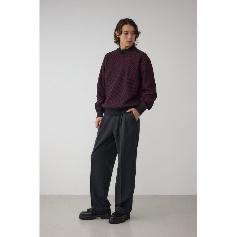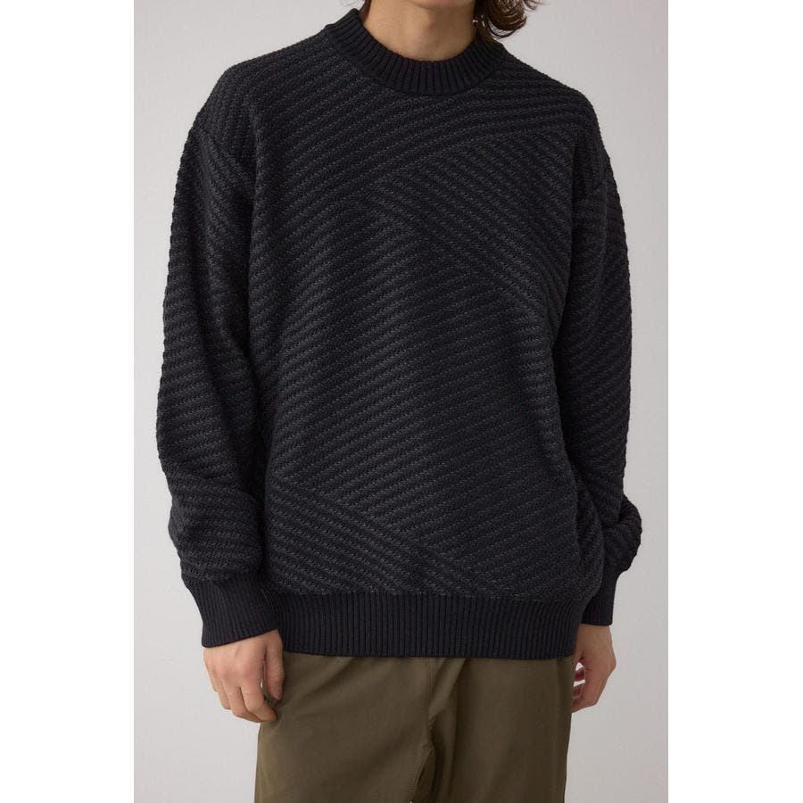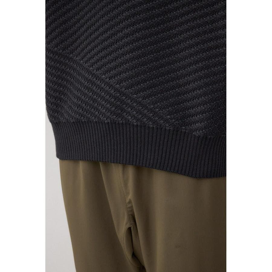 幾何学的な切り替えとジグトーンのダブルジャガードで立体感と存在感を出したニットトップスです。