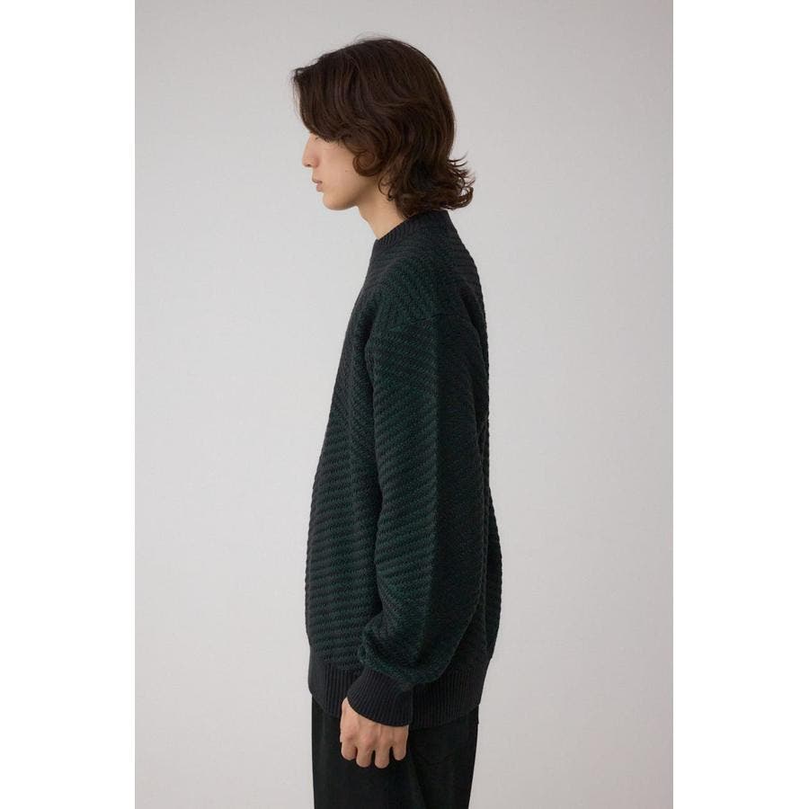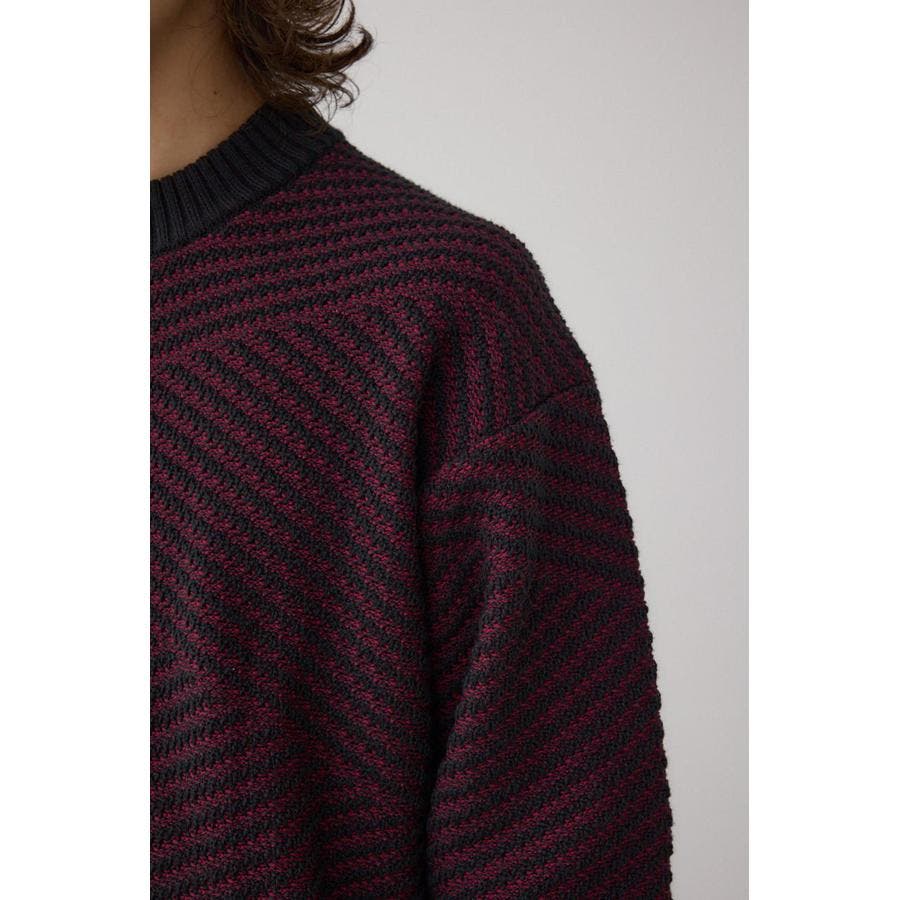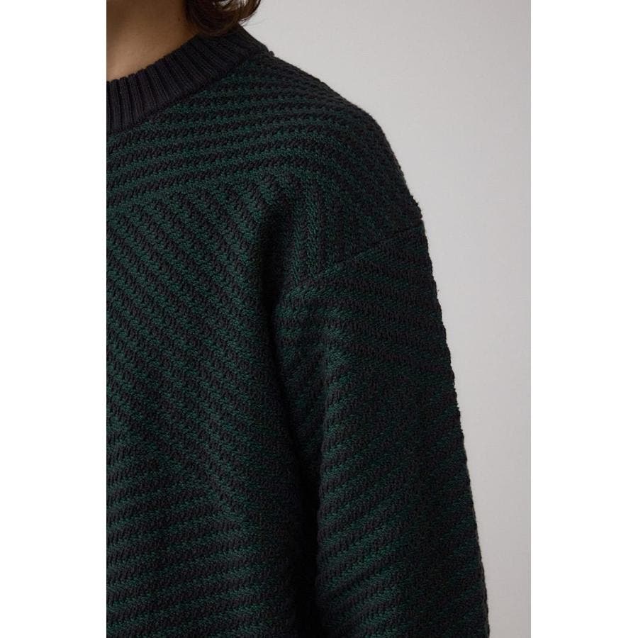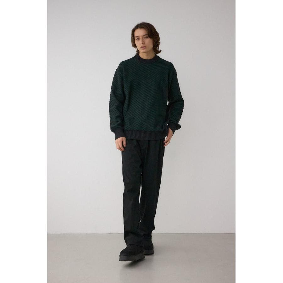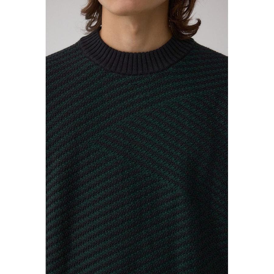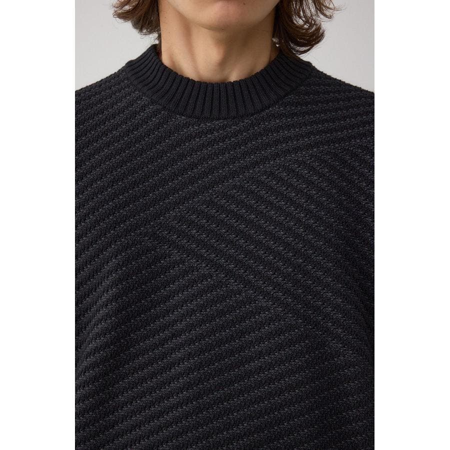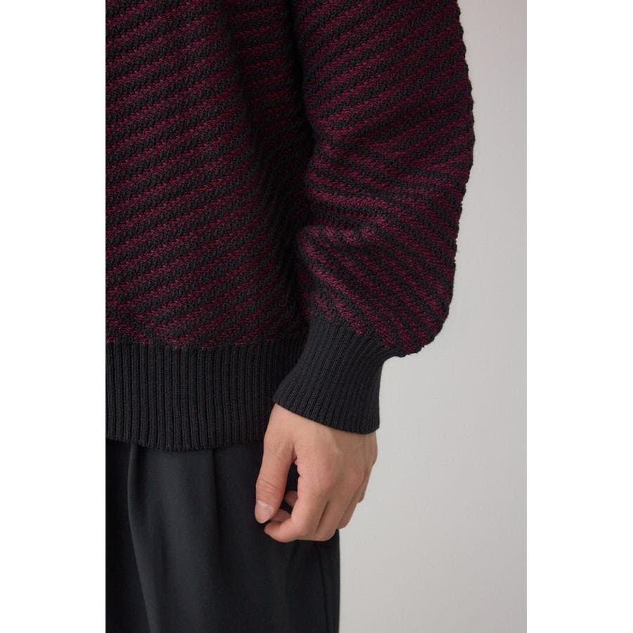 幾何学的な切り替えとジグトーンのダブルジャガードで立体感と存在感を出したニットトップスです。