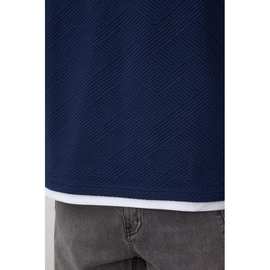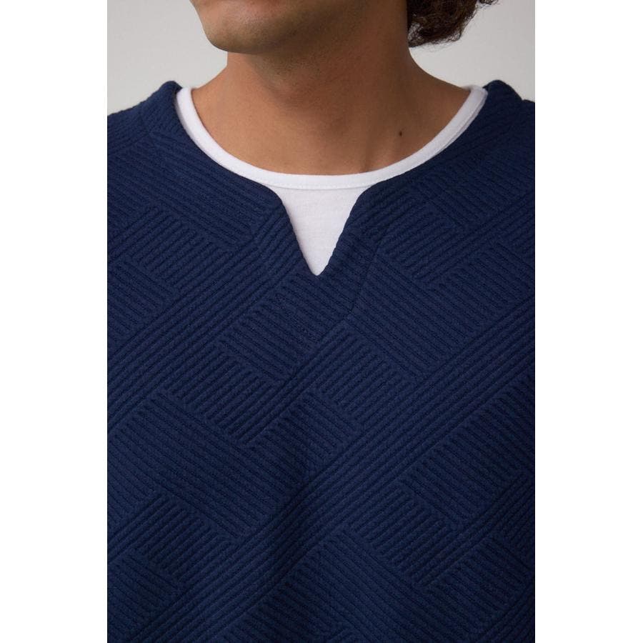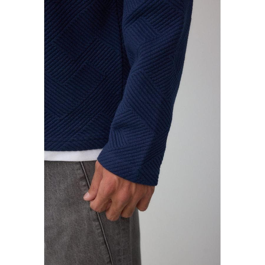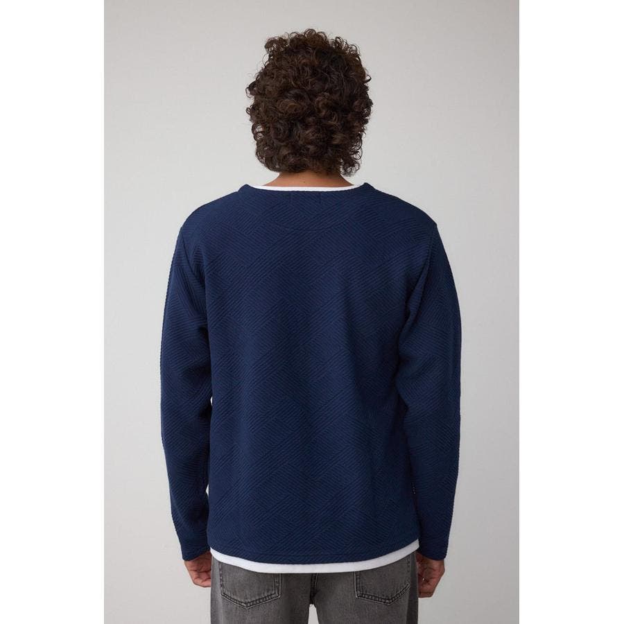 幾何学柄の膨れジャガードが立体的に浮かび上がるフェイクレイヤードトップスです。