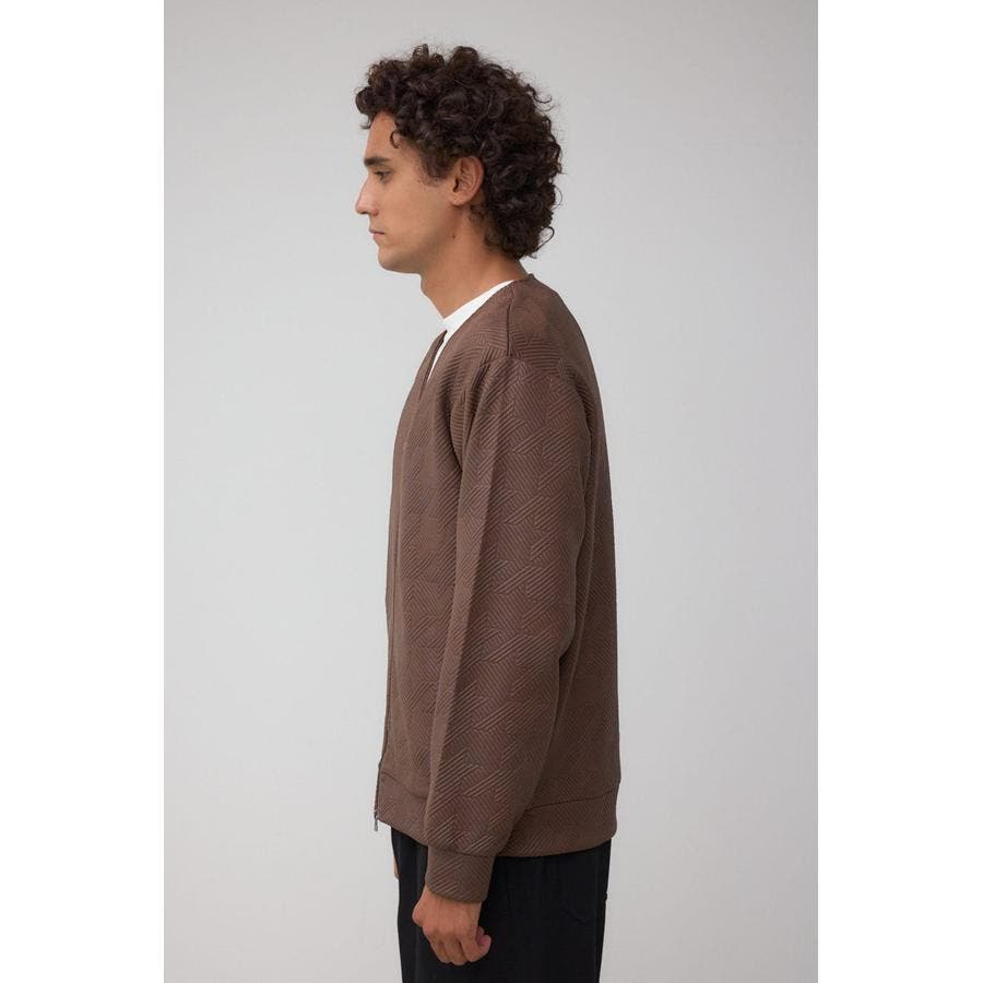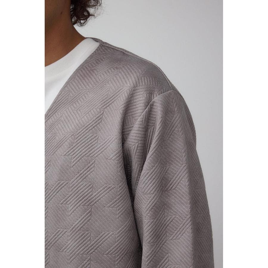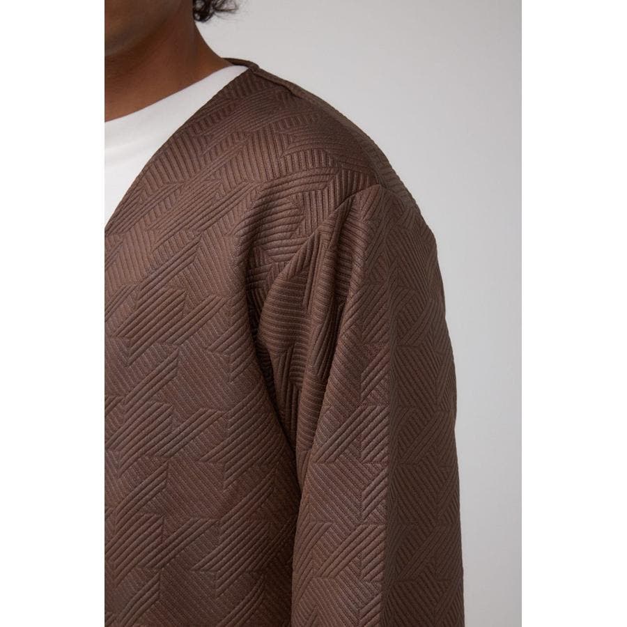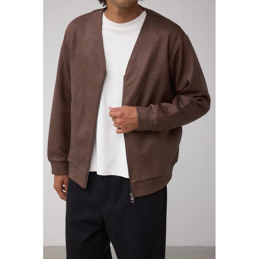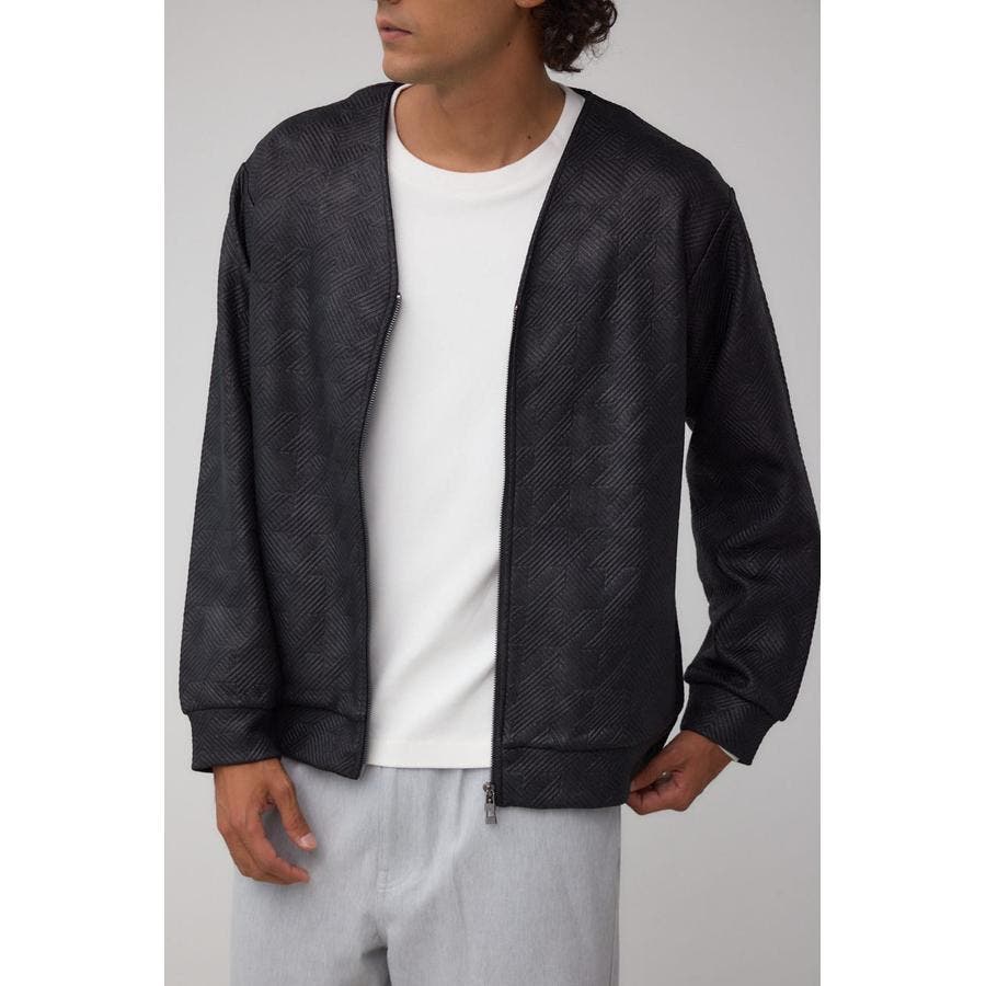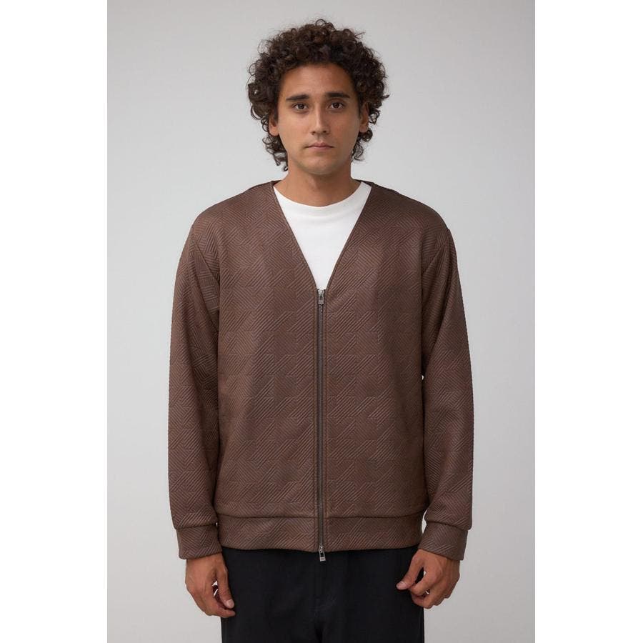 幾何学柄のふくれジャガード生地に、総柄プリント(生地コーティング)を施して、合成皮革のように見える生地です。