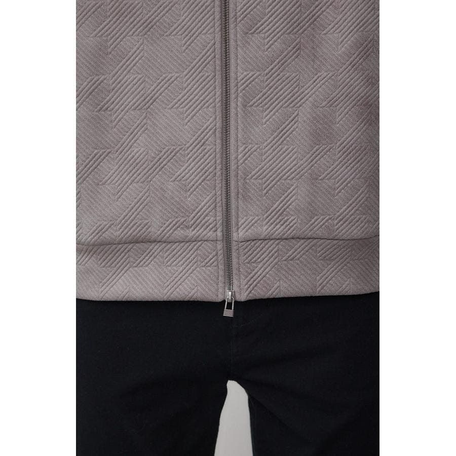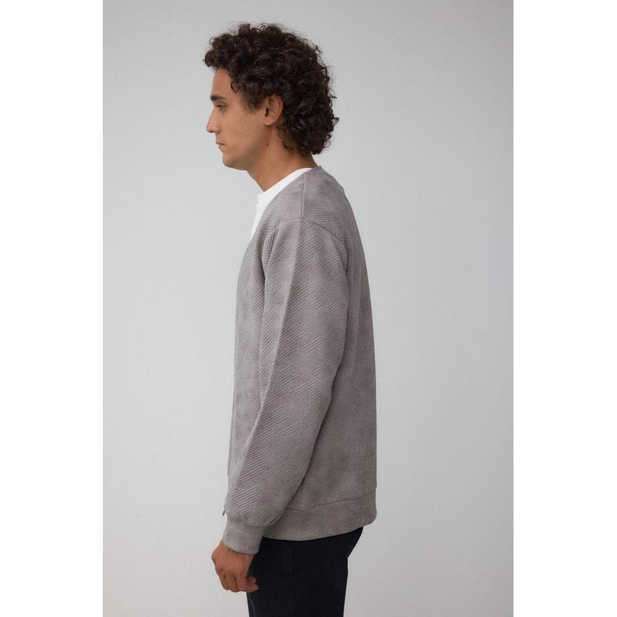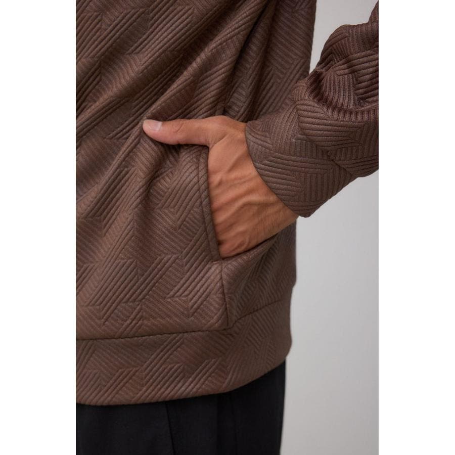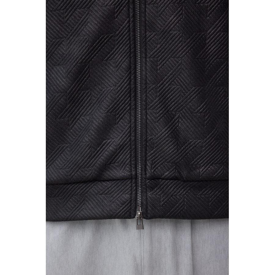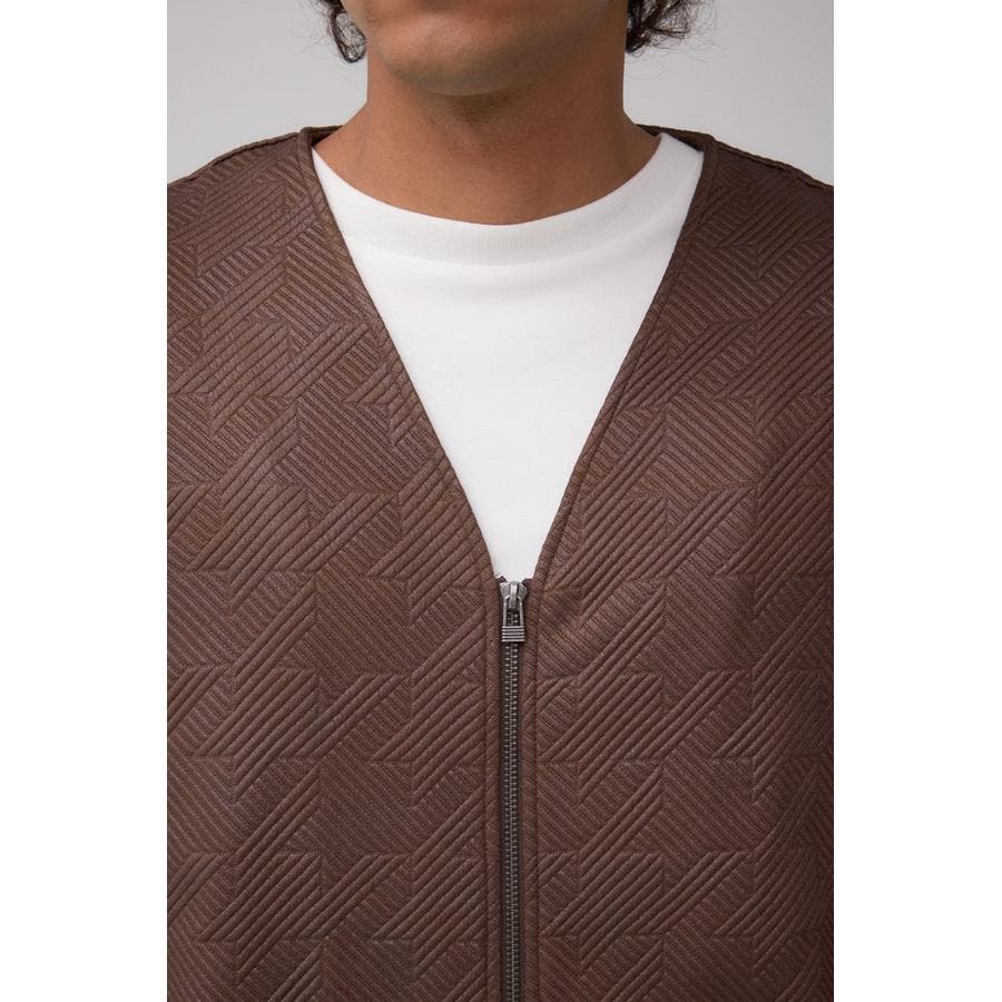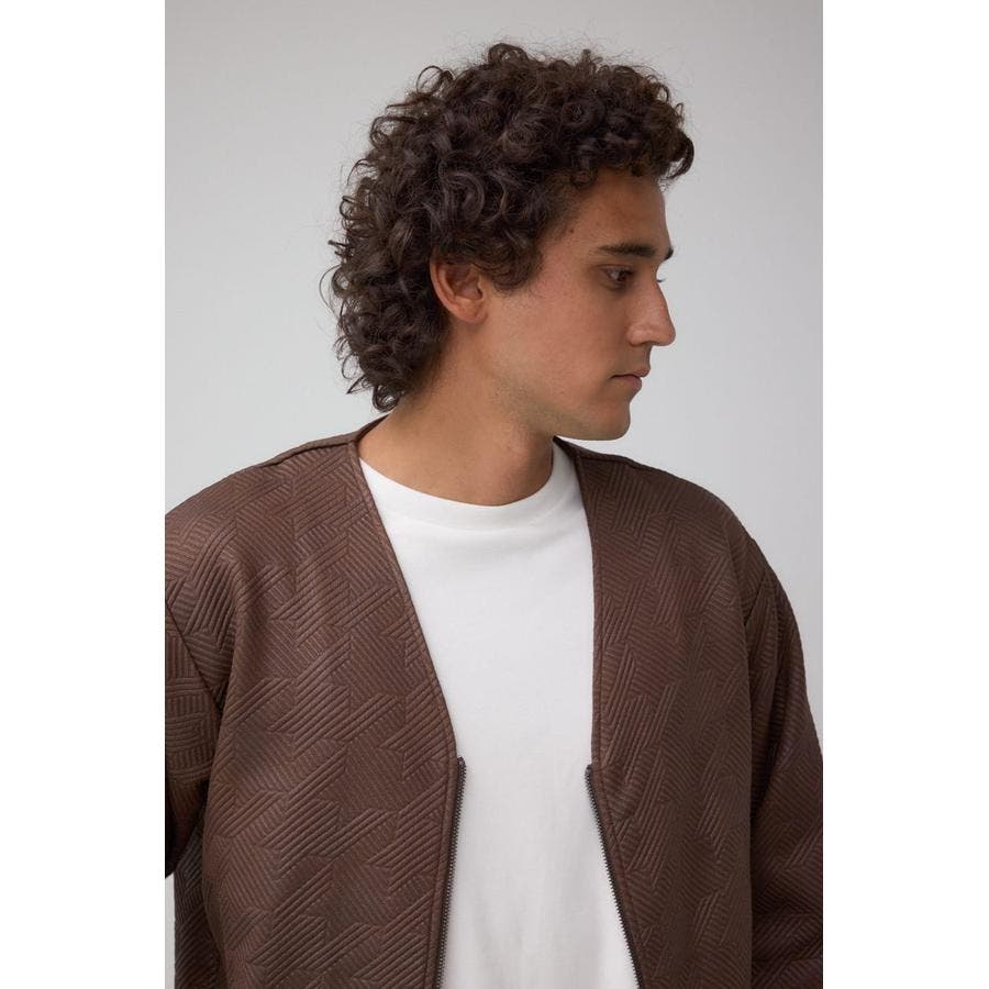 幾何学柄のふくれジャガード生地に、総柄プリント(生地コーティング)を施して、合成皮革のように見える生地です。