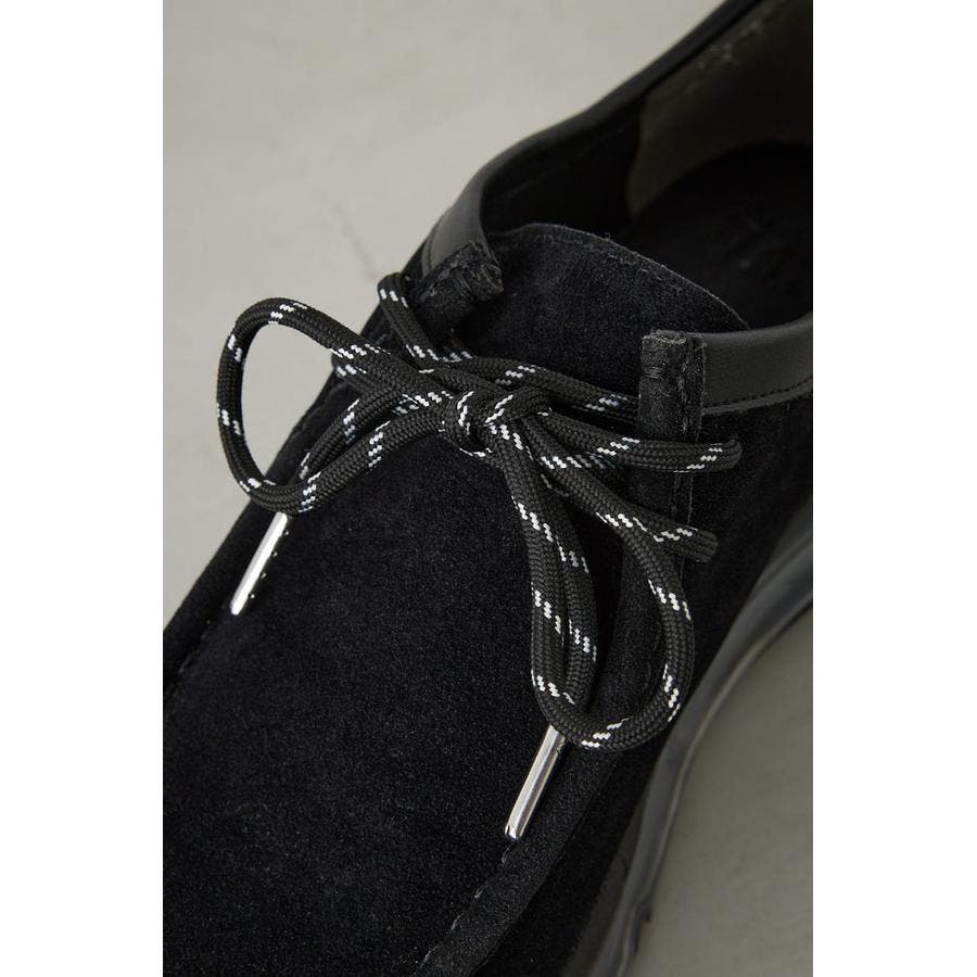 ザラザラしたスエード調の素材を使用し、靴下に色移りしない様に、履き口を合成皮革にしています。