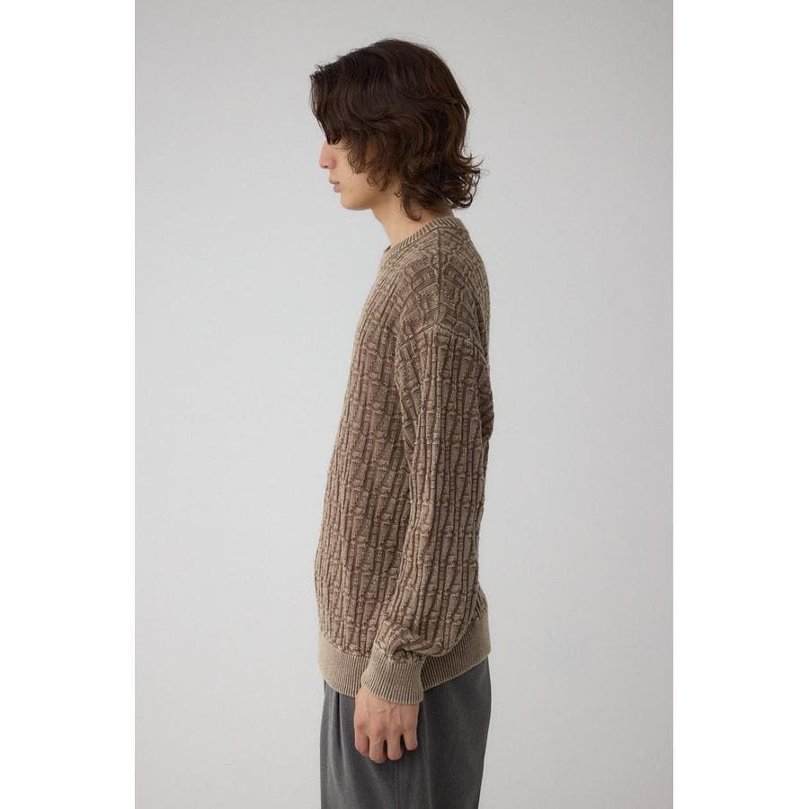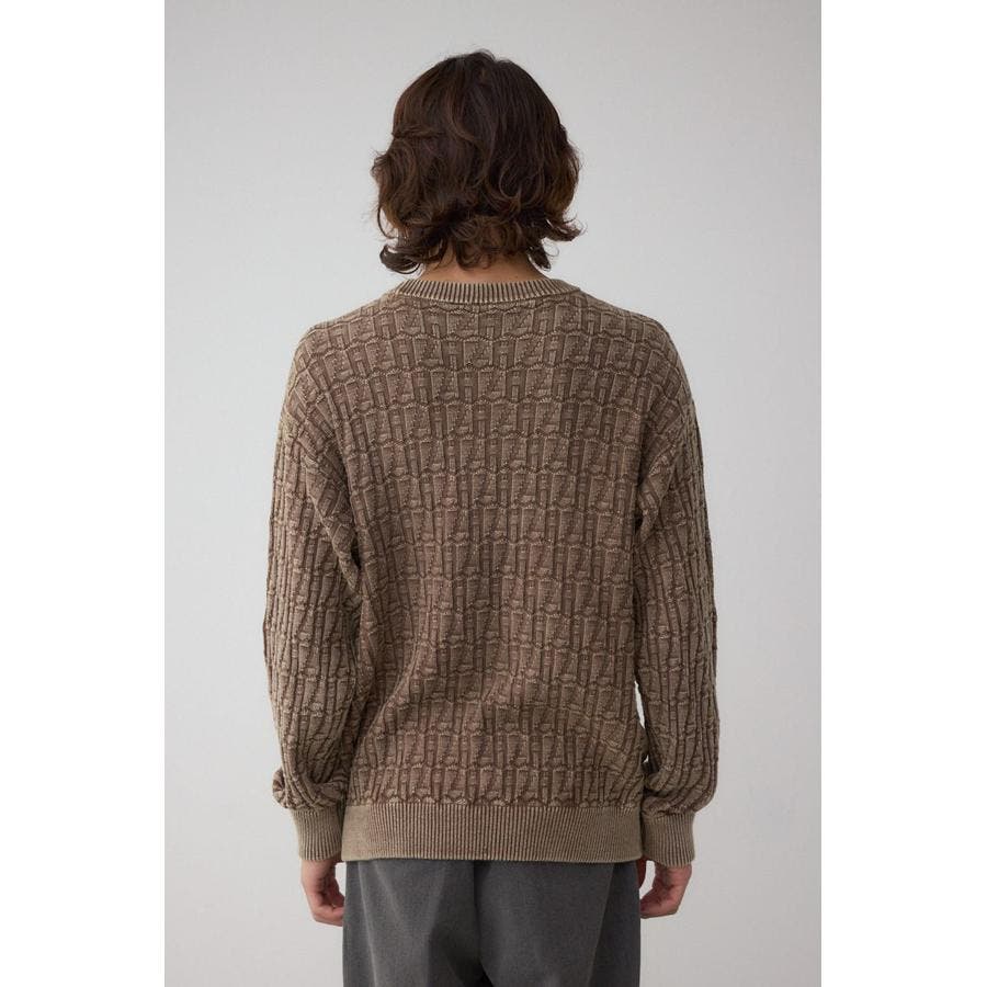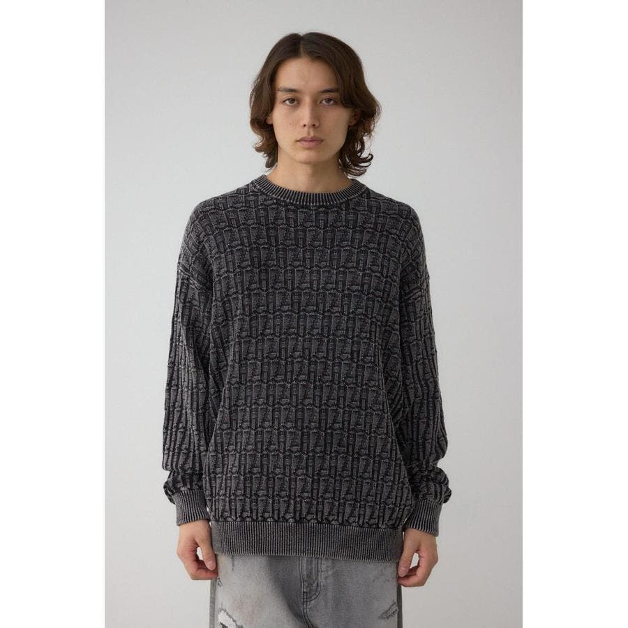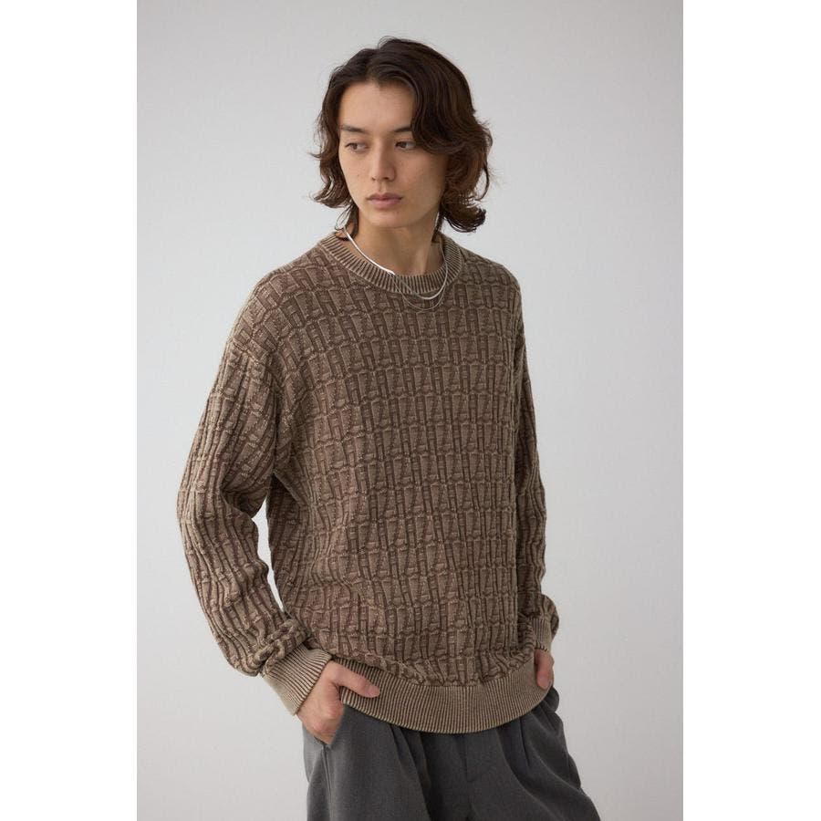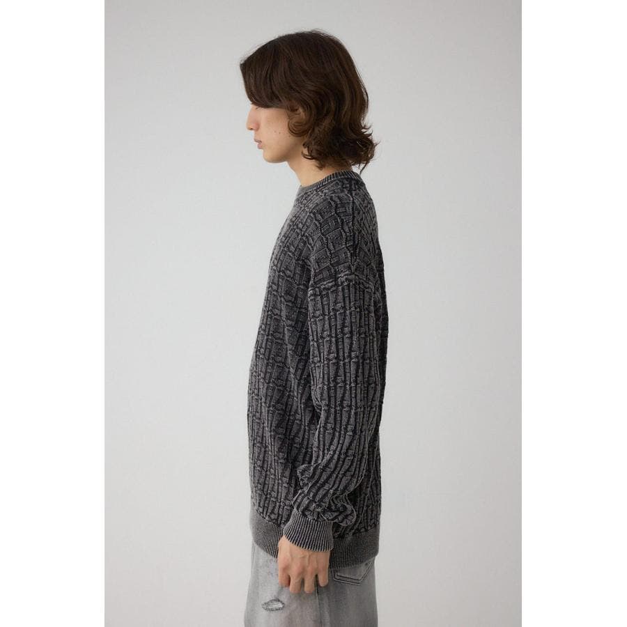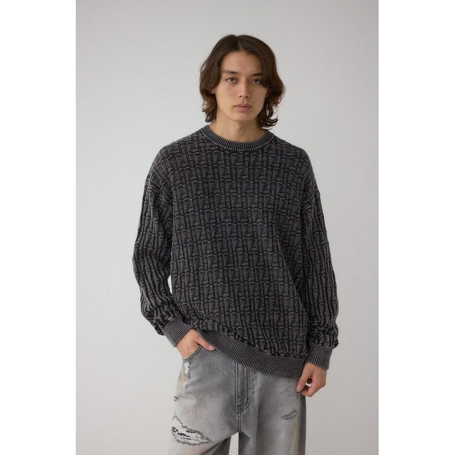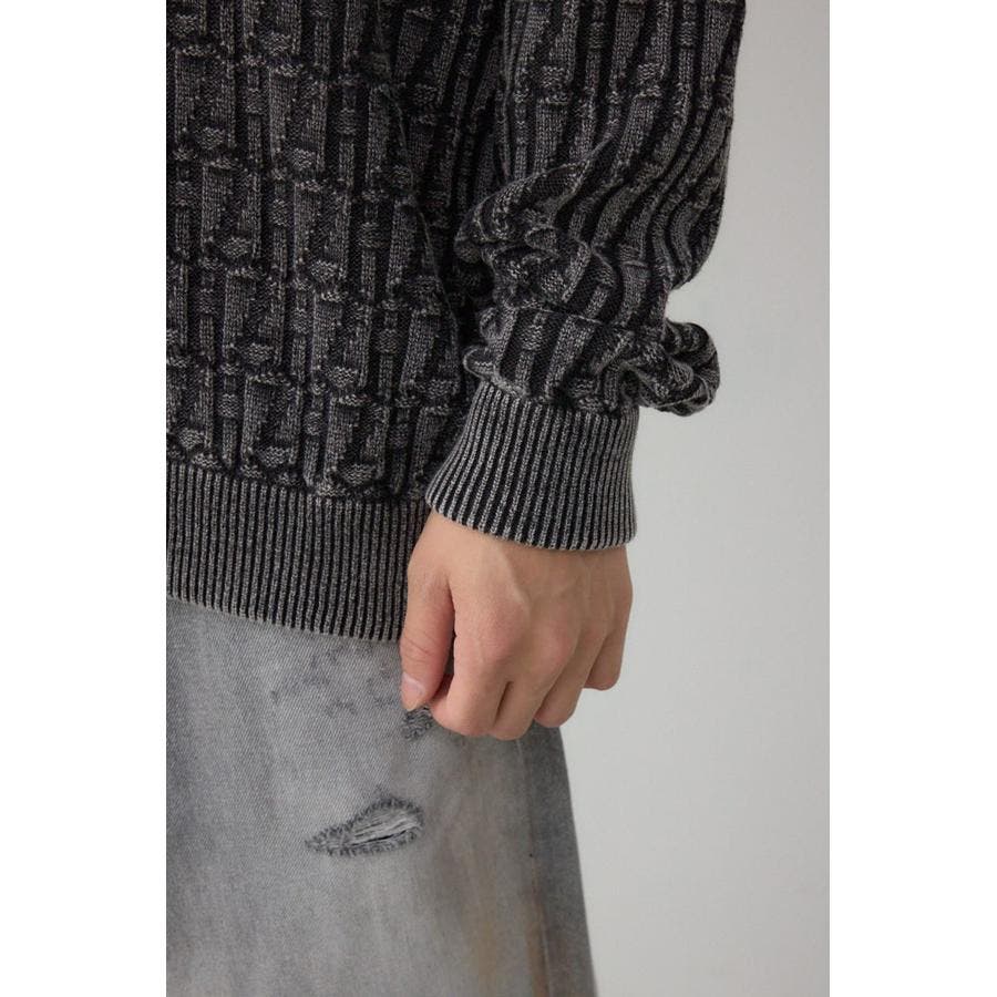 硫化染めとストーンウォッシュ加工による、ヴィンテージライクな表情が特徴のピグメントジャガードニットトップスです。
