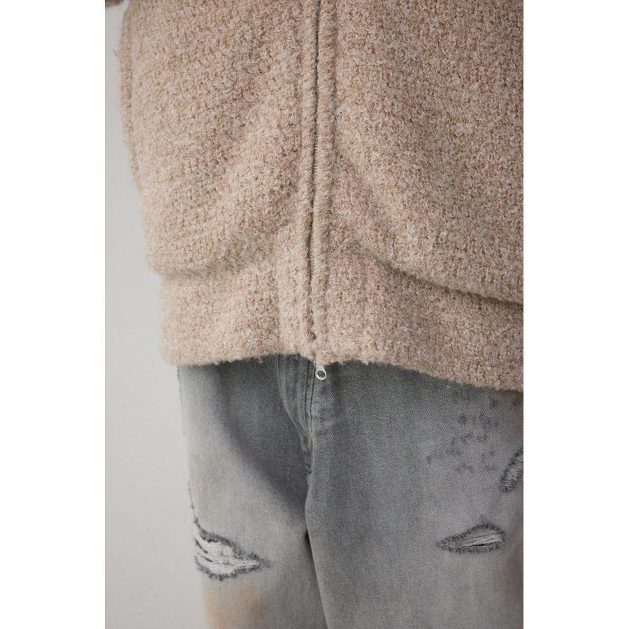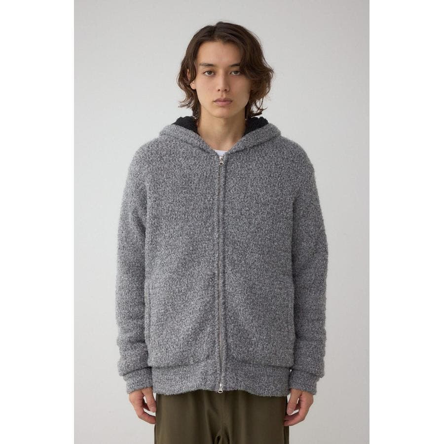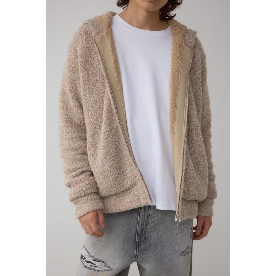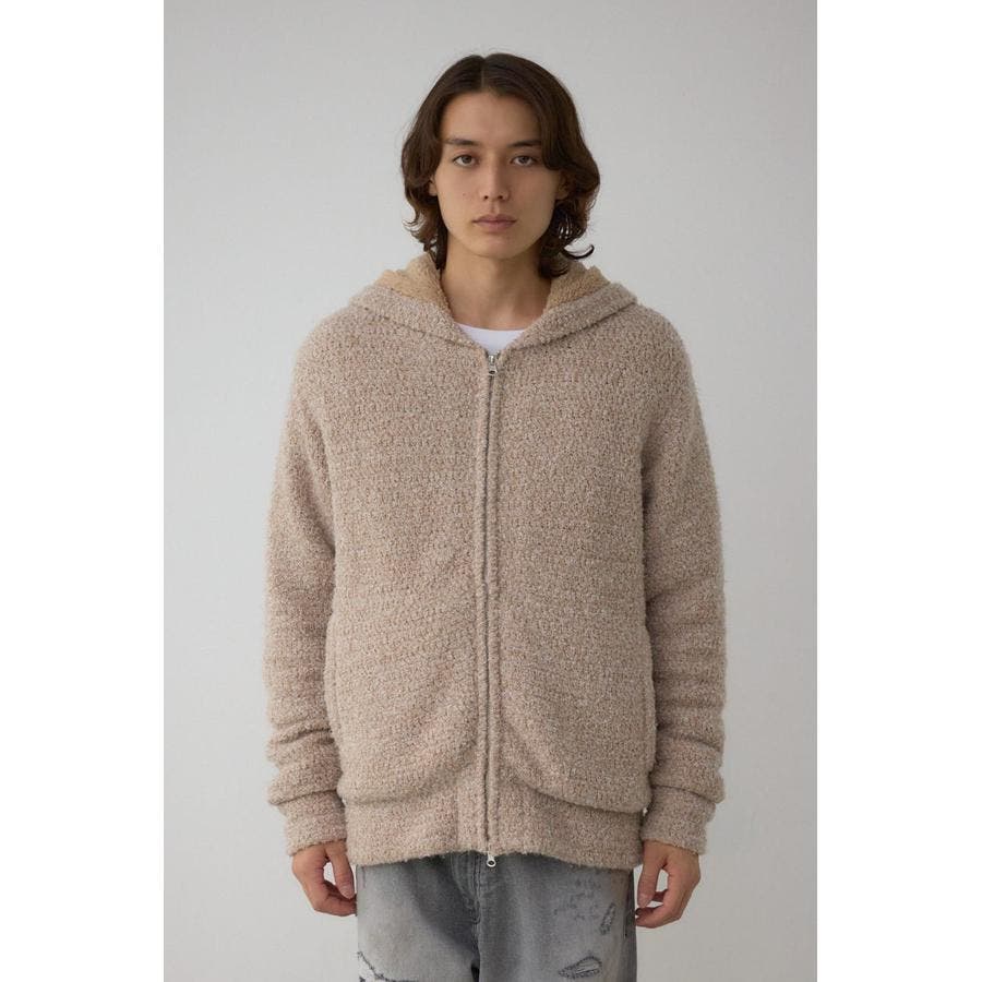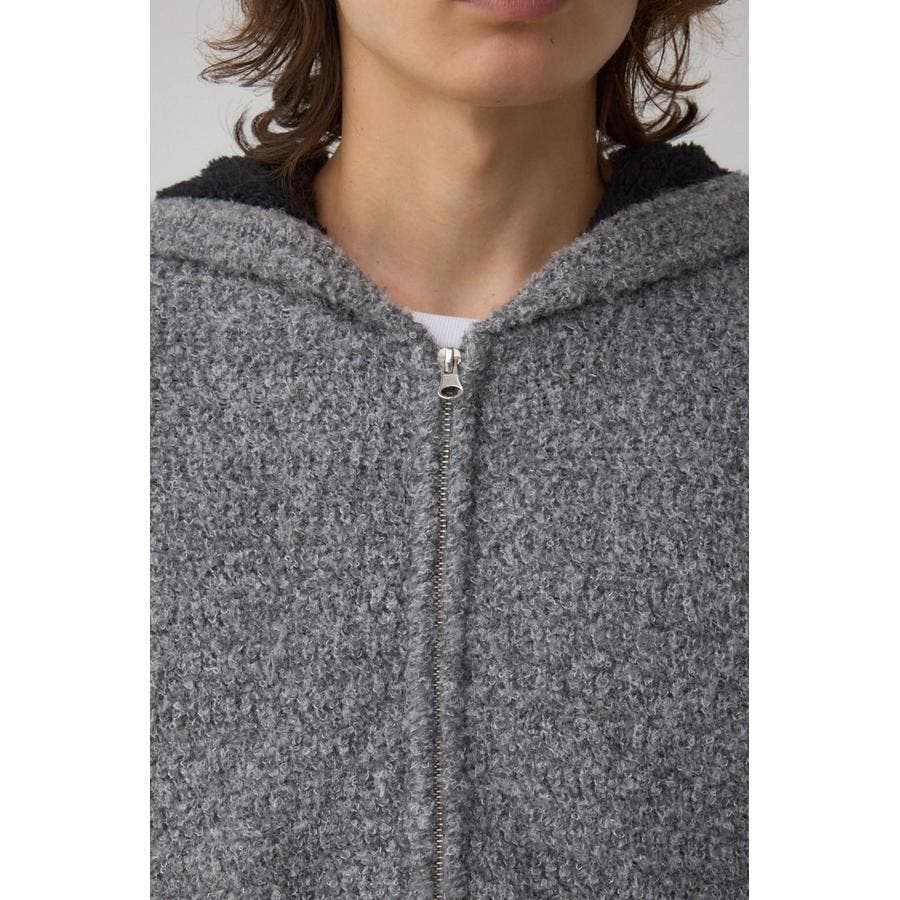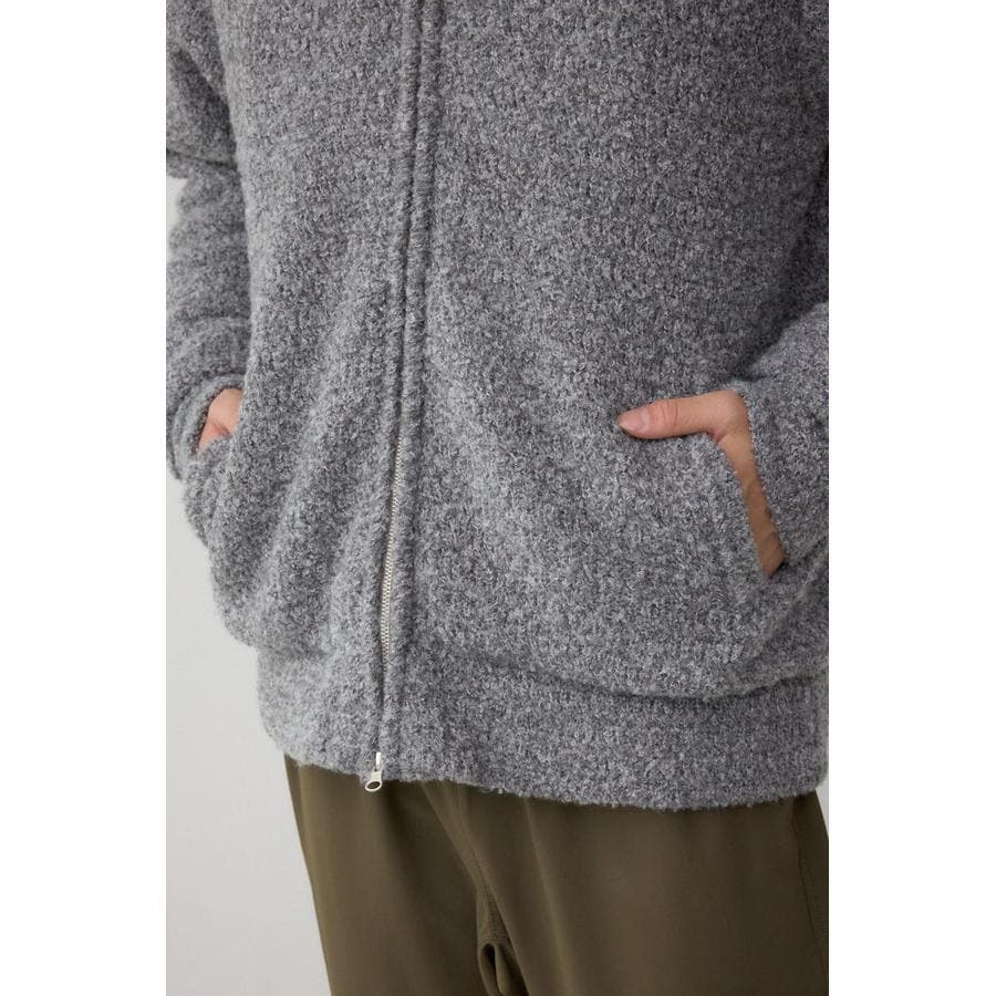 ブークレー糸のミドルゲージ柄編みでミックス感と温もりを演出したジップパーカーです。