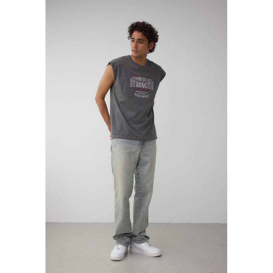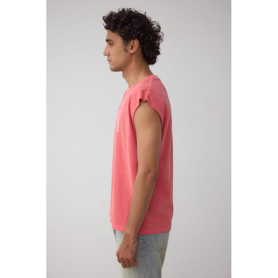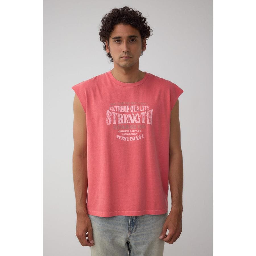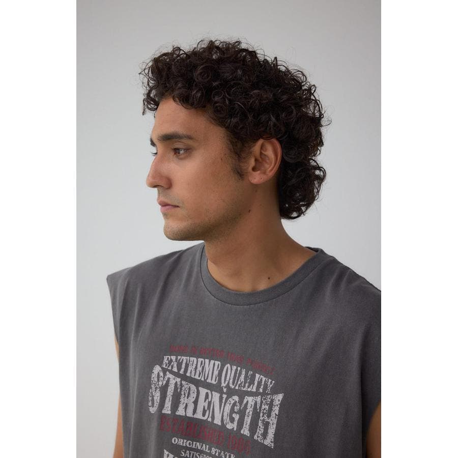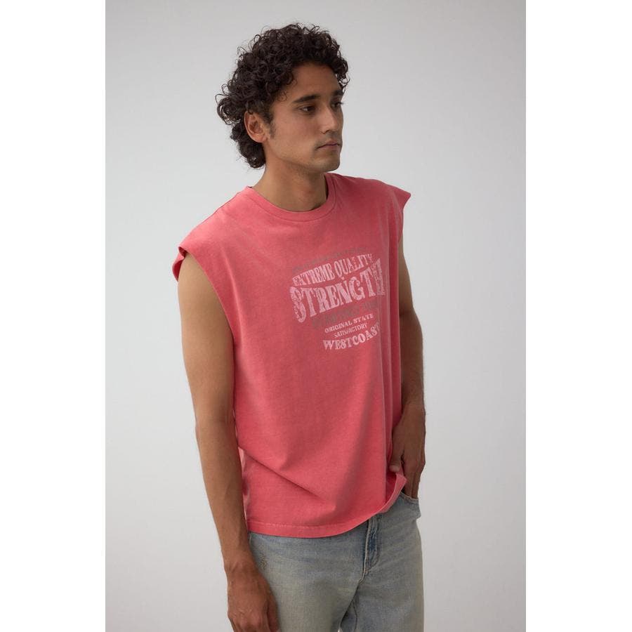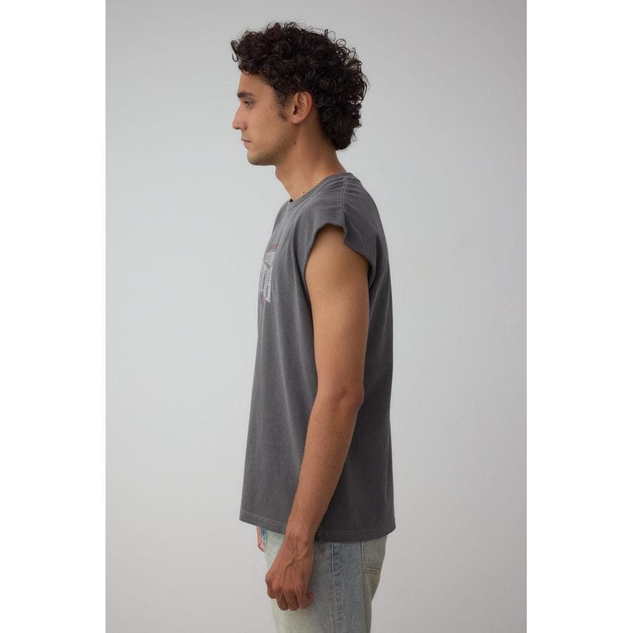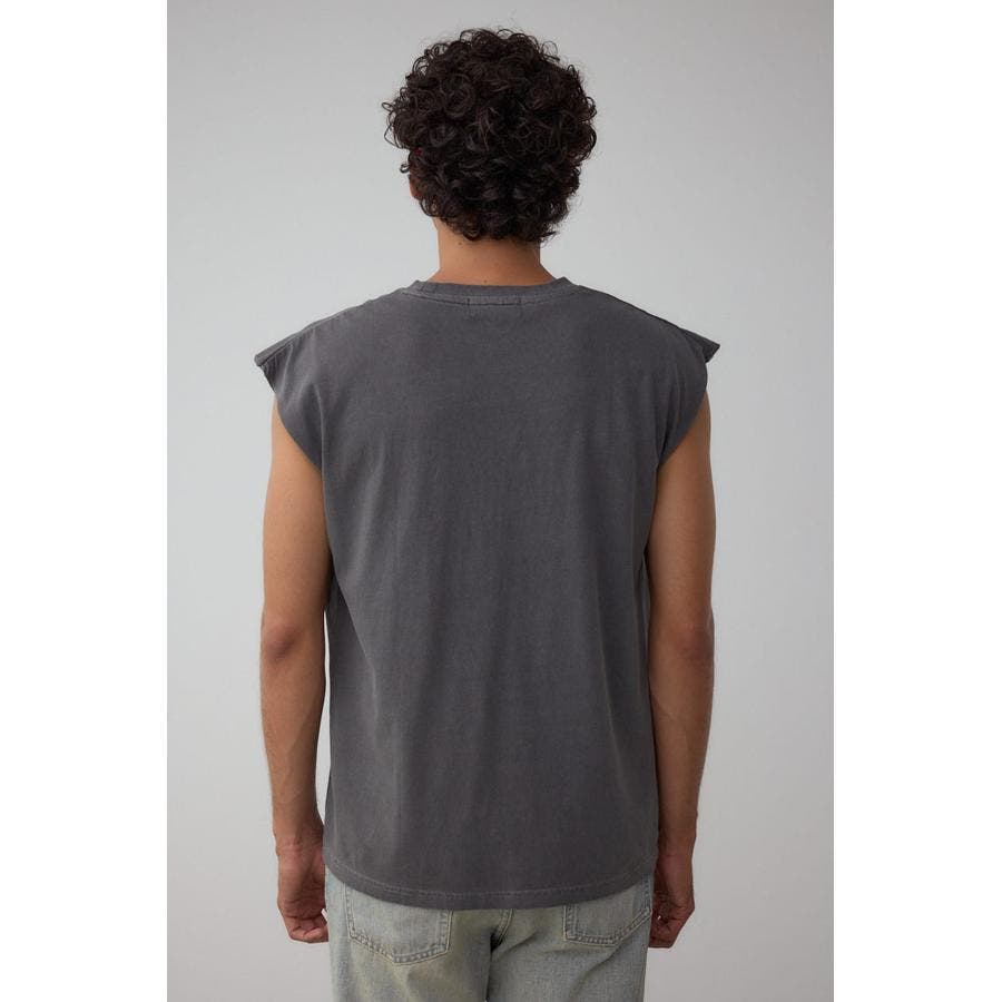 ピグメント加工がかっこいいグラフィックノースリーブトップスになります。
