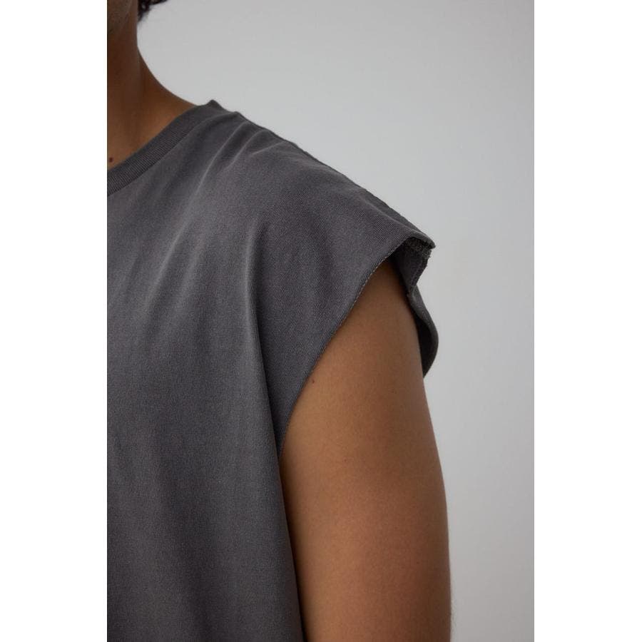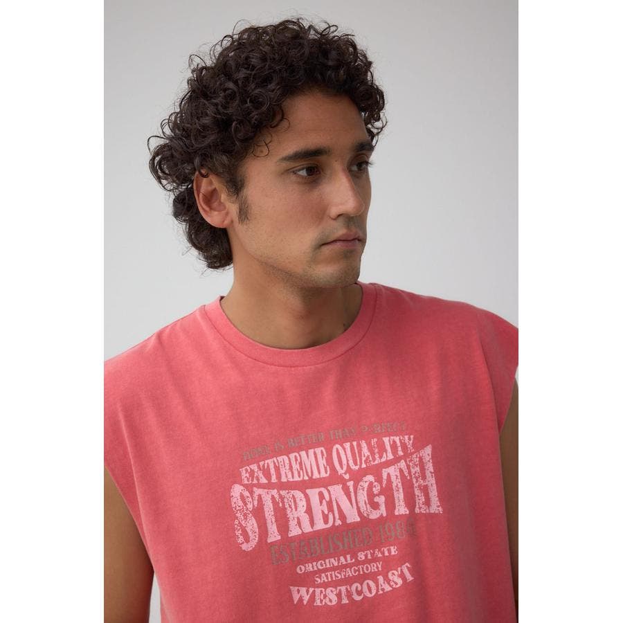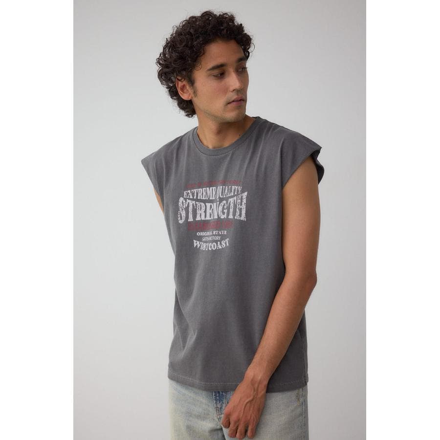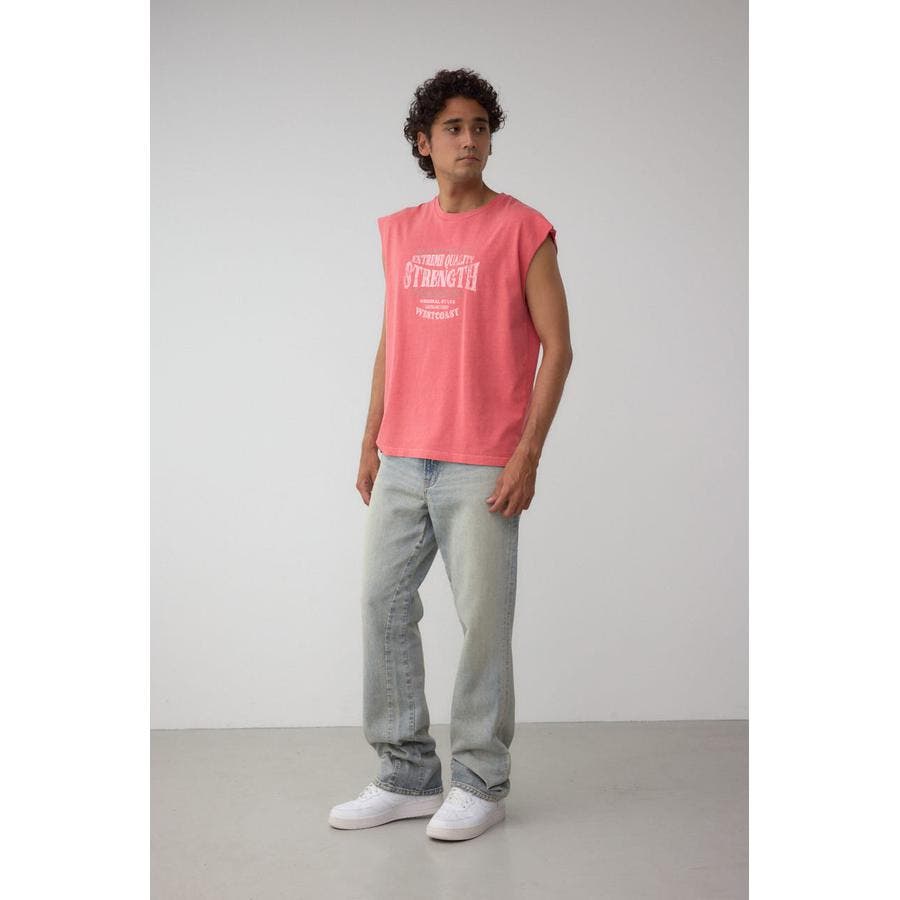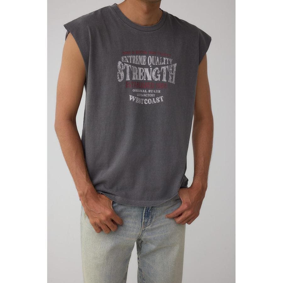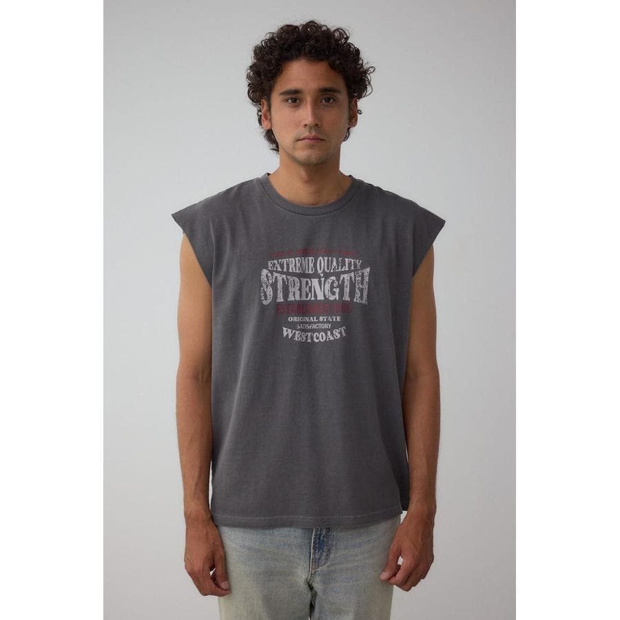 ピグメント加工がかっこいいグラフィックノースリーブトップスになります。