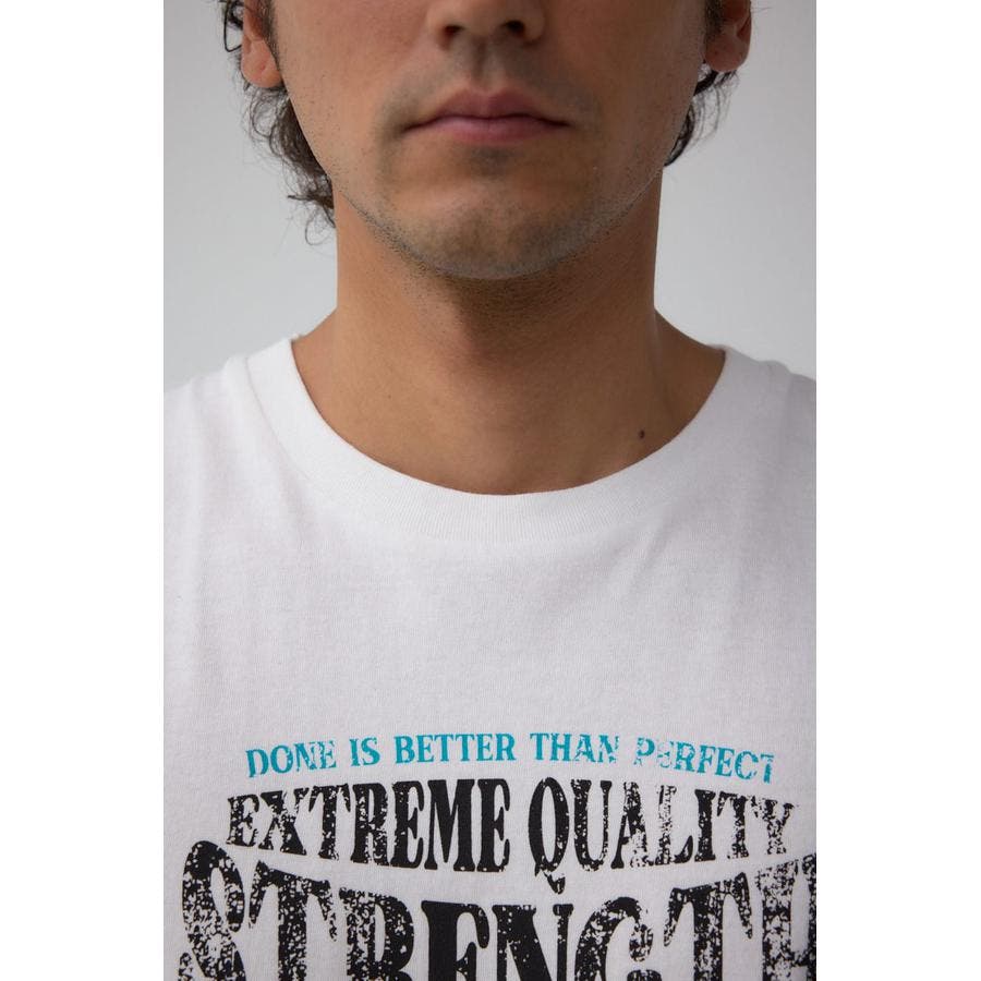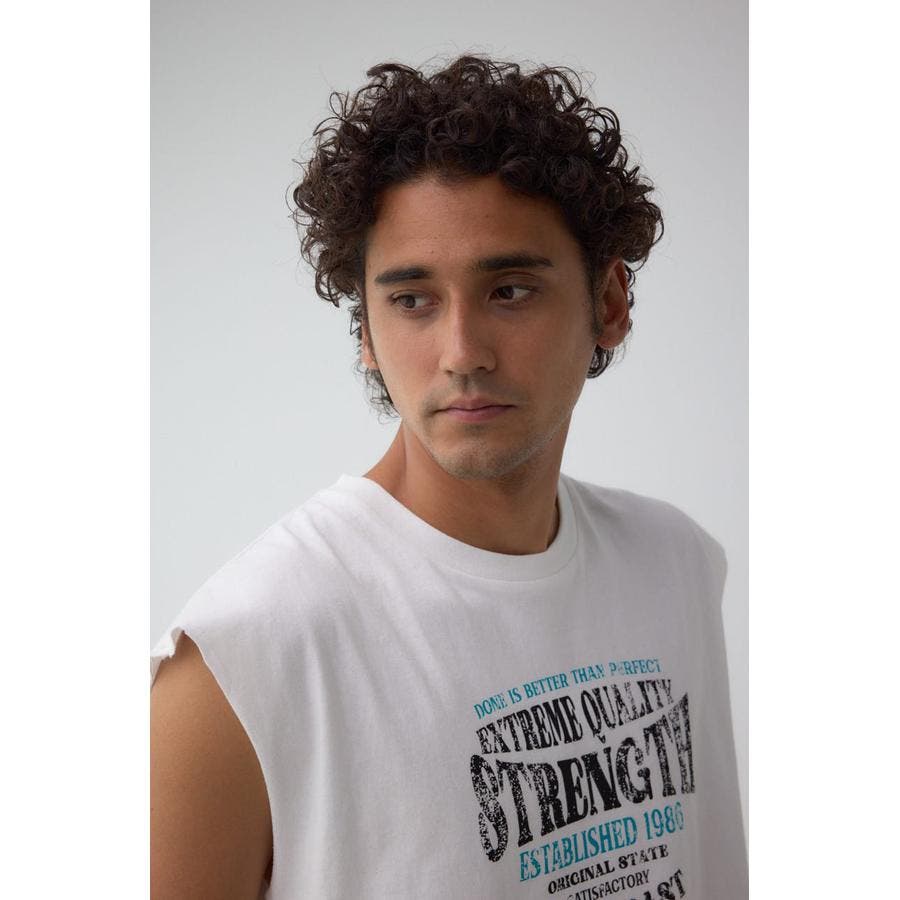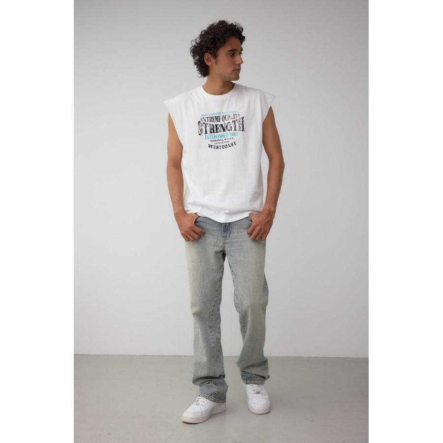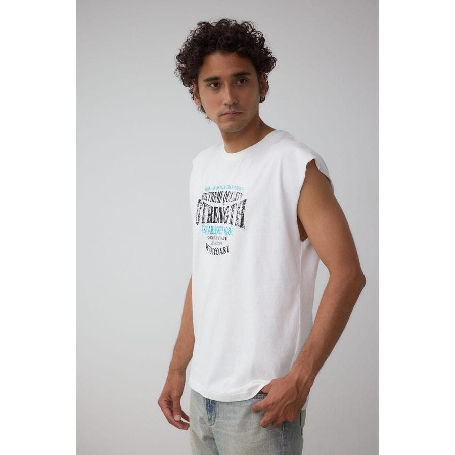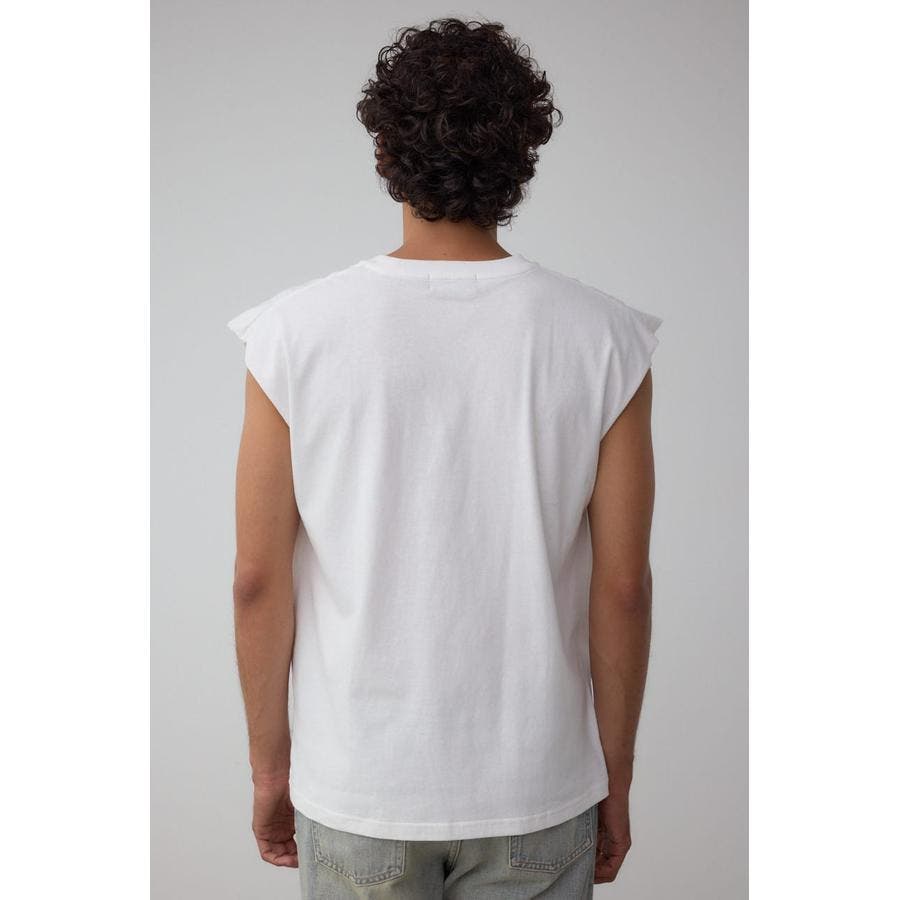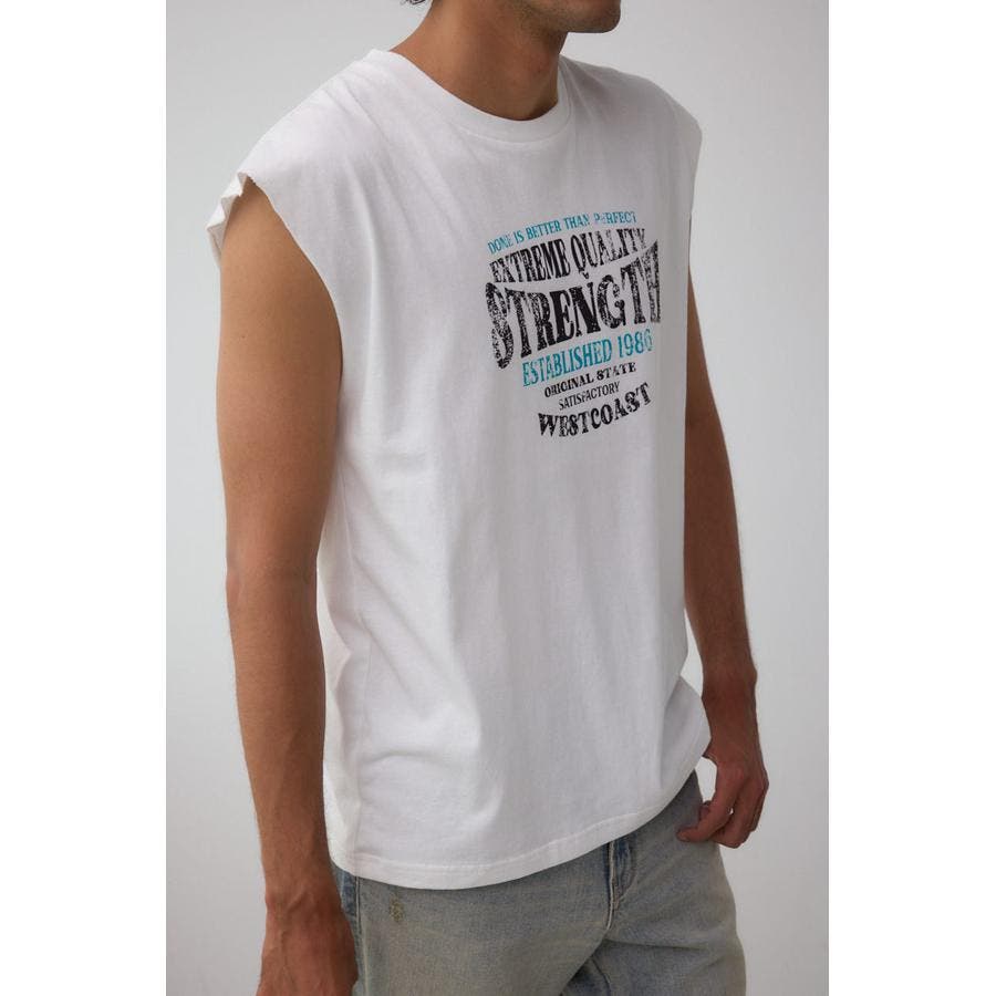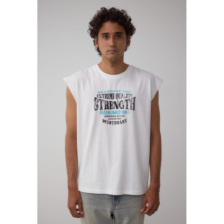 ピグメント加工がかっこいいグラフィックノースリーブトップスになります。