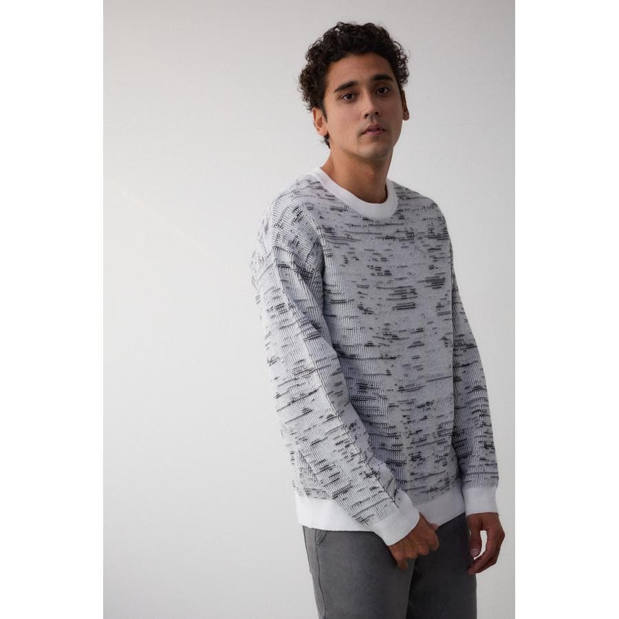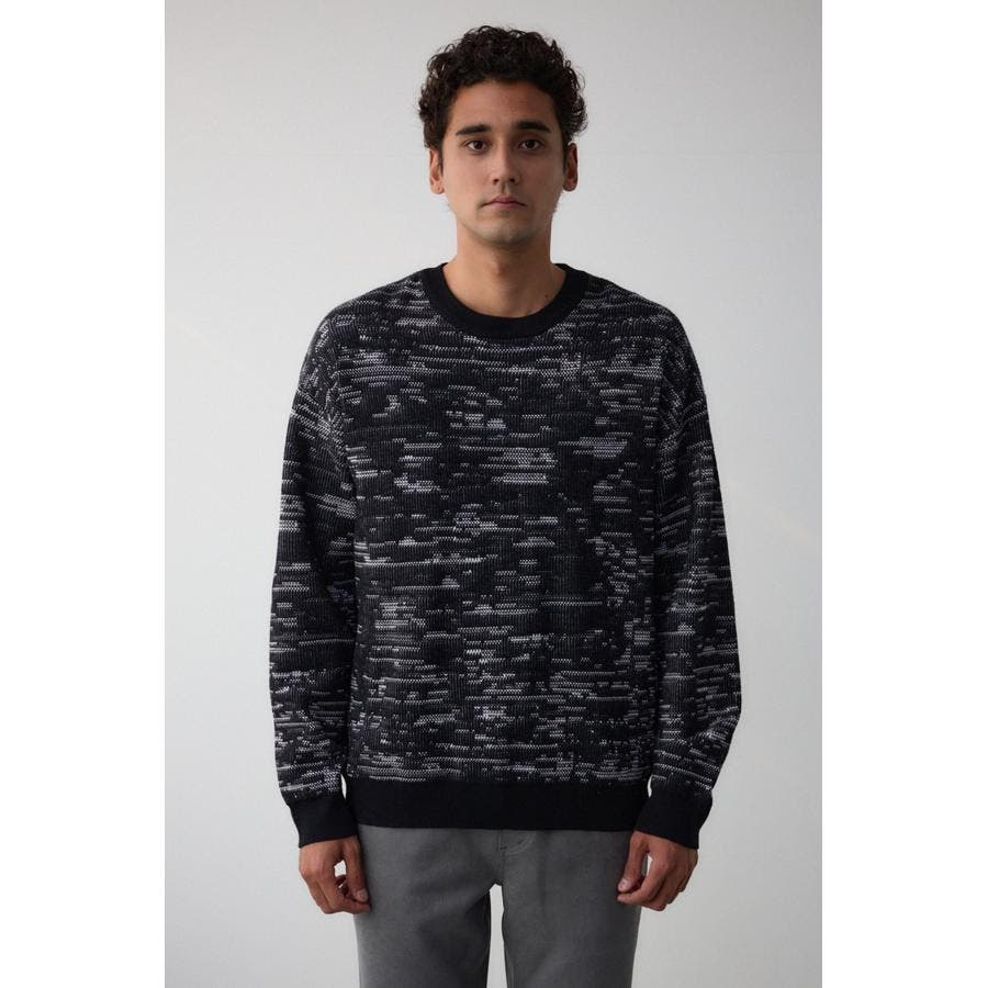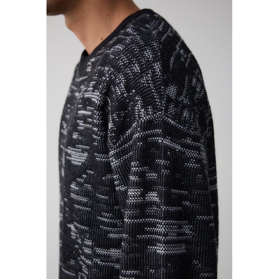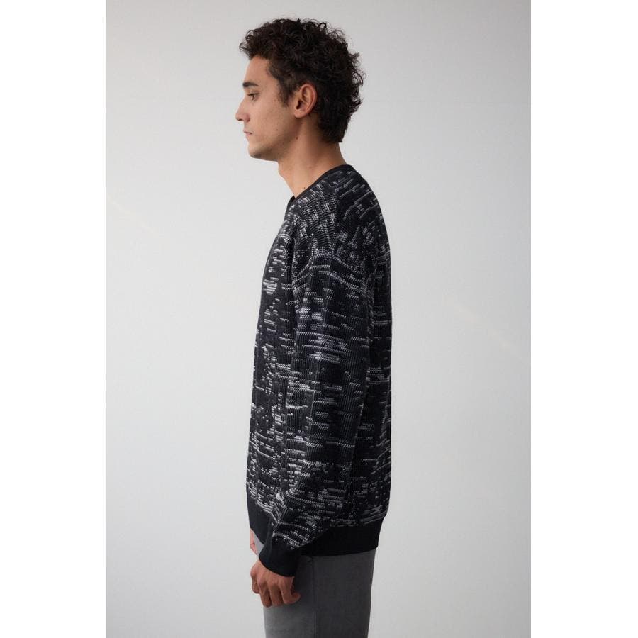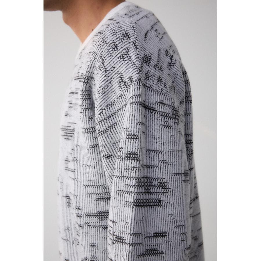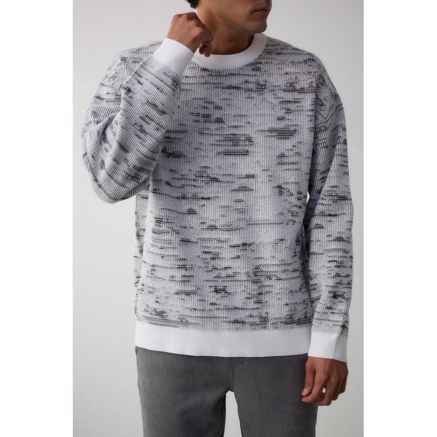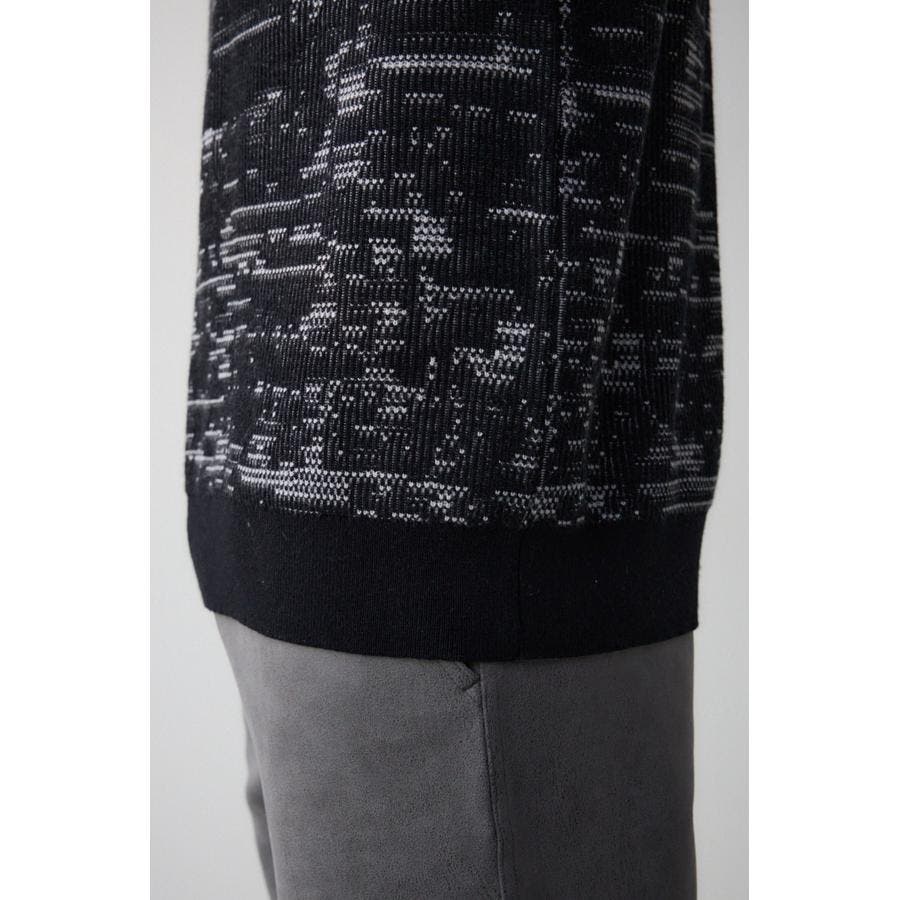毛羽感とストレッチ性のある糸をダブルジャガード編みで、杢調のコントラストを編み柄で表現することにより、アブスト柄のニットに仕上げました。