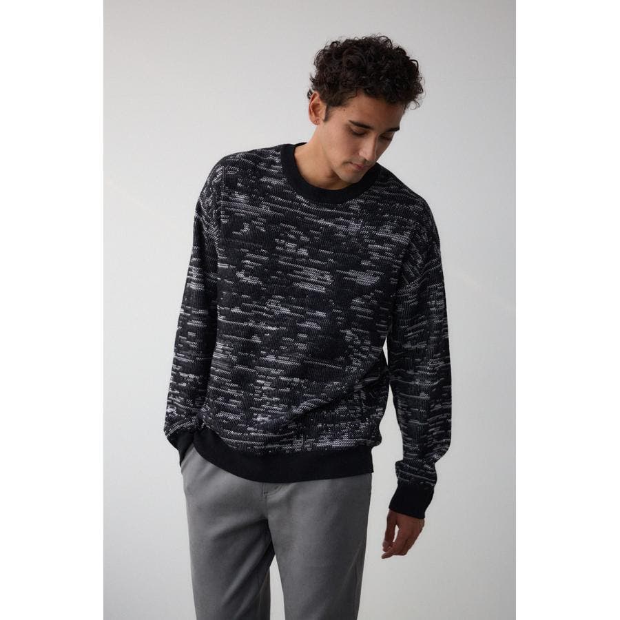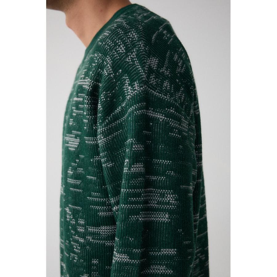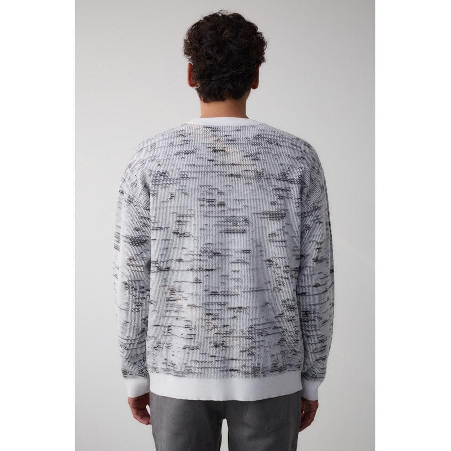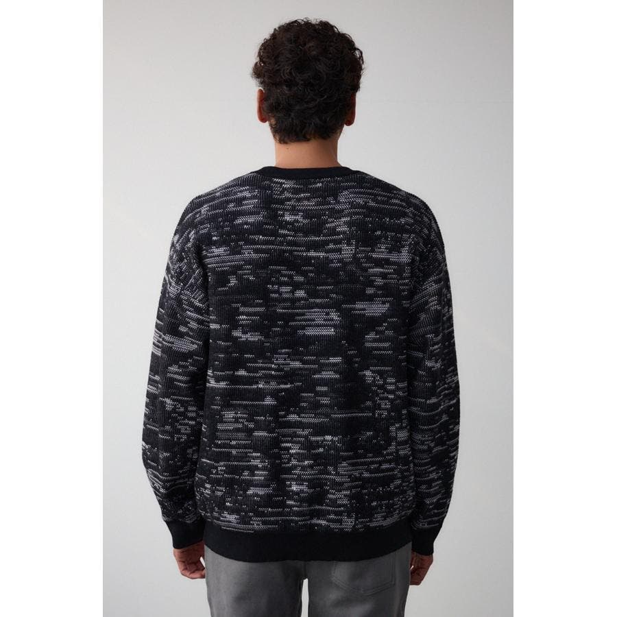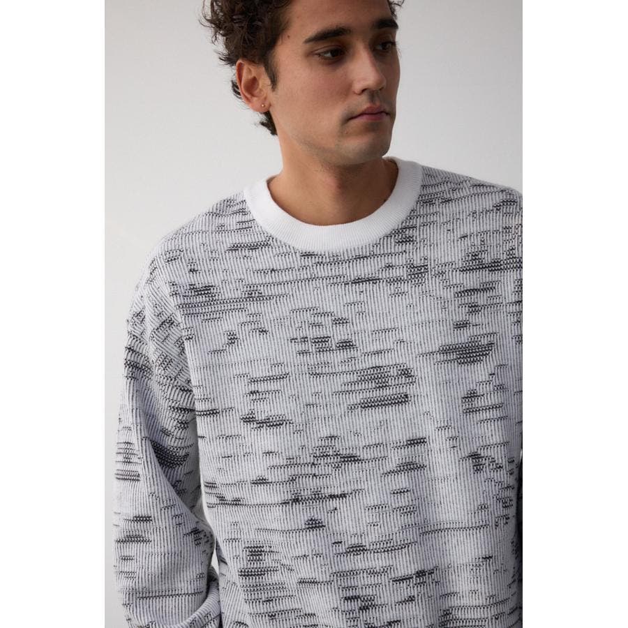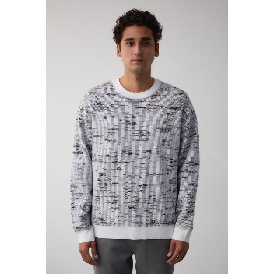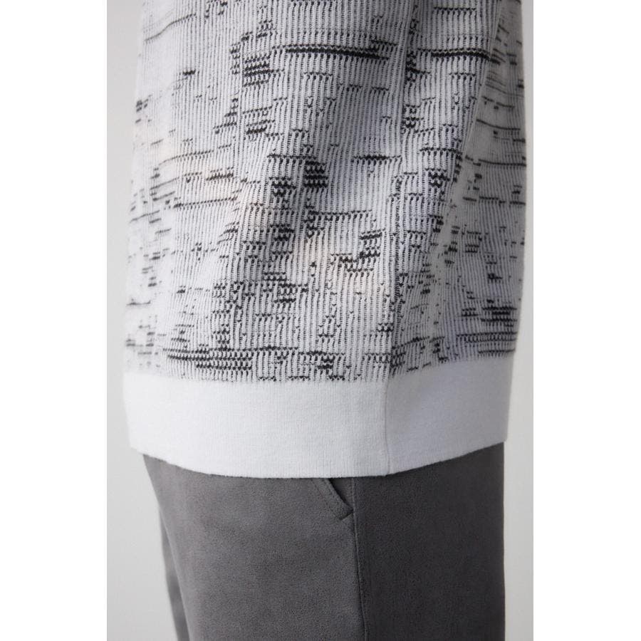 毛羽感とストレッチ性のある糸をダブルジャガード編みで、杢調のコントラストを編み柄で表現することにより、アブスト柄のニットに仕上げました。