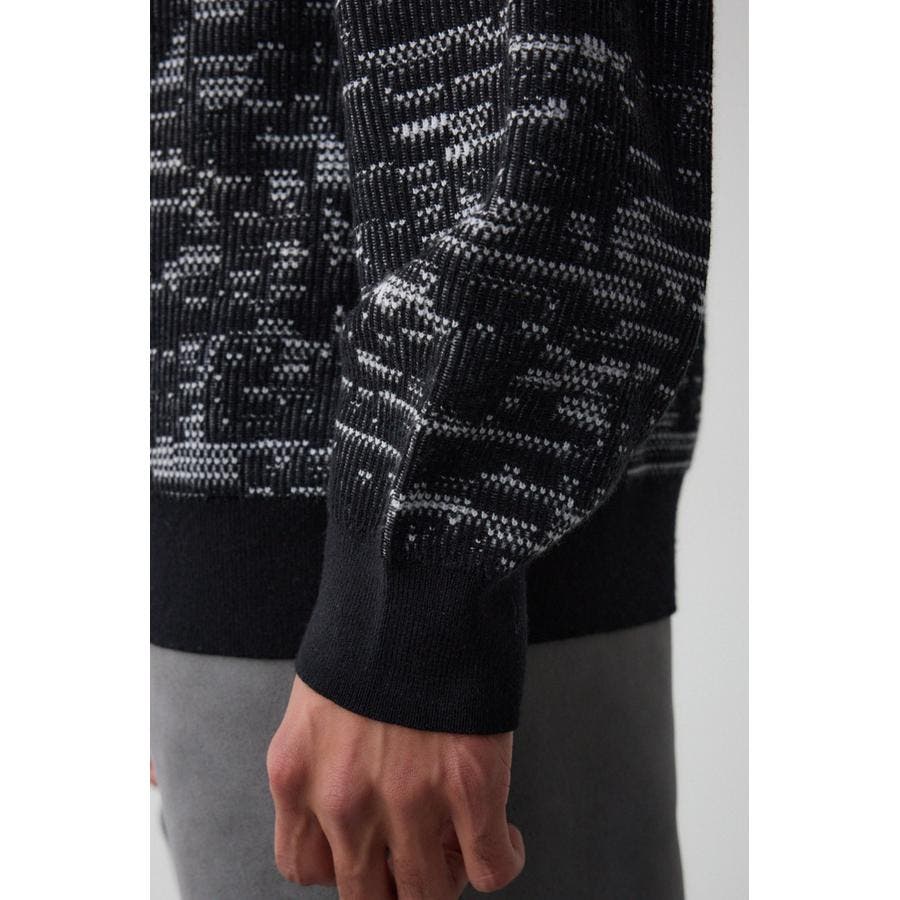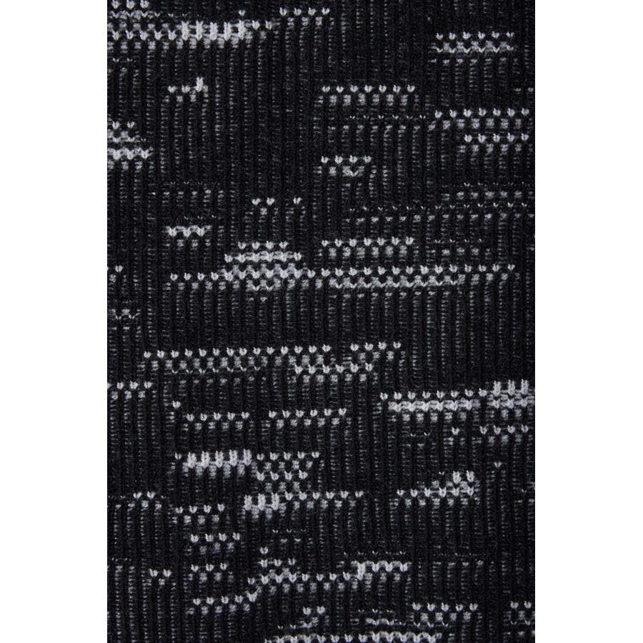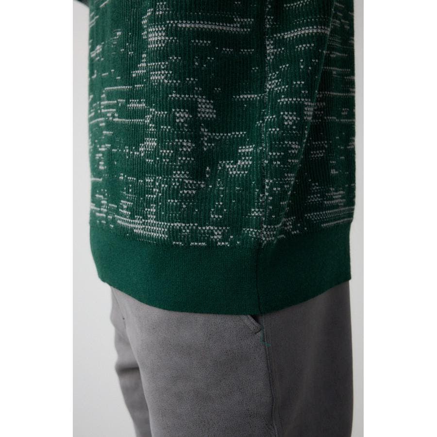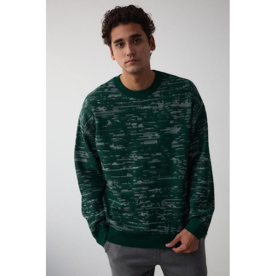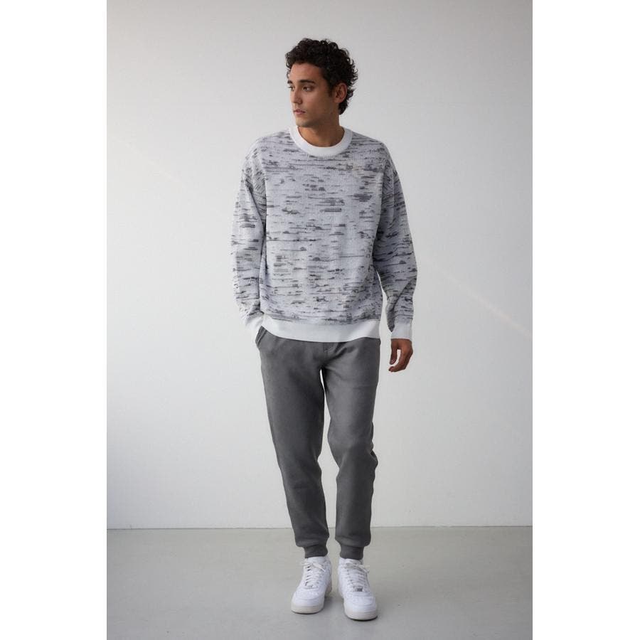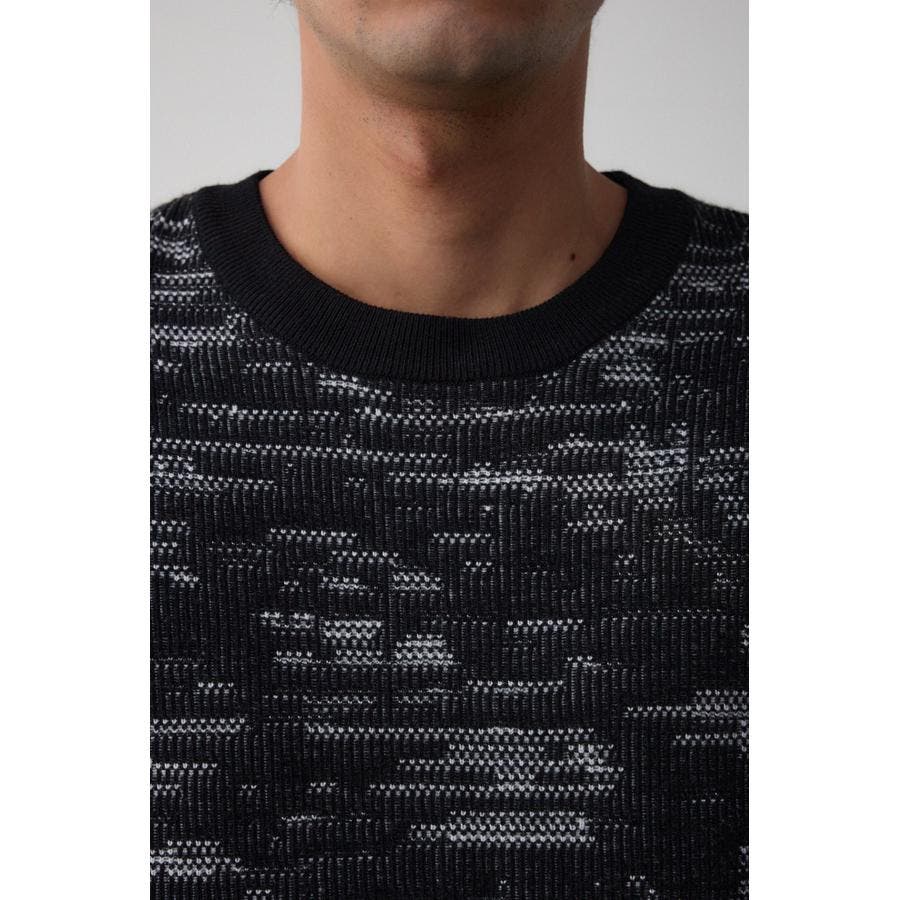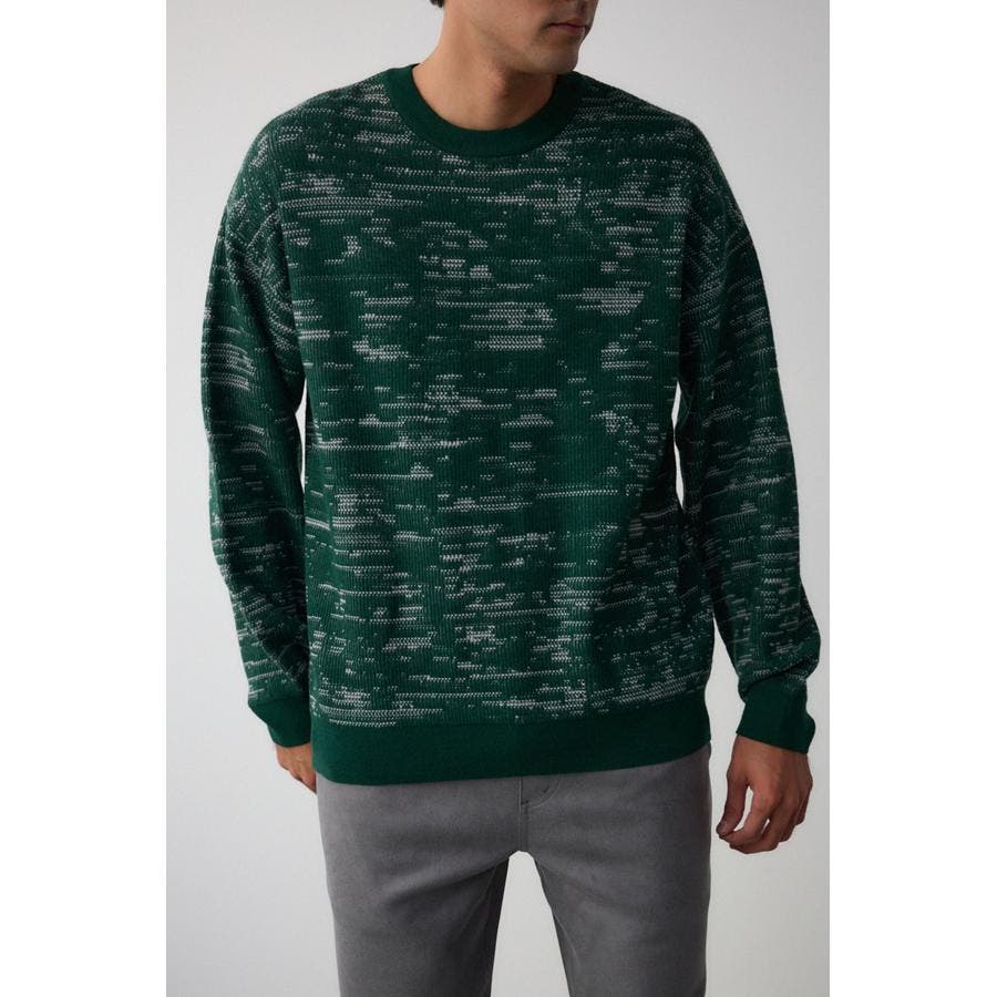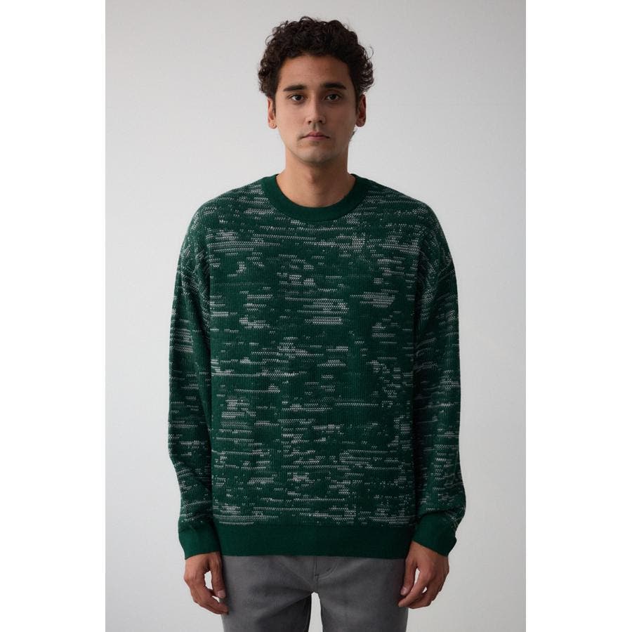 毛羽感とストレッチ性のある糸をダブルジャガード編みで、杢調のコントラストを編み柄で表現することにより、アブスト柄のニットに仕上げました。