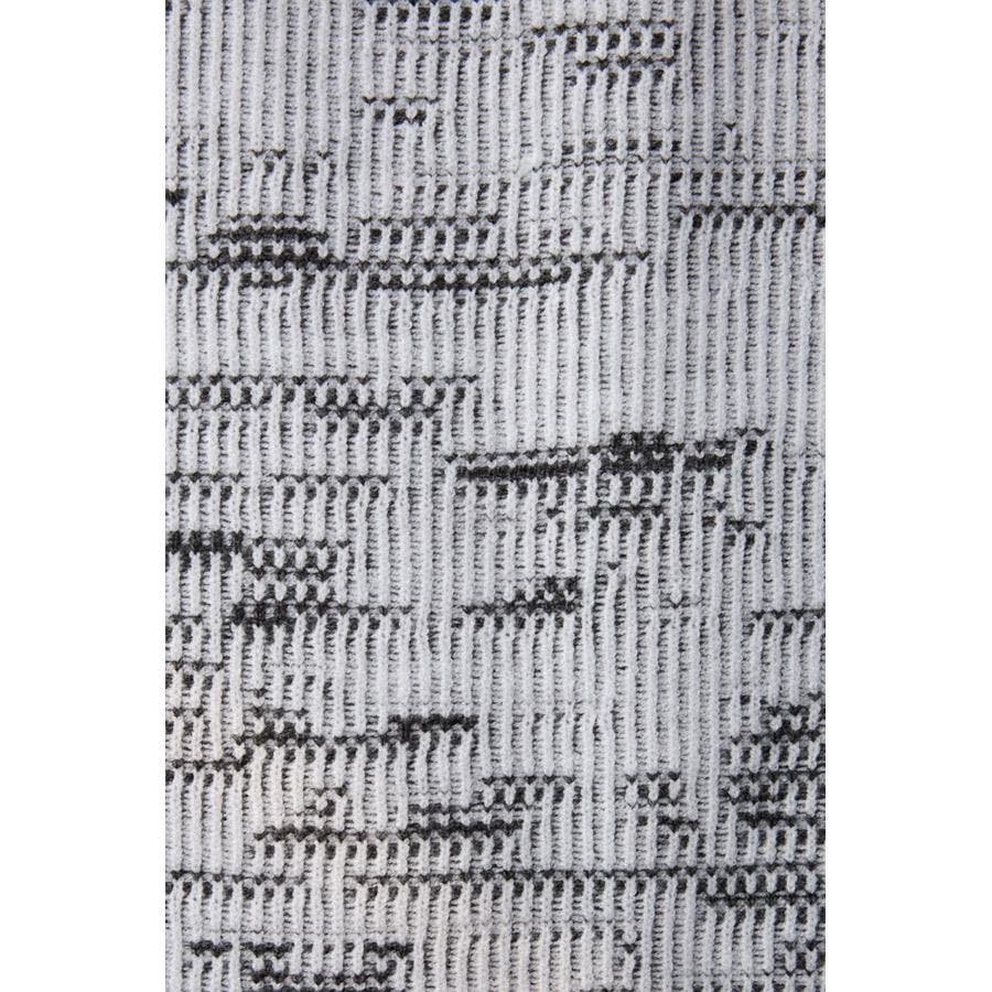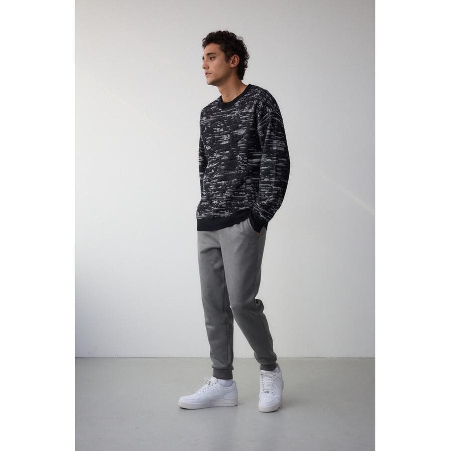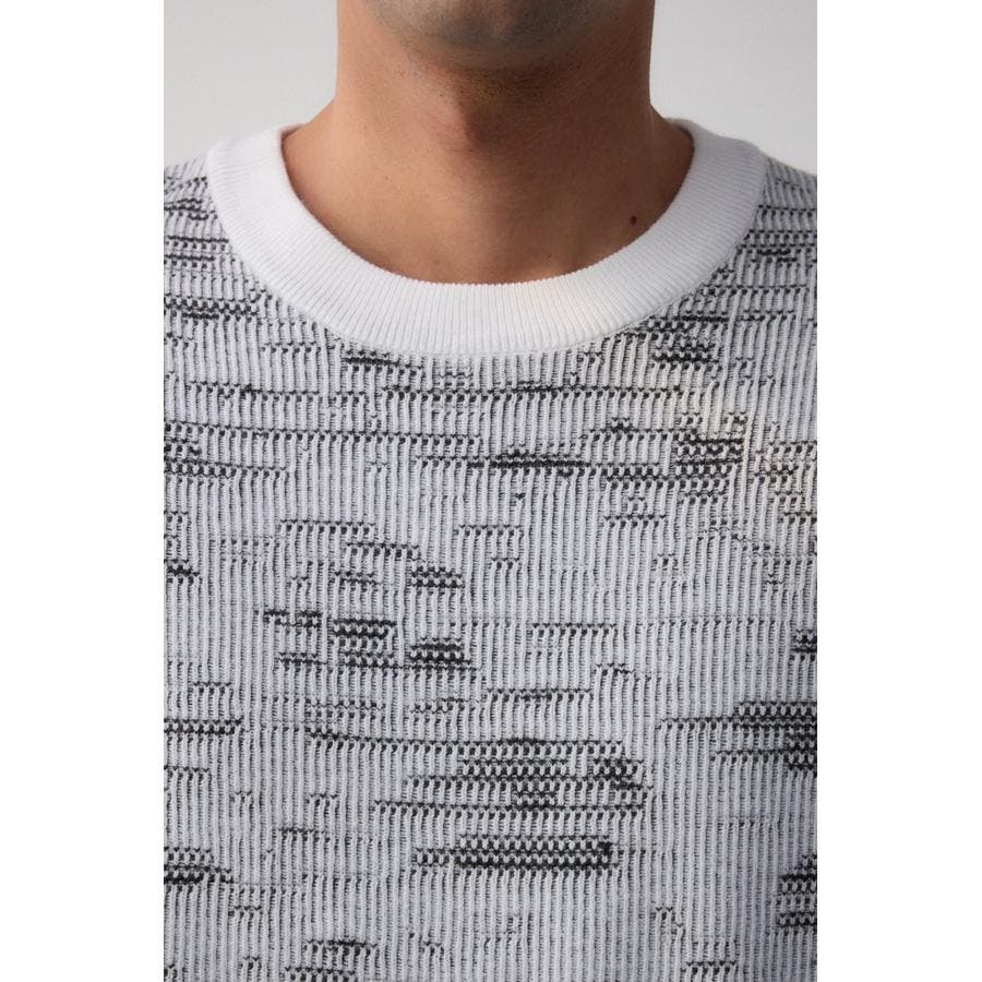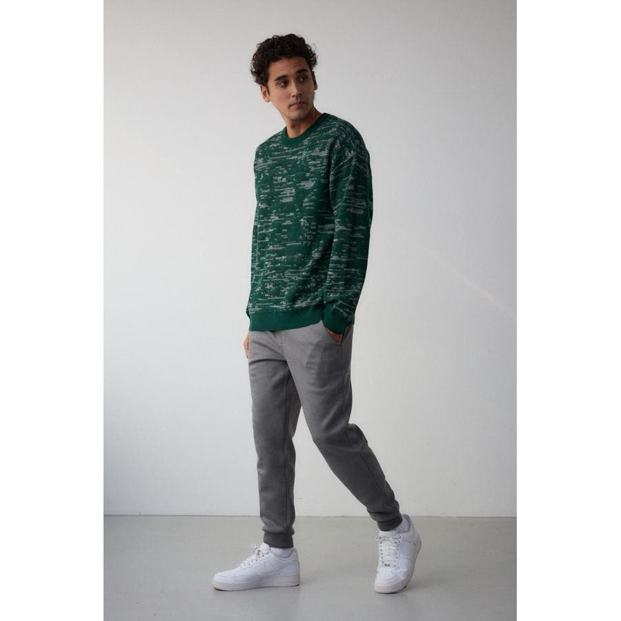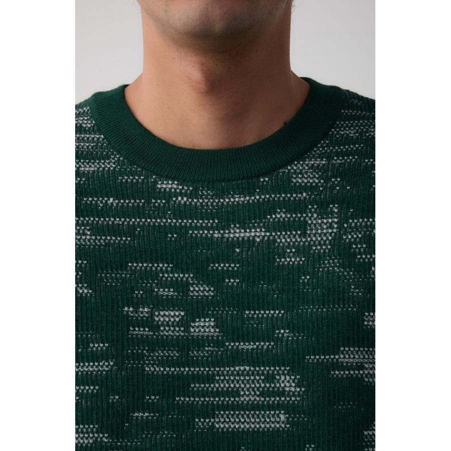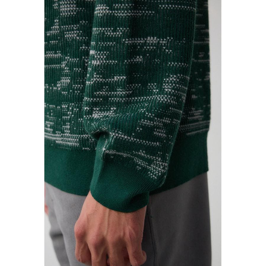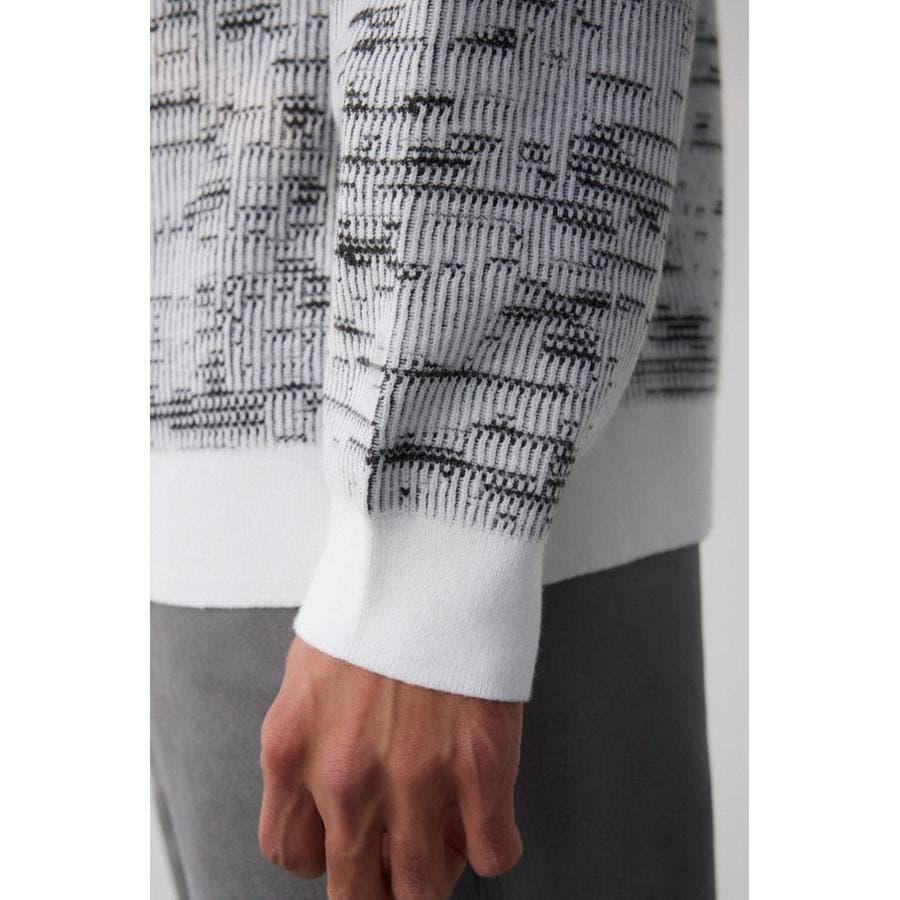 毛羽感とストレッチ性のある糸をダブルジャガード編みで、杢調のコントラストを編み柄で表現することにより、アブスト柄のニットに仕上げました。