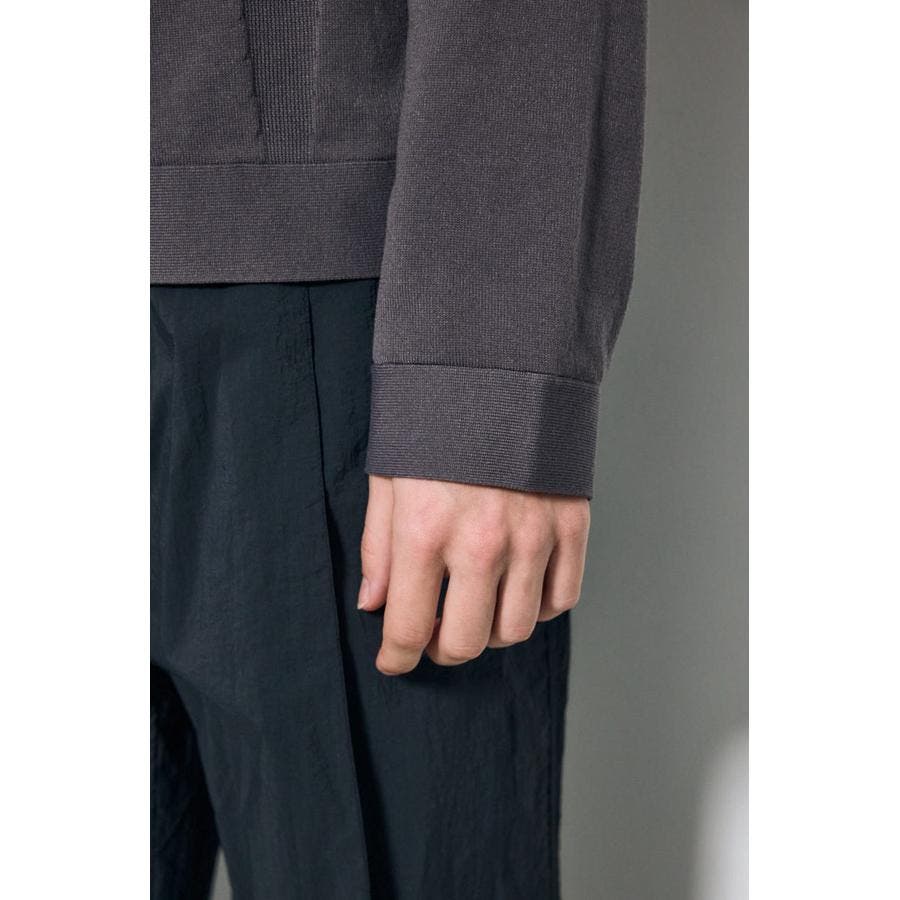 ドライタッチな風合いの素材にストレッチ糸を編み込み、ほどよい厚みとボリューム感を持たせつつ、ソフトな着心地に仕上げた生地を使用。