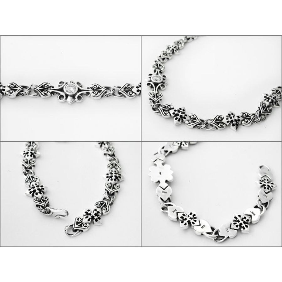 ブレスレット全体にバロック模様を彷彿させる細かい調金が施され中央にはジルコニアがセットされています。クロスのサイドにハートのようなデザインがありますがこれは別々のパーツになり手首に添って曲がるようになっています。さらに厚みが4mm以内に抑えられているのでとても身に着けやすいブレスレットです。