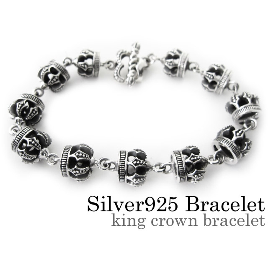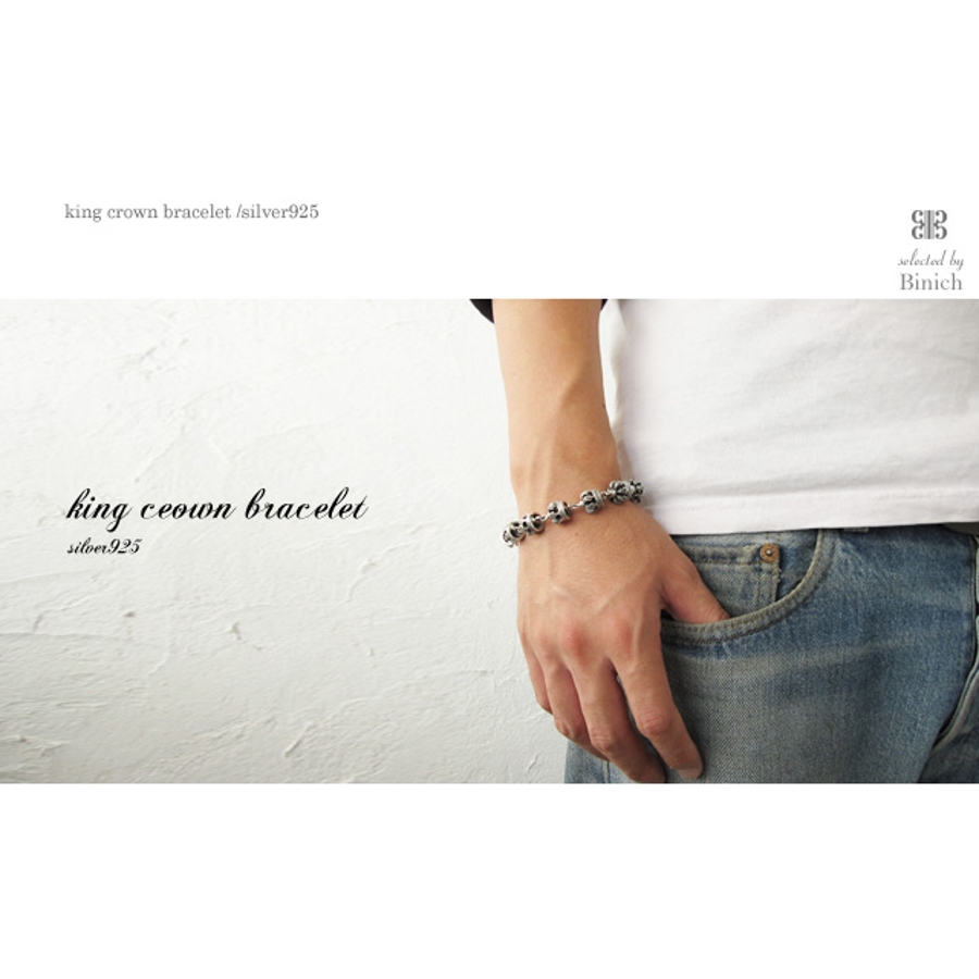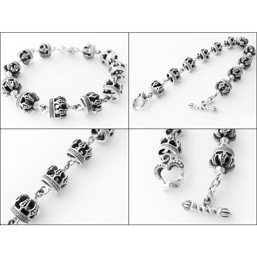 透かし彫りにより本物の様に彫金されたクラウンパーツを連結したシルバーブレスレット。全部で11個のクラウンパーツは一つ一つのクオリティーが高く高級感があり、サイズも大きめなので着けた時のゴツゴツ感が男らしいブレスレットです。