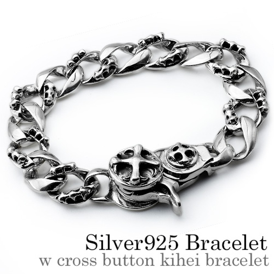 ずっしりとした重みが心地いい、デザイン喜平ブレスレット。手首のジャラっと感がシルバー好きには堪らない逸品!ジョイント部分にはそれぞれにクロスボタンが大きく配されシンプルながらも目を引くデザインに。気品とワイルドさを兼ね備えた贅沢なブレスレットです。