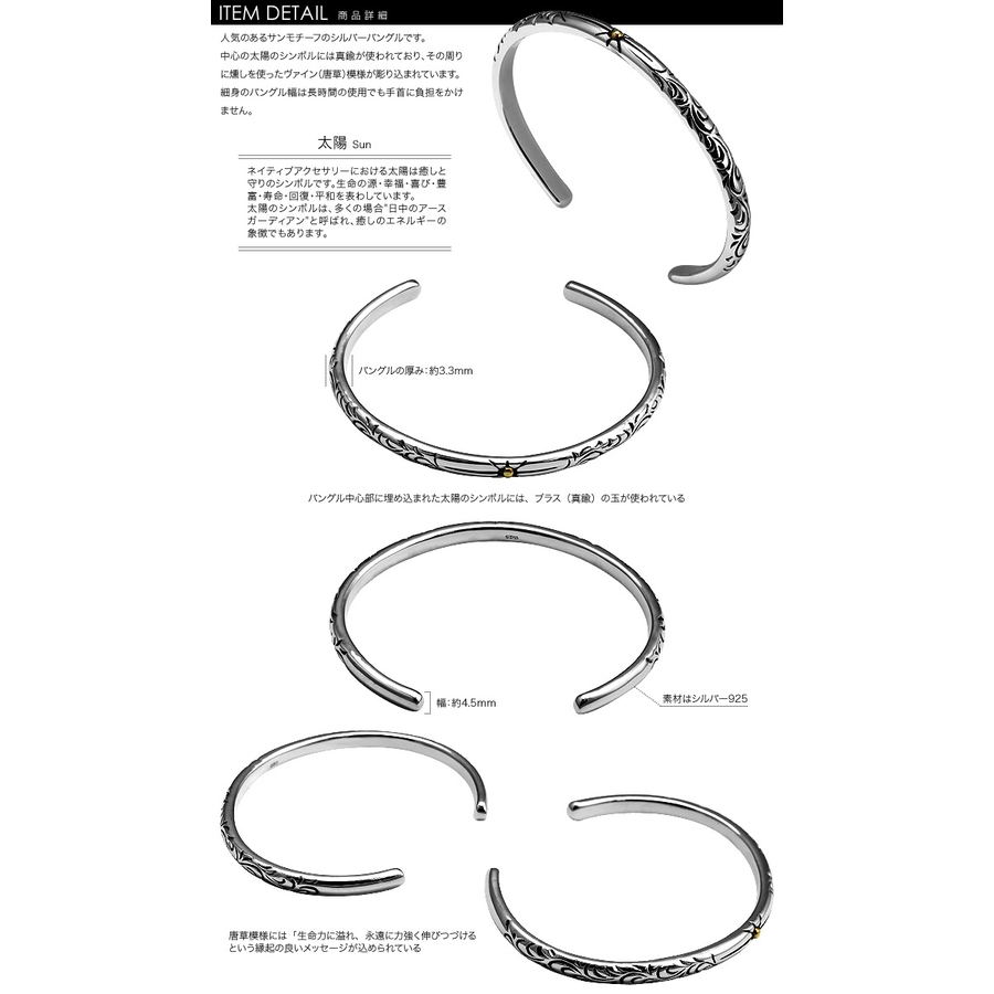 人気のあるサンモチーフのシルバーバングルです。中心の太陽のシンボルには真鍮が使われており、その周りに燻しを使ったヴァイン(唐草)模様が彫り込まれています。細身のバングル幅は長時間の使用でも手首に負担をかけません。