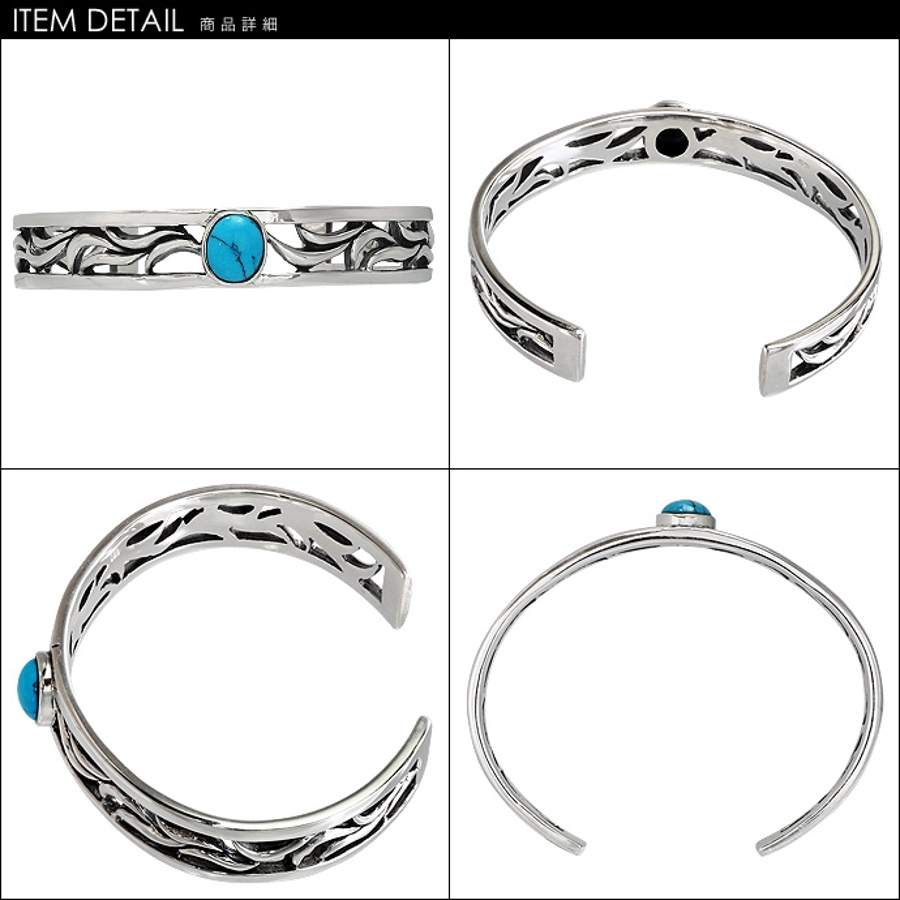 中心部のターコイズが目を引くヴァイン模様のバングルです。模様部分には透かし彫りが施され、シルバーの輝きをより引き立てます。腕元を上品に演出するユニセックスデザインで、男女問わずお使いいただけるアクセです。