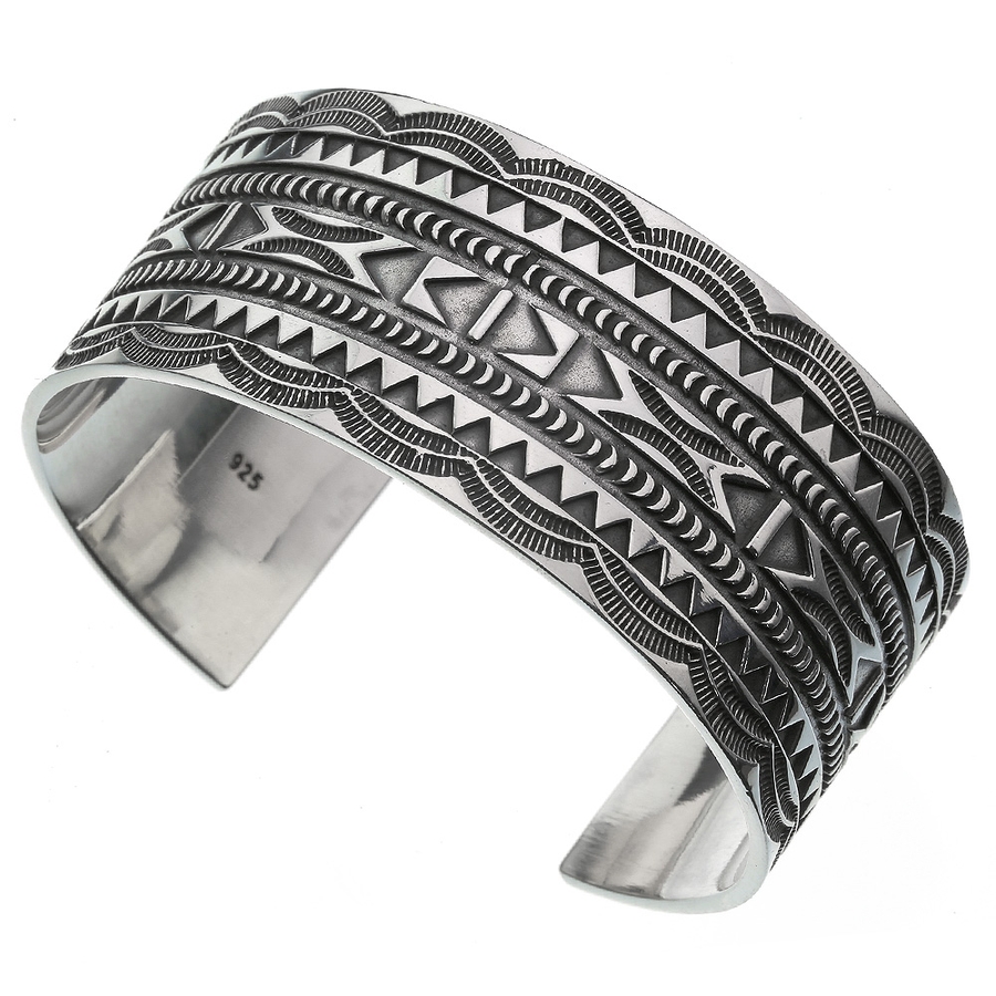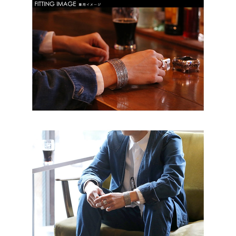 幅広な平打ちバングルにネイティブ系の模様を彫金したアイテムです。細かな彫金には燻し加工が施され、シルバーとブラックのコントラストが手首で静かに存在感を放ちます。ワイドでしっかりとした厚みと重量感があるバングルは、ワイルドで骨太なネイティブ感を演出してくれます。