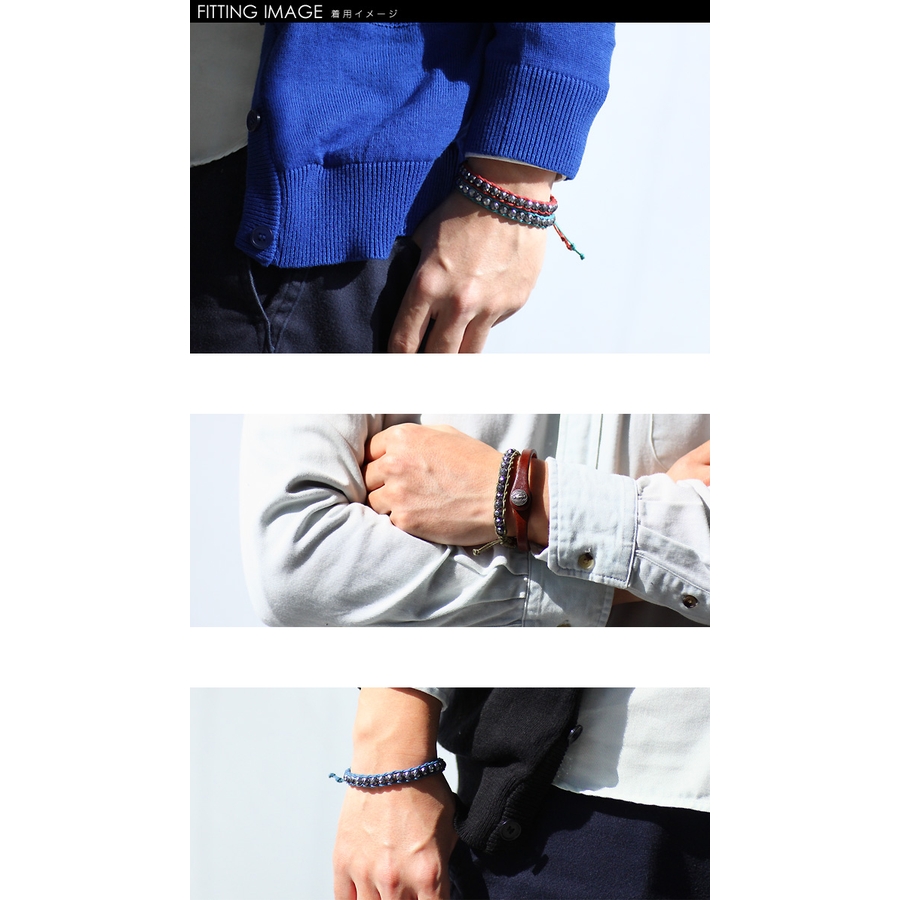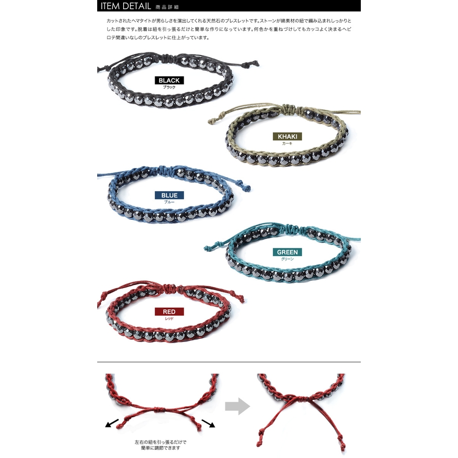 カットされたヘマタイトが男らしさを演出してくれる天然石のブレスレットです。ストーンが綿素材の紐で編み込まれしっかりとした印象です。脱着は紐を引っ張るだけと簡単な作りになっています。何色かを重ねづけしてもカッコよく決まるヘビロテ間違いなしのブレスレットに仕上がっています。