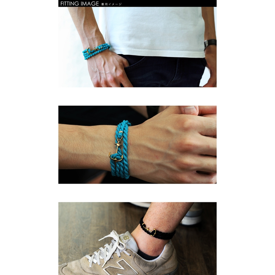 マリンスタイルの定番モチーフ・錨(いかり)と、それに結んだロープをイメージしたブレスレットです。馴染み良く肌触りの柔らかなコットン製のコードはポップな全4色をご用意。結び目を持ちコードを引っ張ることでサイズ調節が可能です。ゴールドカラーの錨チャームがアクセントになっており、爽やかなマリンスタイルに合わせて着けたいアイテムです。