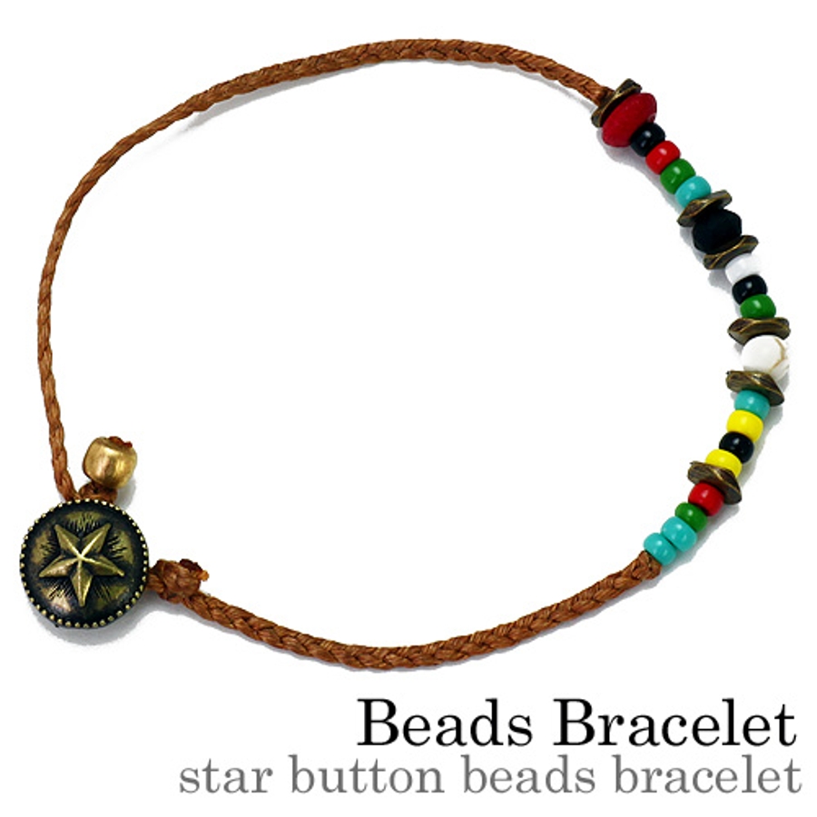 ブラウンのコードに対照的なカラフルなビーズをあしらったブレスレット。