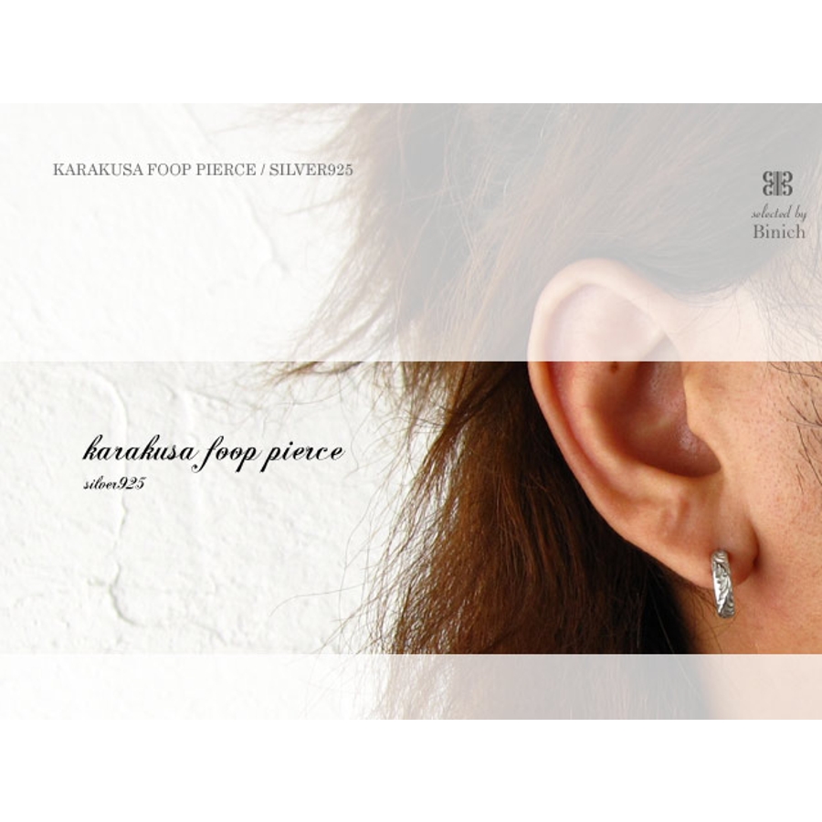 唐草模様がデザインされたフープ型のピアス。いぶし加工などを施していないのでシルバーの質感、色合いを残した珍しいピアスです。片耳に穴が二つ以上空いている人にはほかのピアスにとても合わせやすい一品です。