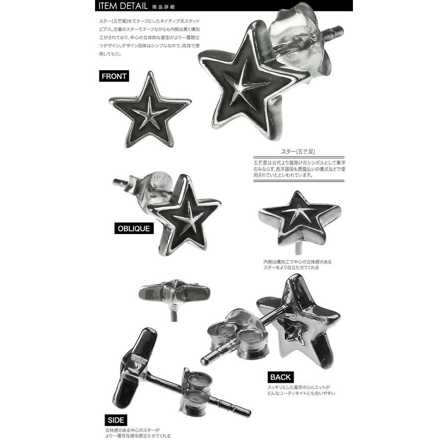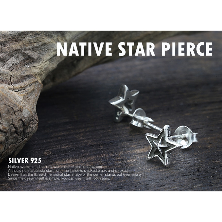 スター(五芒星)をモチーフにしたネイティブ系スタッドピアス。 定番のスターモチーフながらも内側は黒く燻加工がされており、中心の立体的な星型がより一層際立つデザイン。 デザイン自体はシンプルなので、両耳で使用しても◎。