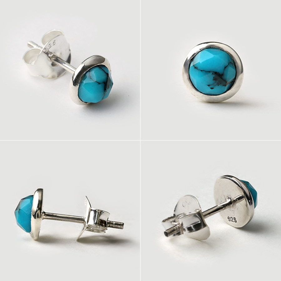 シンプルなラウンド型のスタッドピアスですが、ターコイズの表面には繊細なカッティングが施されており、「空の色」とも呼ばれる爽やかなブルーが耳元を飾り立ててくれます。小ぶりながら存在感があり、さり気なく付けるだけで注目されること間違いなし。不幸を払い幸運を呼ぶと言われており、お守りとして身に着けるのもオススメです。