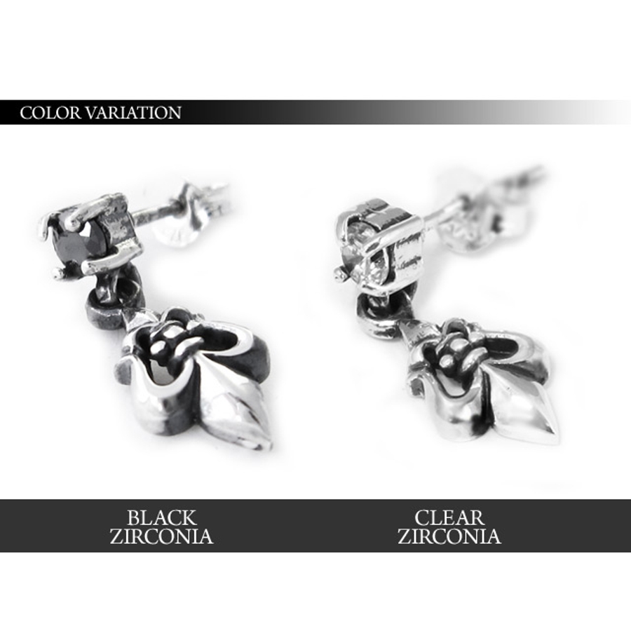 キュービックジルコニアを頭にセットし、フレアモチーフをぶら下げたドロップピアス。強めの燻し加工により重厚感のあるフォルムに仕上がっていて存在感のあるピアスです。