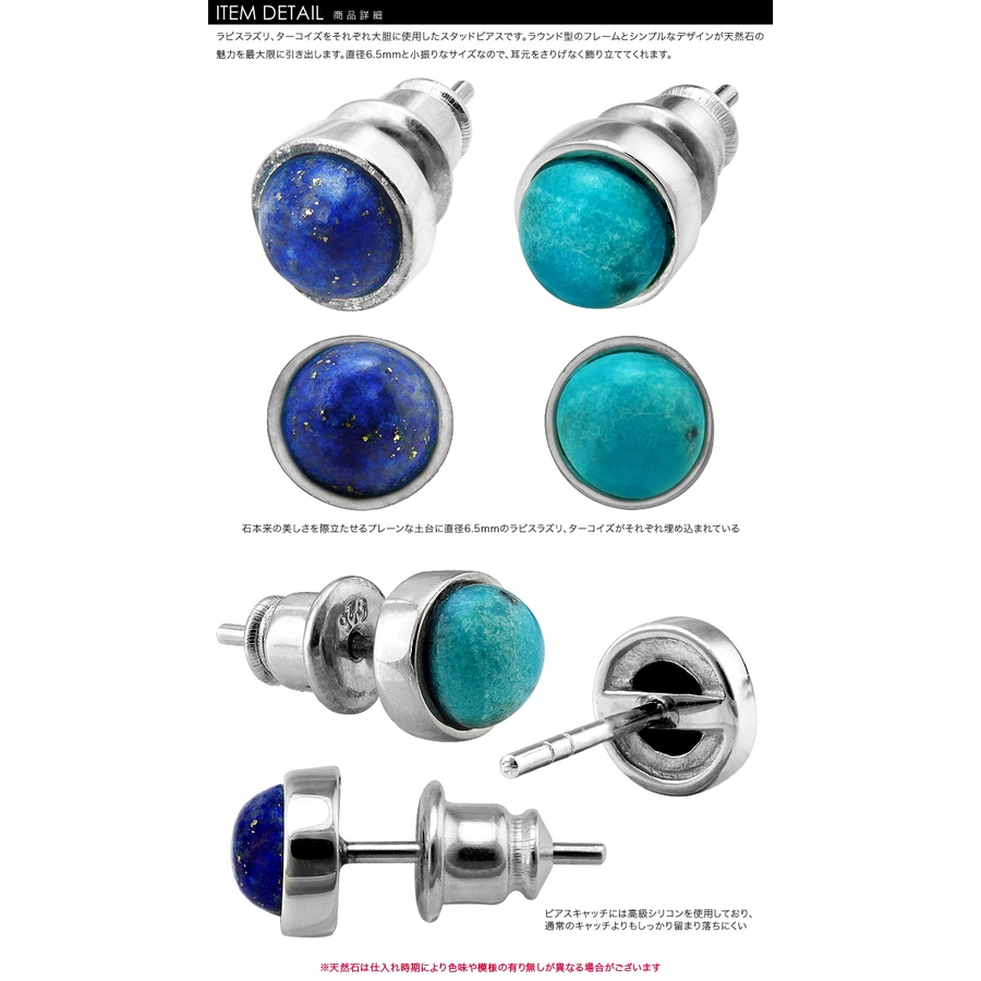 ラピスラズリ、ターコイズをそれぞれ大胆に使用したスタッドピアスです。ラウンド型のフレームとシンプルなデザインが天然石の魅力を最大限に引き出します。直径6.5mmと小振りなサイズなので、耳元をさりげなく飾り立ててくれます。またピアスキャッチには高級シリコンを使用しており、通常のキャッチよりもしっかり留まるようになっています。