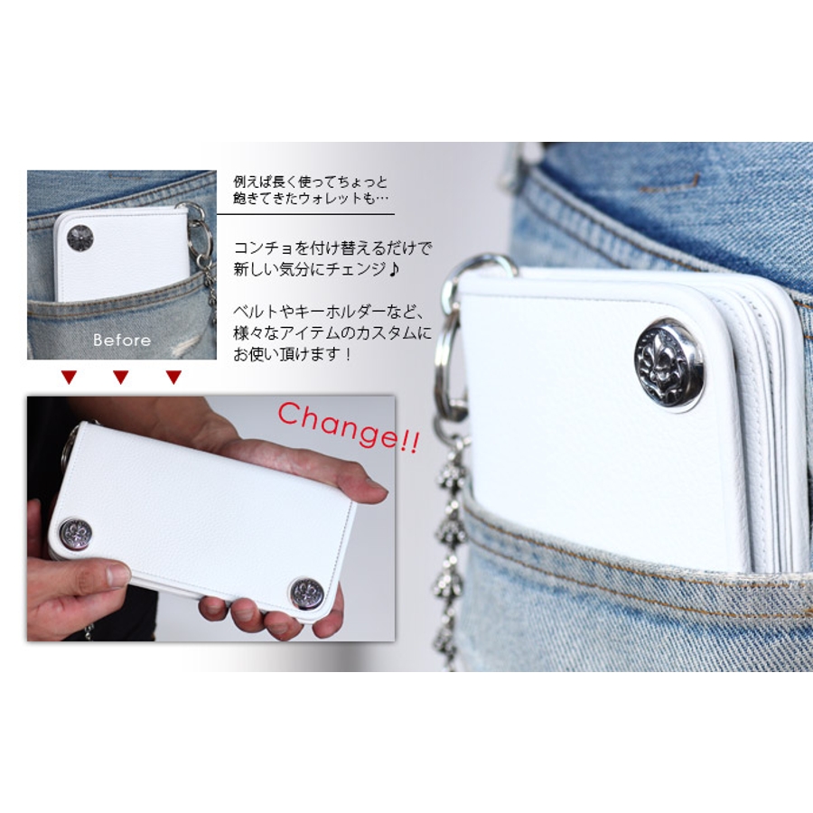 百合の紋章が立体的に浮かび上がる手の込んだ繊細な彫刻は、熟練職人がハンドメイドで丁寧に仕上げた証です。裏はネジ式で、マイナスドライバーなどで簡単に能。手持ちのアイテムに付け替えるだけで、手軽に雰囲気を変えられます。財布やベルトなどの革製品のカスタムにオススメの、高級感ある王道デザインです。
