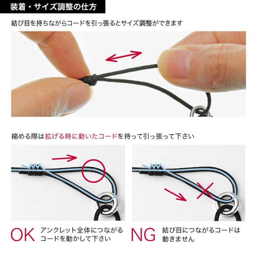 ※アンクレットを縮める際は、広げる際に動いたコードを持って引っ張って下さい