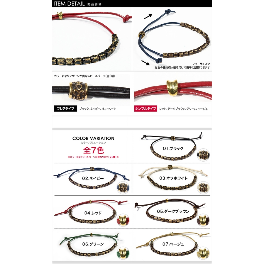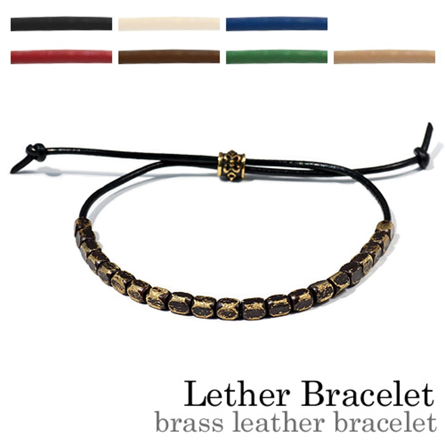 連なったブラス製キュービックビーズが特徴のレザーブレスレット。ブラスのキュービックビーズ一つ一つにヤスリ掛けする事でユーズド感が増し、小慣れた印象に。また、ブレスレットの調節部分についたワンポイントのビーズのデザインがフレアタイプとシンプルタイプの2パターンあり、カラーにより異なります。フレアデザインは(ブラック、オフホワイト、ネイビー)の3色、シンプルデザインは(ダークブラウン、レッド、グリーン、ベージュ)の4色です。フリーサイズなので性別年齢気にせずご使用頂けます。