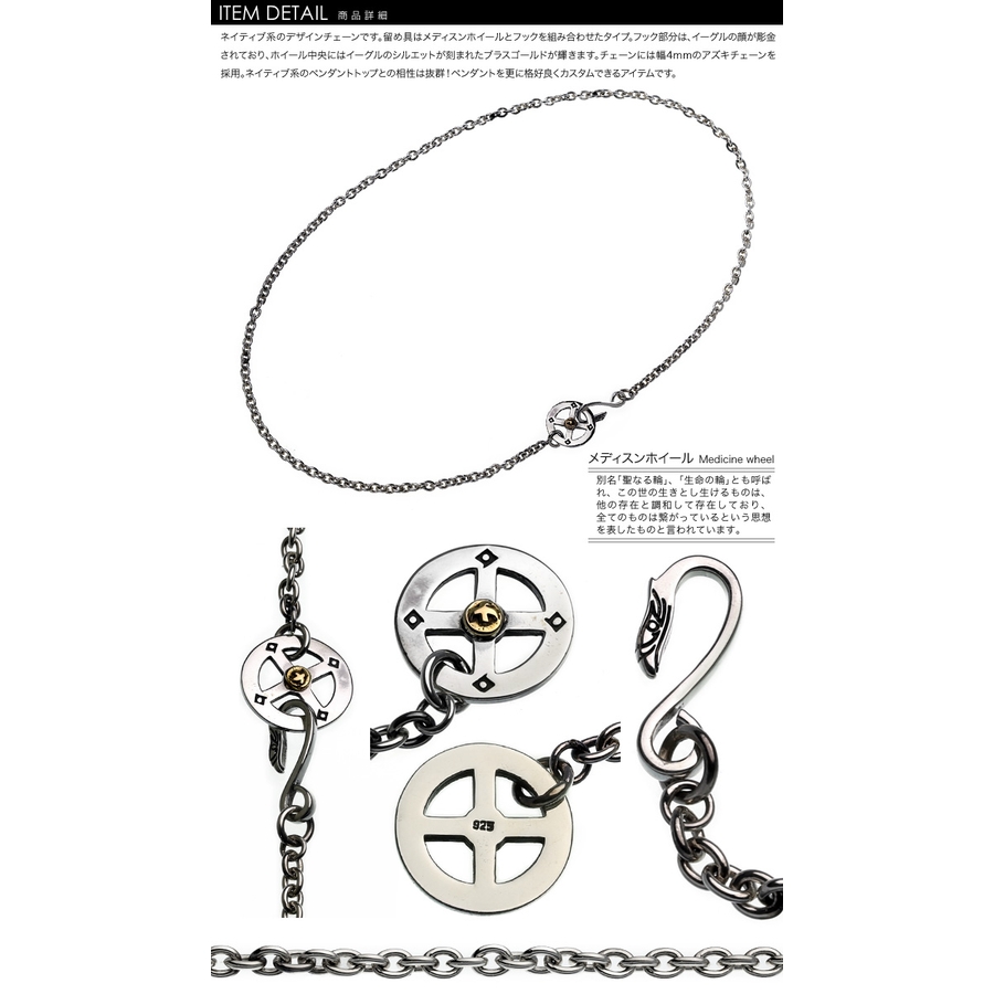 ネイティブ系のデザインチェーンです。留め具はメディスンホイールとフックを組み合わせたタイプ。フック部分は、イーグルの顔が彫金されており、ホイール中央にはイーグルのシルエットが刻まれたブラスゴールドが輝きます。チェーンには幅4mmのアズキチェーンを採用。ネイティブ系のペンダントトップとの相性は抜群!ペンダントを更に格好良くカスタムできるアイテムです。