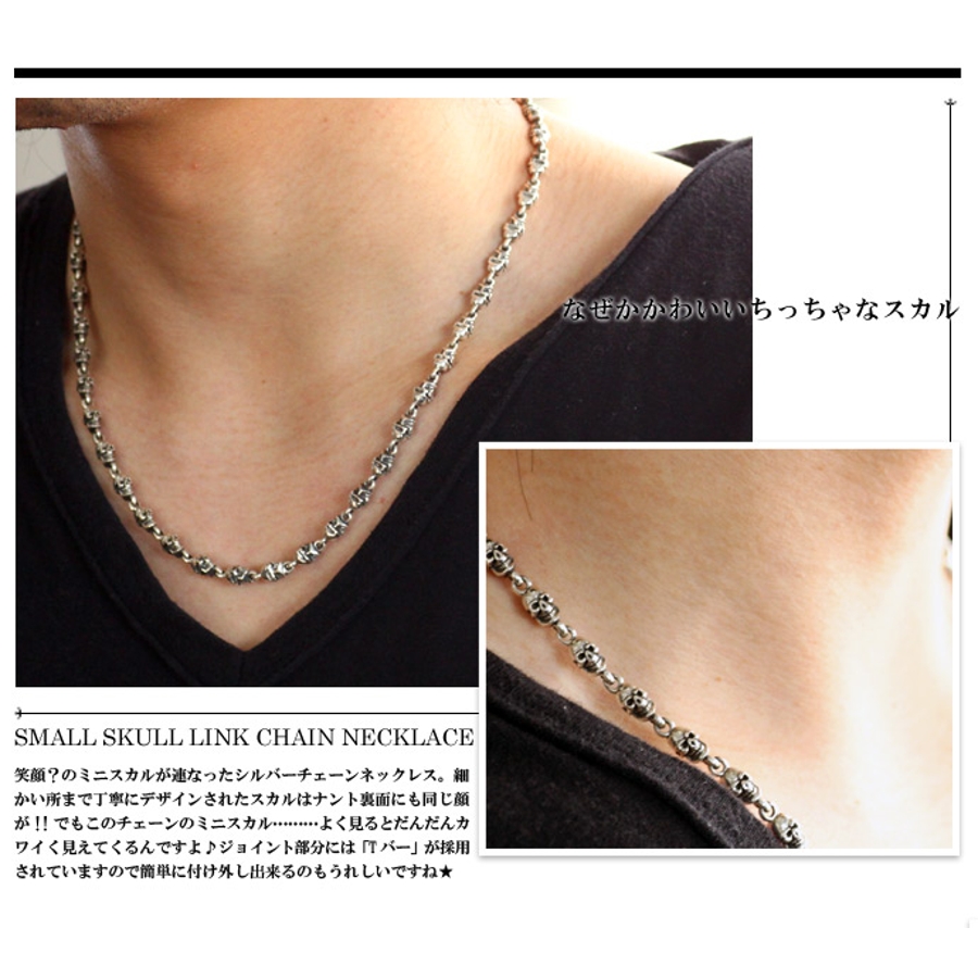 笑顔?のミニスカルが連なったシルバーチェーンネックレス。細かい所まで丁寧にデザインされたスカルはナント裏面にも同じ顔が!!でもこのチェーンのミニスカル………よく見るとだんだんカワイく見えてくるんですよ♪ジョイント部分には「Tバー」が採用されていますので簡単に付け外し出来るのもうれしいですね★