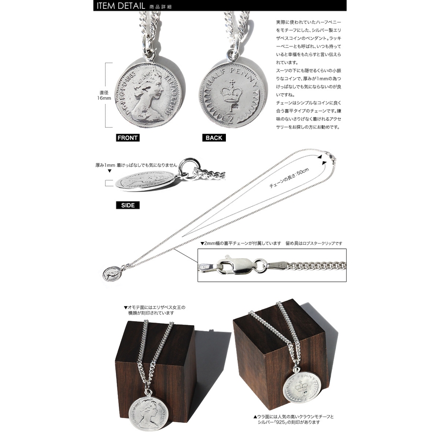 実際に使われていたハーフペニーをモチーフにした、シルバー製エリザベスコインのペンダント。ラッキーペニーとも呼ばれ、いつも持っていると幸福をもたらすと言い伝えられています。スーツの下にも隠せるくらいの小振りなコインで、厚みが1mmの為つけっぱなしに出来るのも良いですね。チェーンはシンプルなコインに良く合う喜平タイプのチェーンです。嫌味のないさりげなく着けれるアクセサリーをお探しの方にお勧めです。