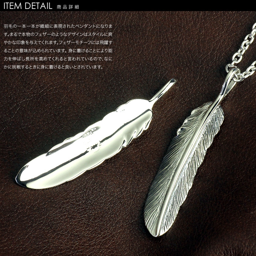 羽毛の一本一本が繊細に表現されたペンダントになります。まるで本物のフェザーのようなデザインはスタイルに爽やかな印象を与えてくれます。フェザーモチーフには飛躍することの意味が込められています。身に着けることにより能力を伸ばし長所を高めてくれると言われているので、なにかに挑戦するときに身に着けると良いとされています。