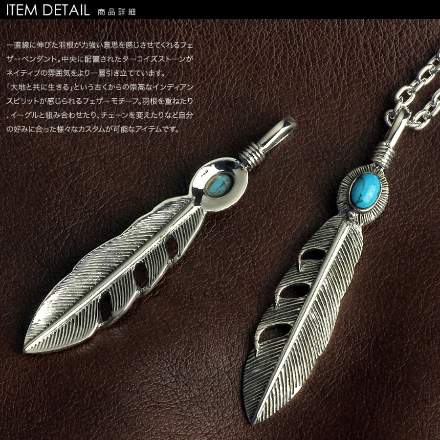 一直線に伸びた羽根が力強い意思を感じさせてくれるフェザーペンダント。中央に配置されたターコイズストーンがネイティブの雰囲気をより一層引き立てています。「大地と共に生きる」という古くからの崇高なインディアンスピリットが感じられるフェザーモチーフ。羽根を重ねたり、イーグルと組み合わせたり、チェーンを変えたりなど自分の好みに合った様々なカスタムが可能なアイテムです。